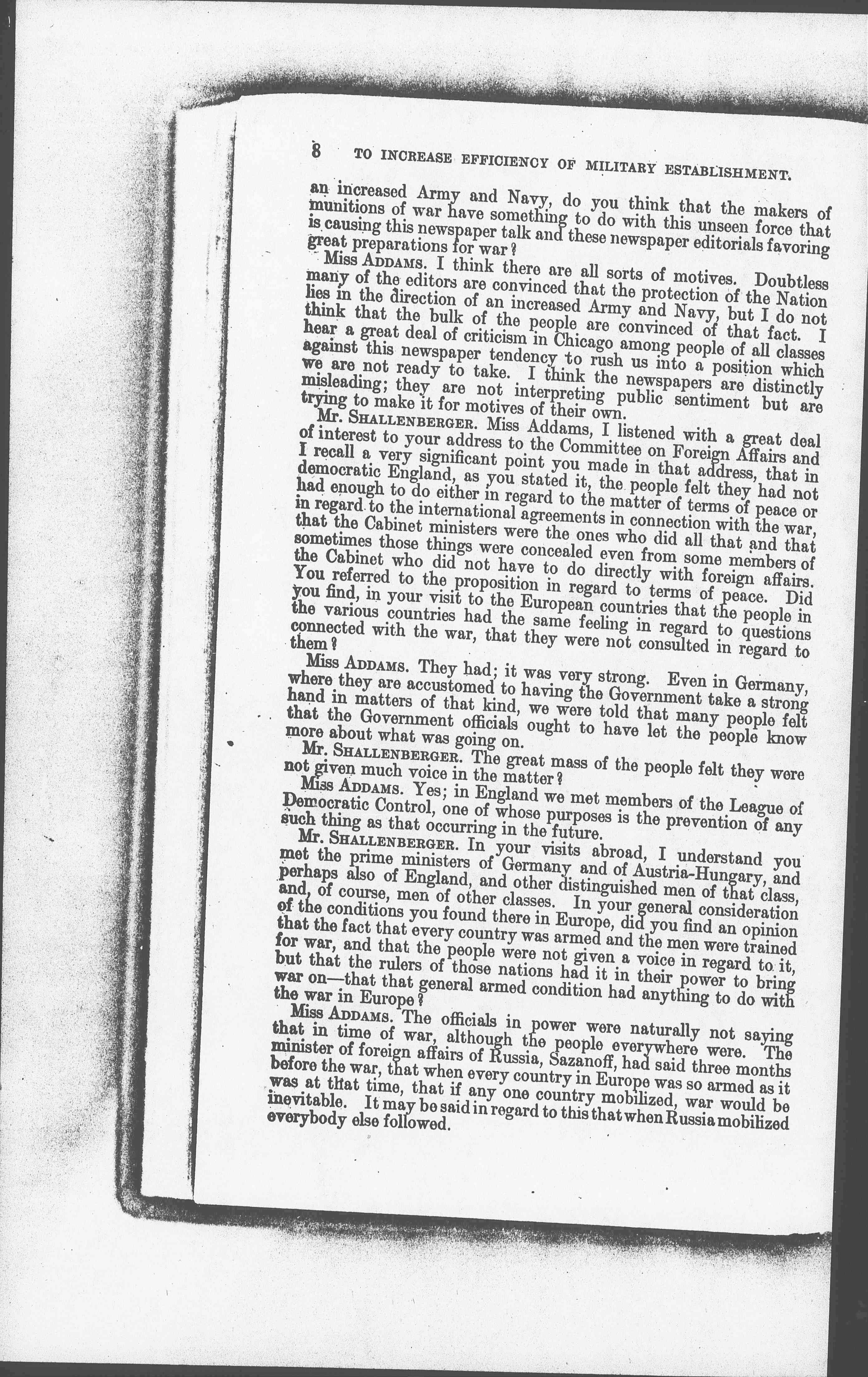 Mr. SHALLENBERGER. Miss Addams, I listened with a great deal of interest to your address to the Committee on Foreign Affairs and I recall a very significant point you made in that address, that in democratic England, as you stated it, the people felt they had not had enough to do either in regard to the matter of terms of peace or in regard to the international agreements in connection with the war, that the Cabinet ministers were the ones who did all that and that sometimes those things were concealed even from some members of the Cabinet who did not have to do directly with foreign affairs. You referred to the proposition in regard to terms of peace. Did you find, in your visit to the European countries that the people in the various countries had the same feeling in regard to questions connected with the war, that they were not consulted in regard to them?