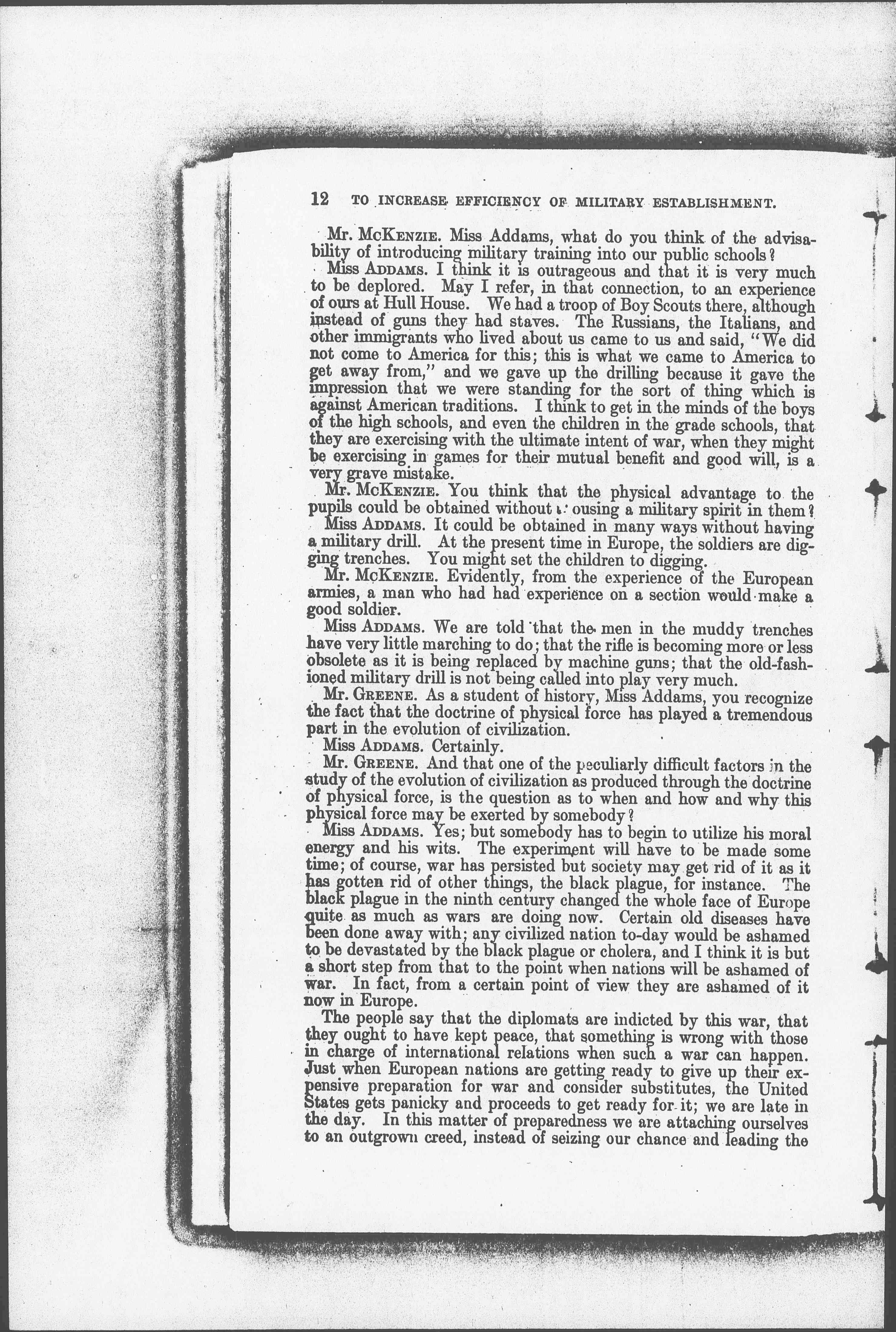 Mr. MCKENZIE. Miss Addams, what do you think of the advisability of introducing military training into our public schools?
