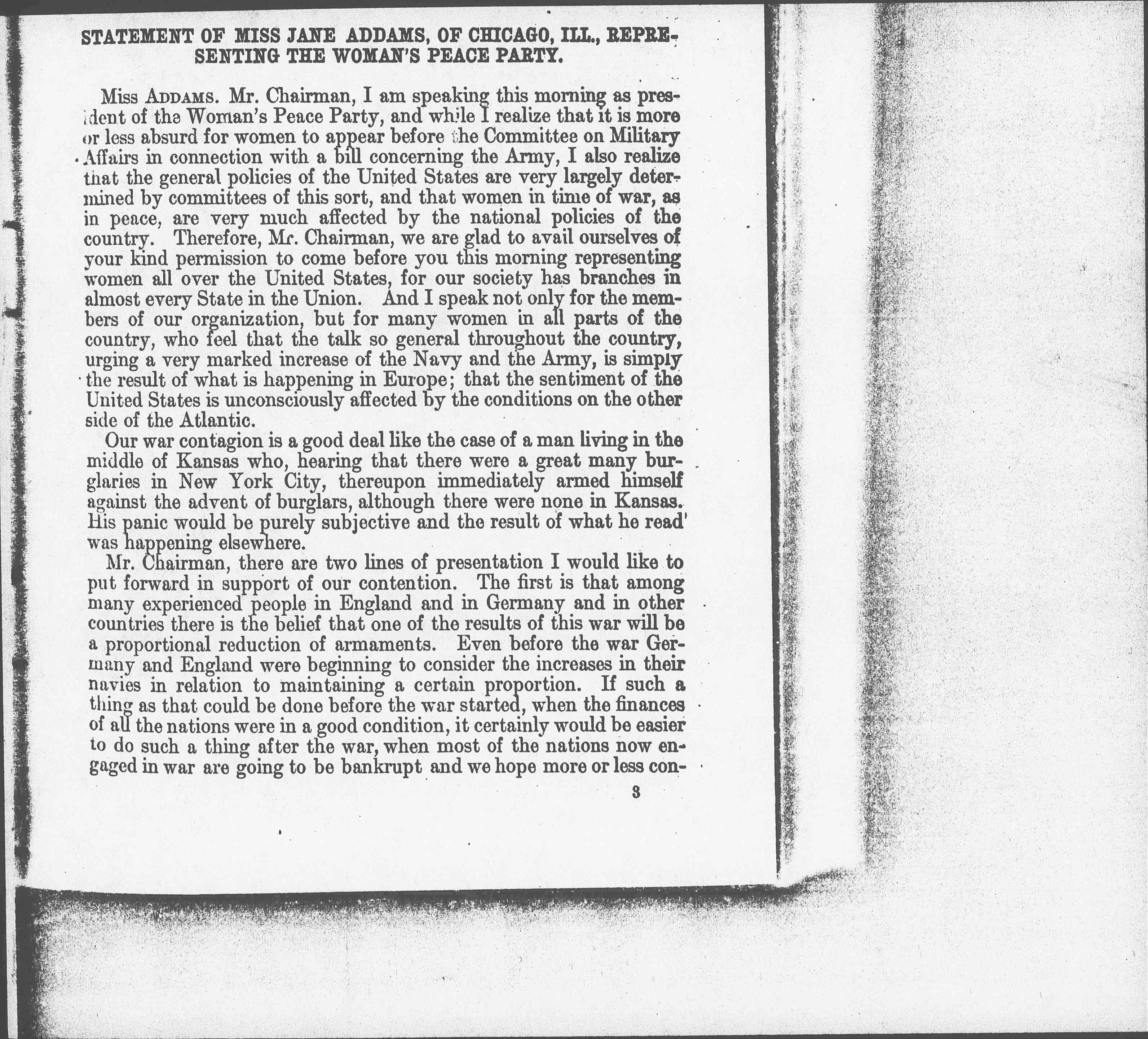 Miss ADDAMS. Mr. Chairman, I am speaking this morning as president of the Woman's Peace Party, and while I realize that it is more or less absurd for women to appear before the Committee on Military Affairs in connection with a bill concerning the Army, I also realize that the general policies of the United States are very largely determined by committees of this sort, and that women in time of war, as in peace, are very much affected by the national policies of the country. Therefore, Mr. Chairman, we are glad to avail ourselves of your kind permission to come before you this morning representing women all over the United States, for our society has branches in almost every State in the Union. And I speak not only for the members of our organization, but for many women in all parts of the country, who feel that the talk so general throughout the country, urging a very marked increase of the Navy and the Army, is simply the result of what is happening in Europe; that the sentiment of the United States is unconsciously affected by the conditions on the other side of the Atlantic.