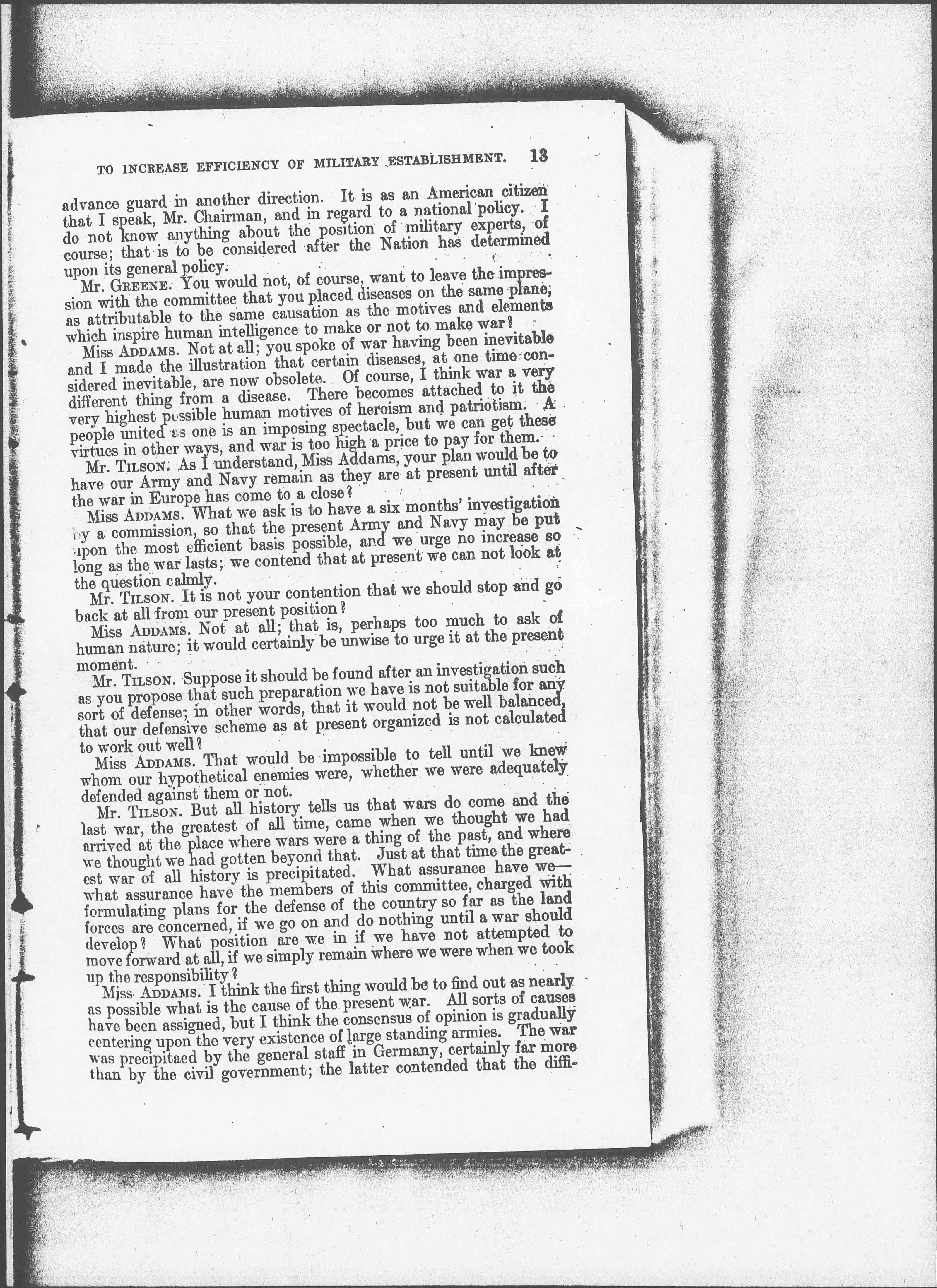 Miss ADDAMS. I think the first thing would be to find out as nearly as possible what is the cause of the present war. All sorts of causes have been assigned, but I think the consensus of opinion is gradually centering upon the very existence of large standing armies. The war was precipitated by the general staff in Germany, certainly far more than by the civil government; the latter contended that the difficulties [page 12] might have been adjudicated. Certainly the lesson of this war is not that large precipitation prevents war.