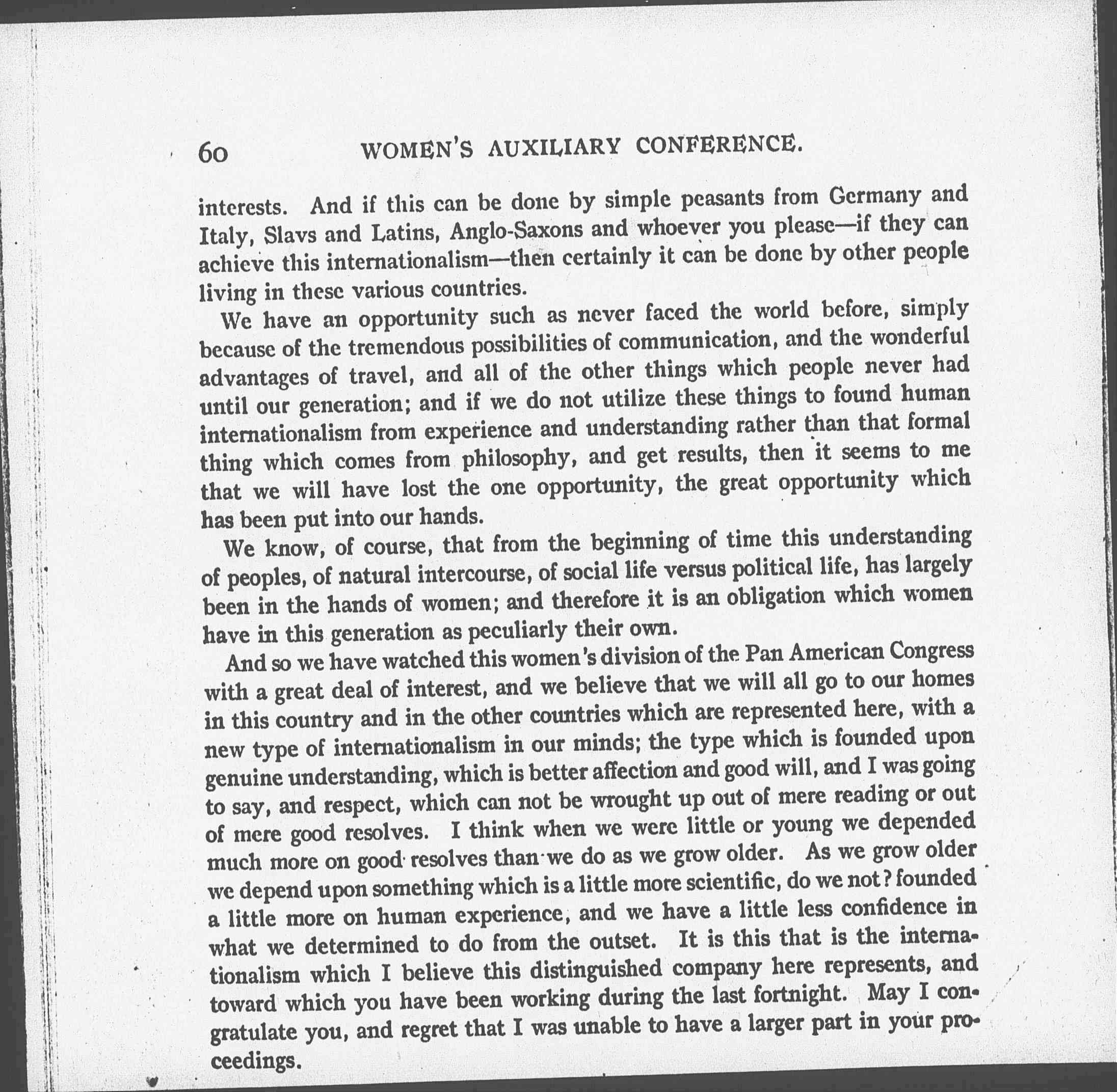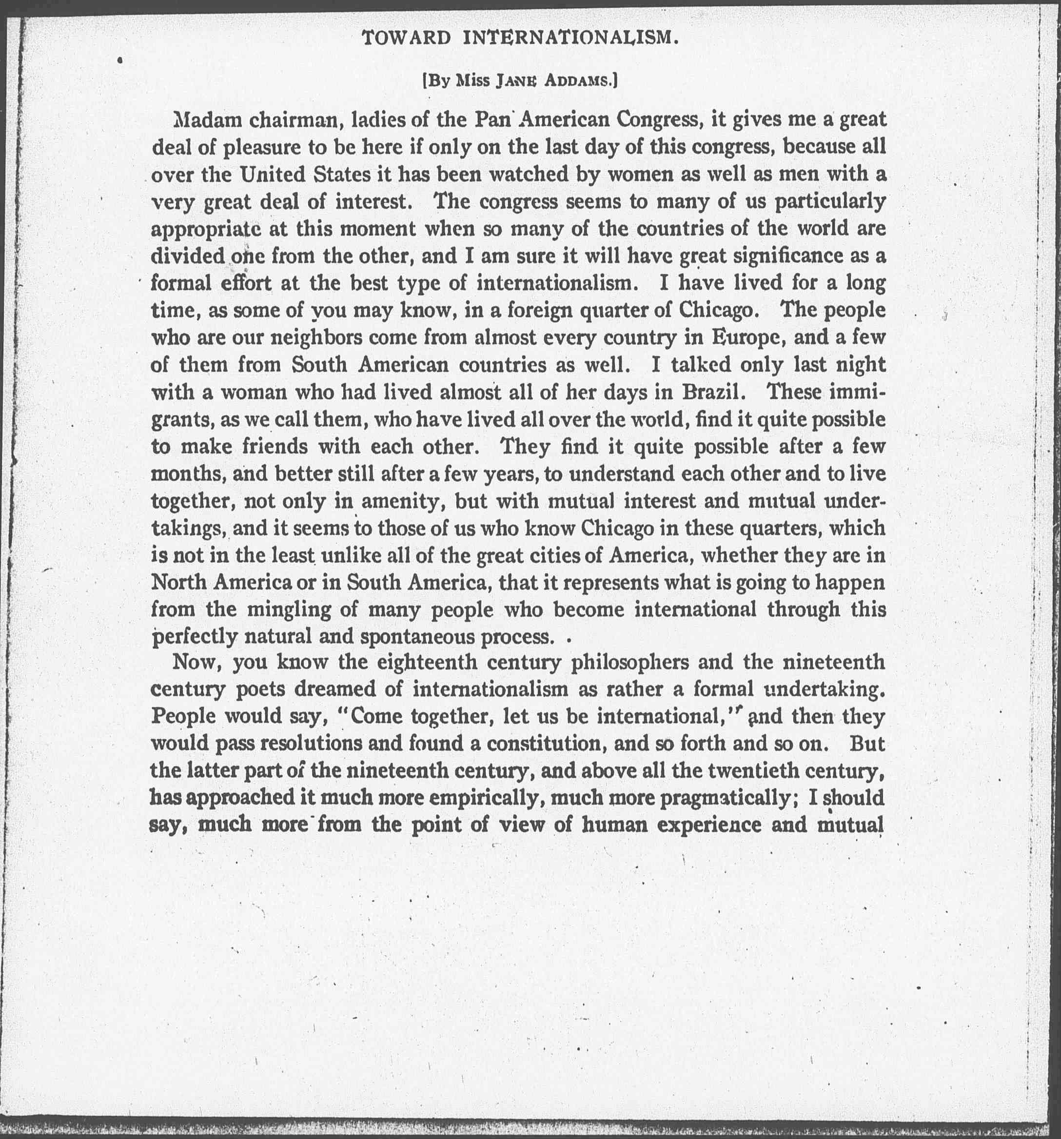 Madam chairman, ladies of the Pan American Congress, it gives me a great deal of pleasure to be here if only on the last day of this congress, because all over the United States it has been watched by women as well as men with a very great deal of interest. The congress seems to many of us particularly appropriate at this moment when so many of the countries of the world are divided one from the other, and I am sure it will have great significance as a formal effort at the best type of internationalism. I have lived for a long time, as some of you may know, in a foreign quarter of Chicago. The people who are our neighbors come from almost every country in Europe, and a few of them from South American countries as well. I talked only last night with a woman who had lived almost all of her days in Brazil. These immigrants, as we call them, who have lived all over the world, find it quite possible to make friends with each other. They find it quite possible after a few months, and better still after a few years, to understand each other and to live together, not only in amenity, but with mutual interest and mutual undertakings, and it seems to those of us who know Chicago in these quarters, which is not in the least unlike all of the great cities of America, whether they are in North America or in South America, that it represents what is going to happen from the mingling of many people who become international through this perfectly natural and spontaneous process.