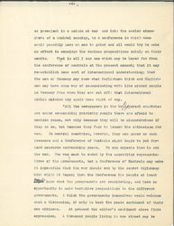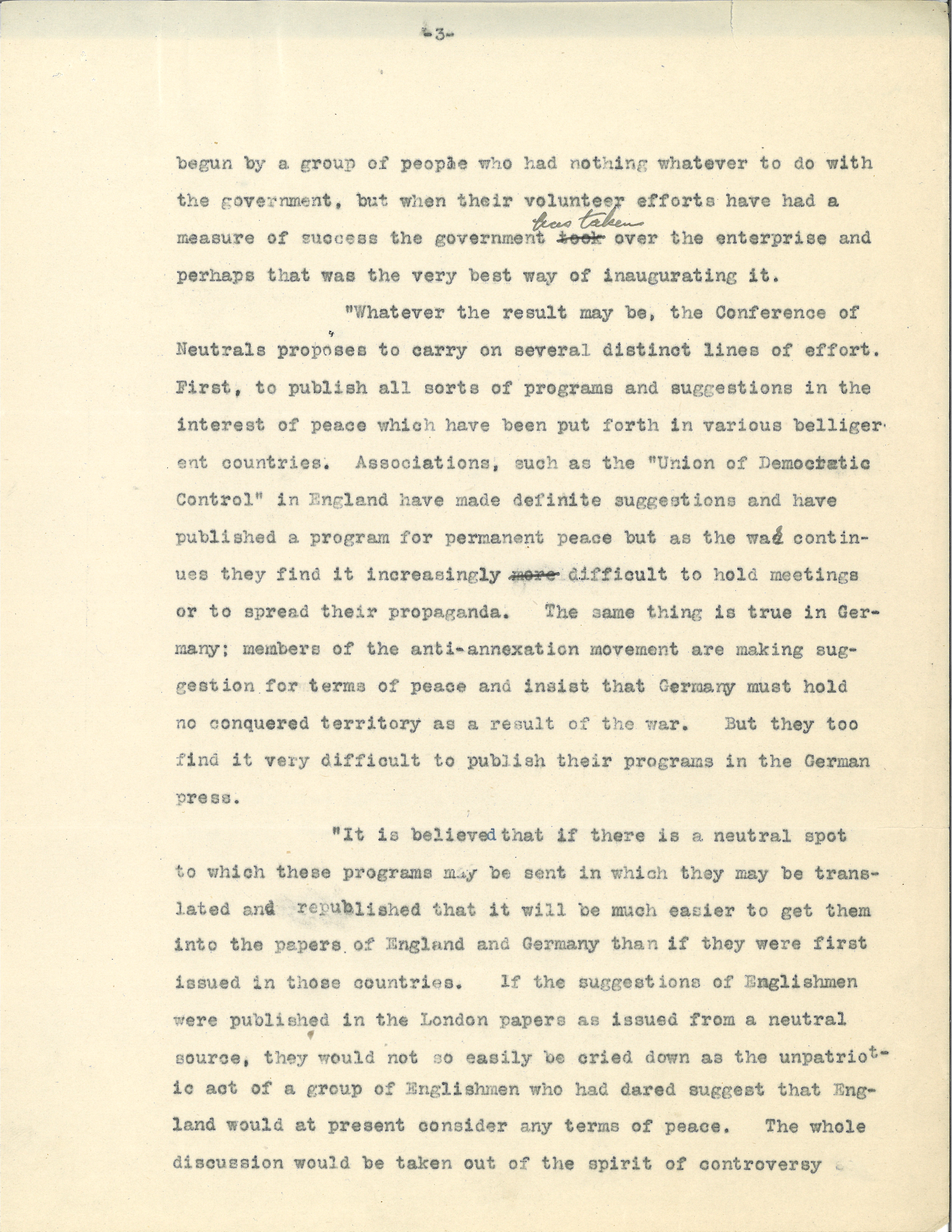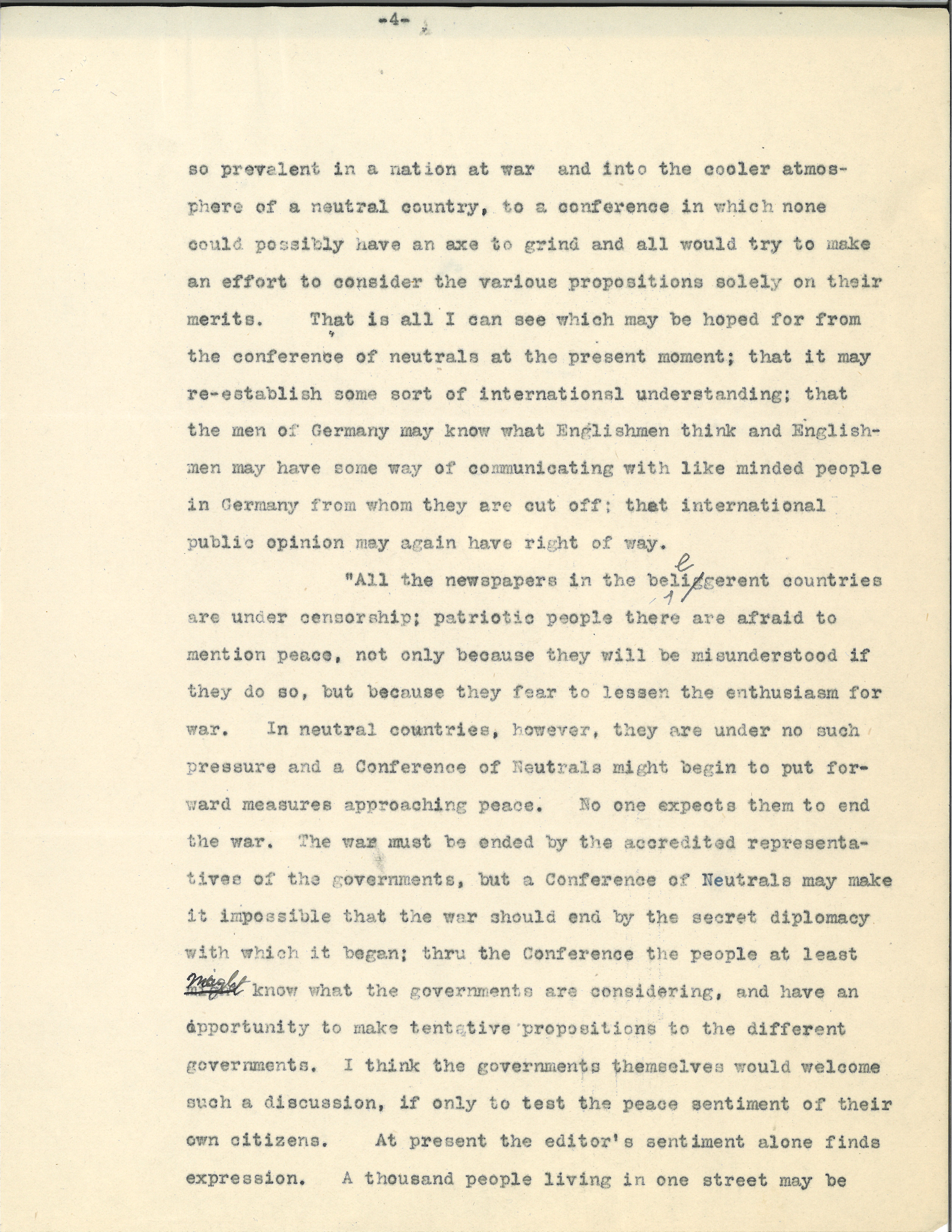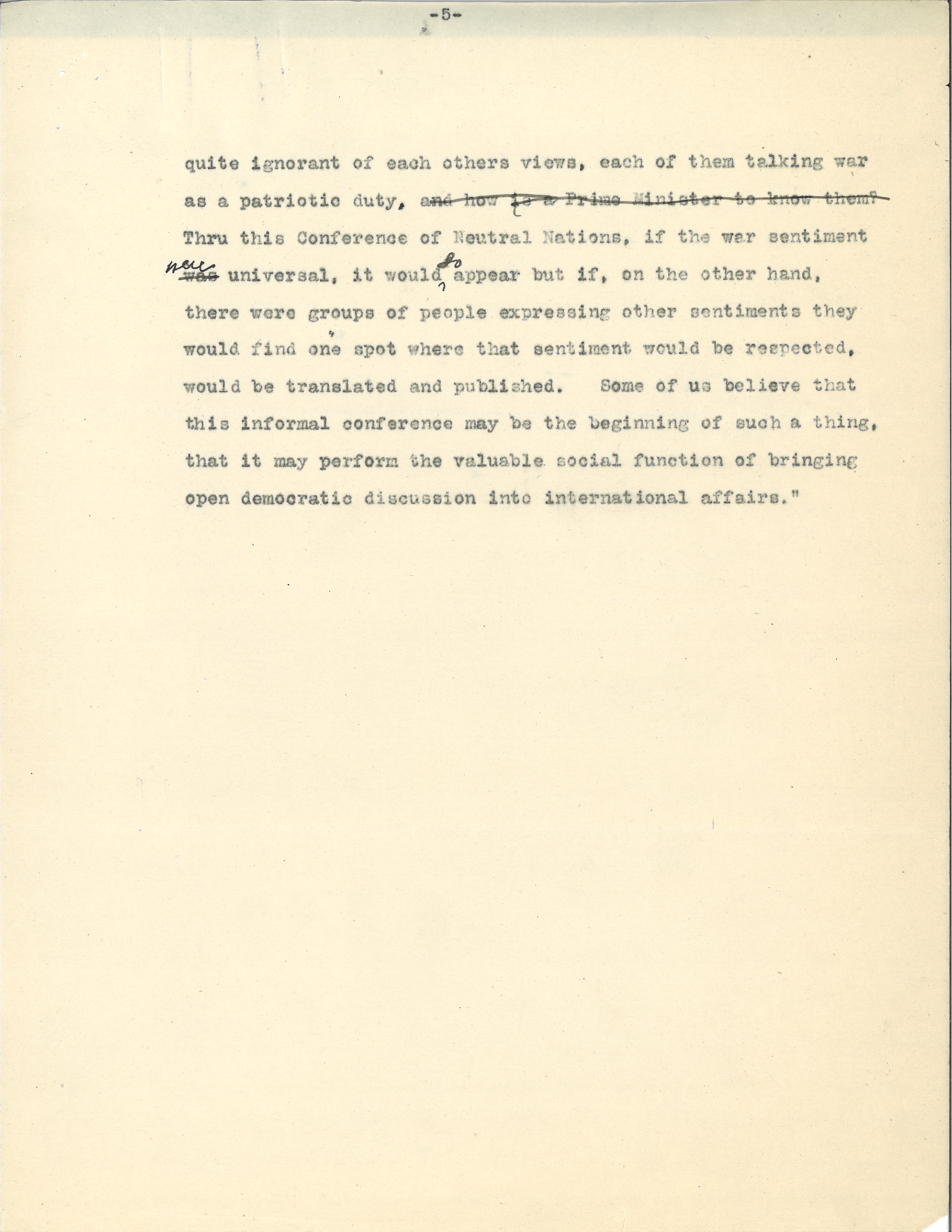 "All the newspapers in the belligerent countries are under censorship; patriotic people there are afraid to mention peace, not only because they will be misunderstood if they do so, but because they fear to lessen the enthusiasm for war. In neutral countries, however, they are under no such pressure and a Conference of Neutrals might begin to put forward measures approaching peace. No one expects them to end the war. The war must be ended by the accredited representatives of the governments, but a Conference of Neutrals may make it impossible that the war should end by the secret diplomacy with which it began; [through] the Conference the people at least might ↑might↓ know what the governments are considering, and have an opportunity to make tentative propositions to the different governments. I think the governments themselves would welcome such a discussion, if only to test the peace sentiment of their own citizens. At present the editor's sentiment alone finds expression. A thousand people living in one street may be [page 5] quite ignorant of each others views, each of them talking war as a patriotic duty. and how is a Prime Minister to know them? [Through] this Conference of Neutral Nations, if the war sentiment was ↑were↓ universal, it would ↑so↓ appear but if, on the other hand, there were groups of people expressing other sentiments they would find one spot where that sentiment would be respected, would be translated and published. Some of us believe that this informal conference may be the beginning of such a thing, that it may perform the valuable social function of bringing open democratic discussion into international affairs."
