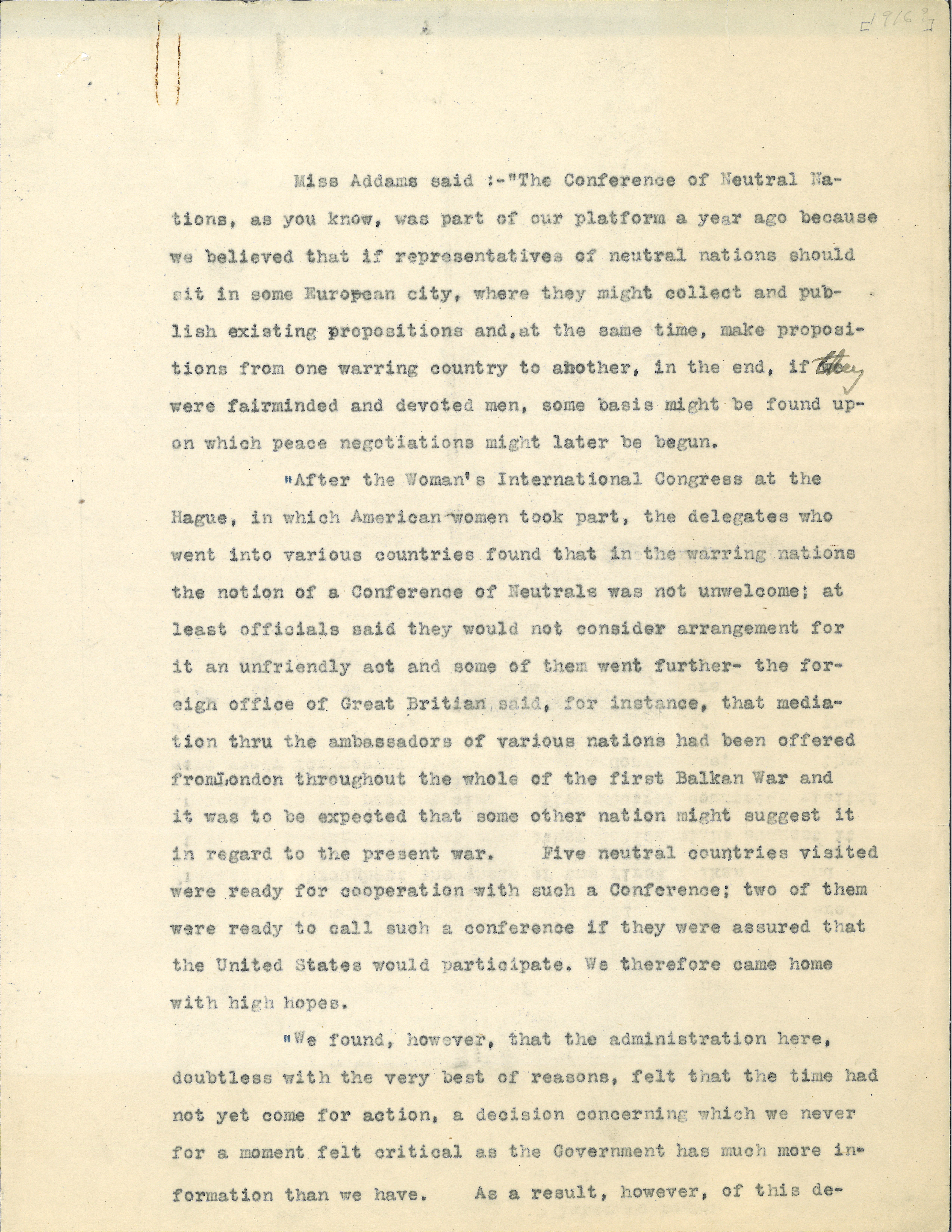 "After the Woman's International Congress at The Hague, in which American women took part, the delegates who went into various countries found that in the warring nations the notion of a Conference of Neutrals was not unwelcome; at least officials said they would not consider arrangement for it an unfriendly act and some of them went further -- the foreign office of Great Britain said, for instance, that mediation [through] the ambassadors of various nations had been offered from London throughout the whole of the first Balkan War and it was to be expected that some other nation might suggest it in regard to the present war. Five neutral countries visited were ready for cooperation with such a Conference; two of them were ready to call such a conference if they were assured that the United States would participate. We therefore came home with high hopes.