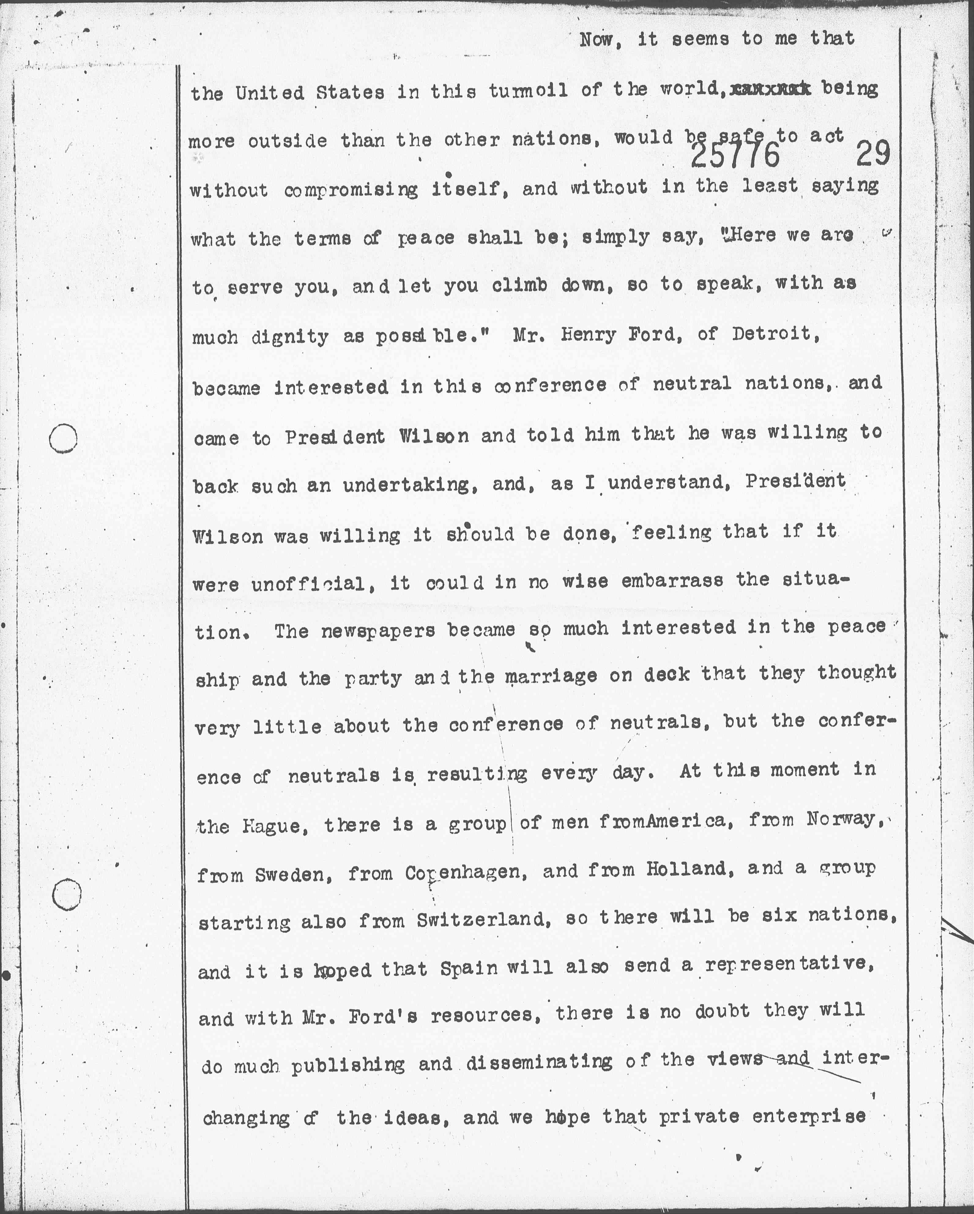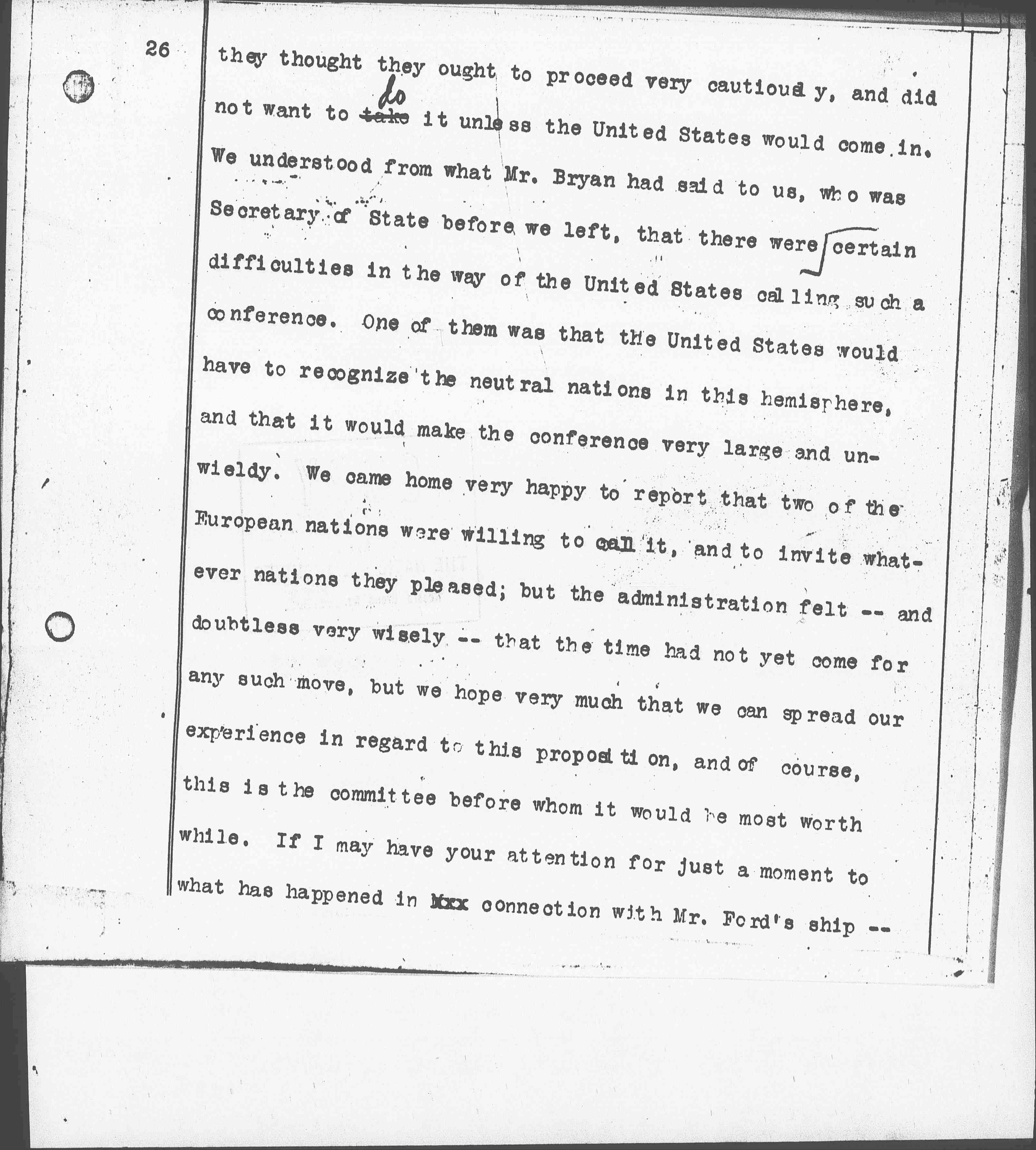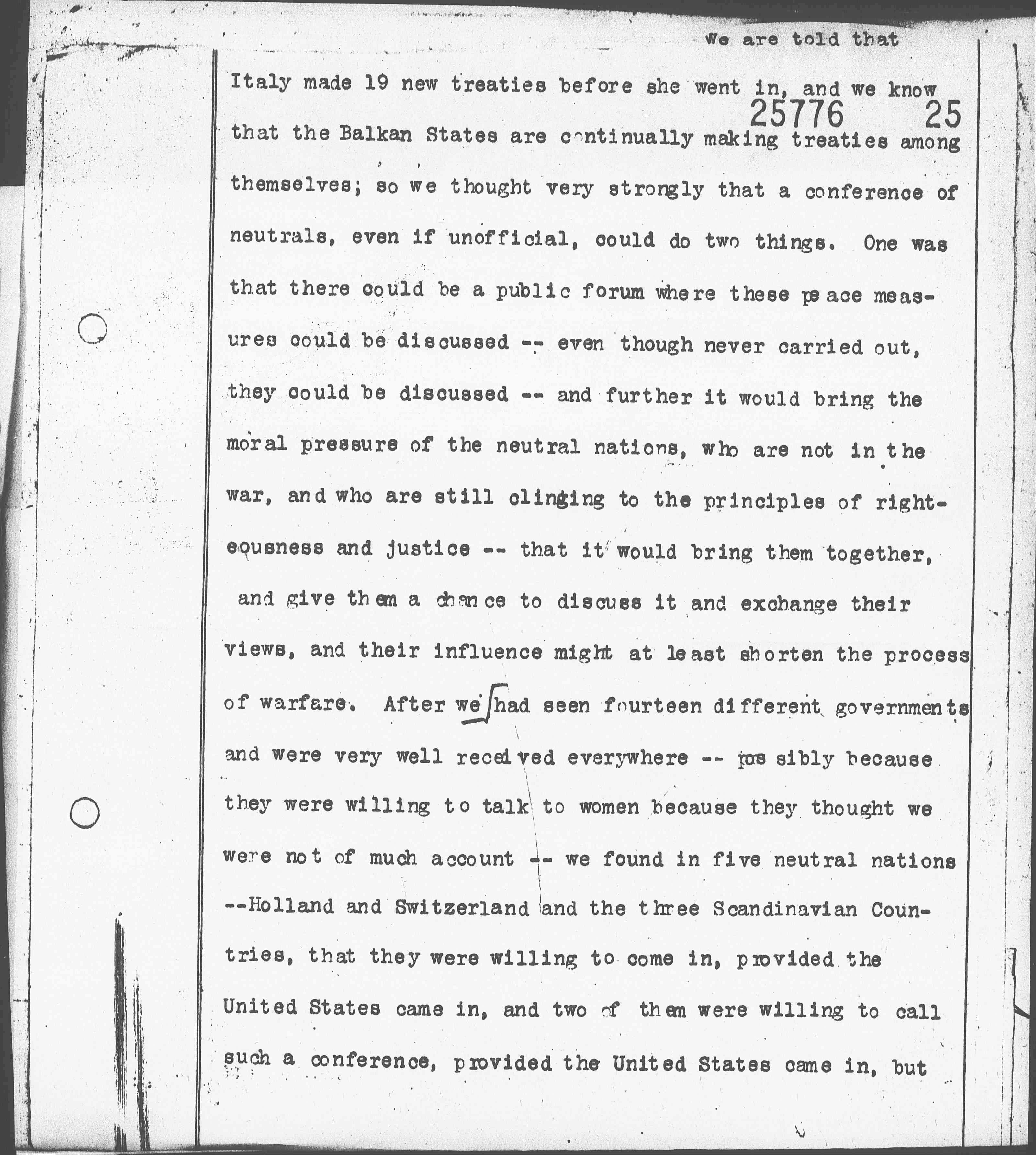 We are told that Italy made 19 new treaties before she went in, and we know that the Balkan States are continually making treaties among themselves; so we thought very strongly that a conference of neutrals, even if unofficial, could do two things. One was that there could be a public forum where these peace measures could be discussed -- even though never carried out, they could be discussed -- and further it would bring the moral pressure of the neutral nations, who are not in the war, and who are still clinging to the principles of righteousness and justice -- that it would bring them together, and give them a chance to discuss it and exchange their views, and their influence might at least shorten the process of warfare. After we had seen fourteen different governments and were very well received everywhere -- possibly because they were willing to talk to women because they thought we were not of much account -- we found in five neutral nations -- Holland and Switzerland and the three Scandinavian Countries, that they were willing to come in, provided the United States came in, and two of them were willing to call such a conference, provided the United States came in, but [page 29] they thought they ought to proceed very cautiously, and did not want to take ↑do↓ it unless the United States would come in. We understood from what Mr. Bryan had said to us, who was Secretary of State before we left, that there were certain difficulties in the way of the United States calling such a conference. One of them was that the United States would have to recognize the neutral nations in this hemisphere, and that it would make the conference very large and unwieldy. We came home very happy to report that two of the European nations were willing to call it, and to invite whatever nations they pleased; but the administration felt -- and doubtless very wisely -- that the time had not yet come for any such move, but we hope very much that we can spread our experience in regard to this proposition, and of course, this is the committee before whom it would be most [worthwhile]. If I may have your attention for just a moment to what has happened in [illegible] connection with Mr. Ford's ship -- [page 30]
