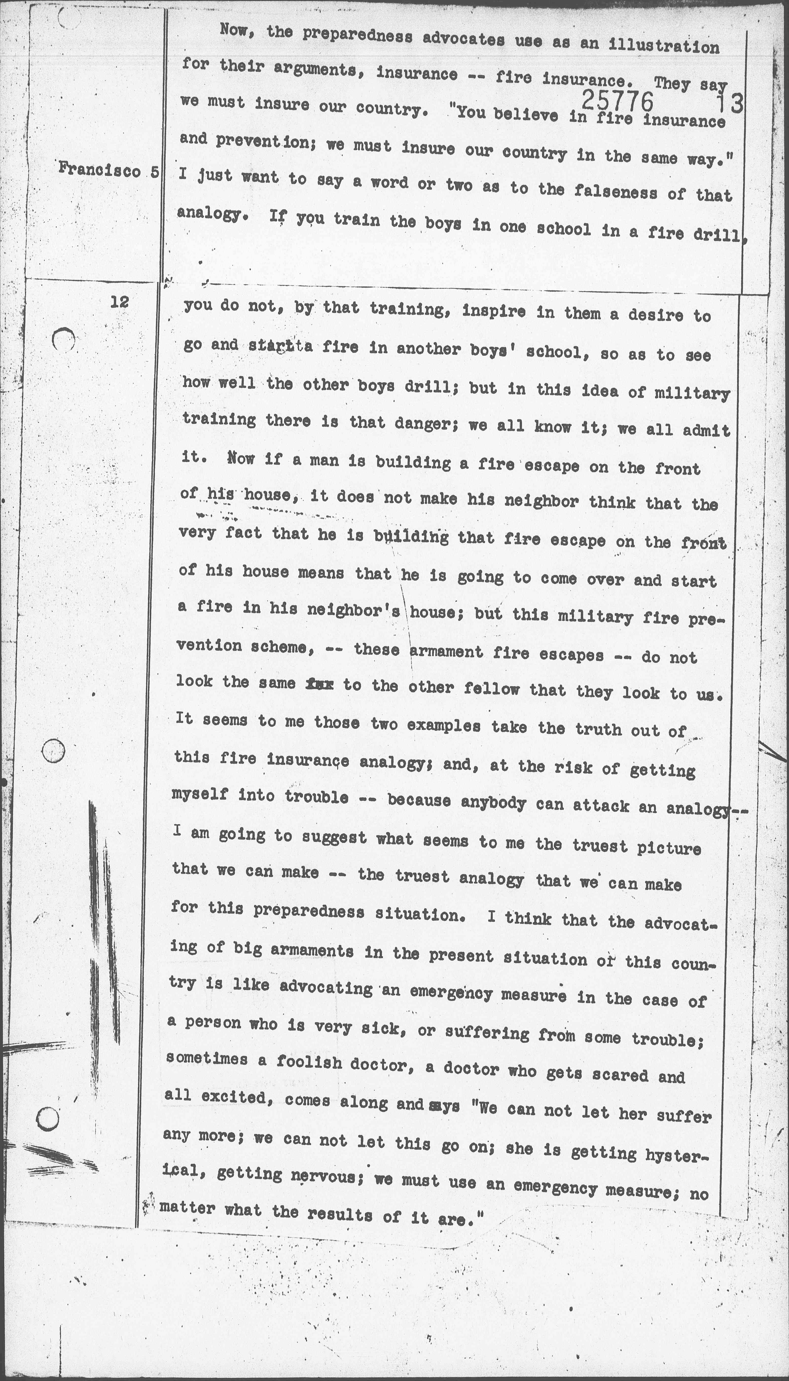 Now, the preparedness advocates use as an illustration for their arguments, insurance -- fire insurance. They say we must insure our country. “You believe in fire insurance and prevention; we must insure our country in the same way.” I just want to say a word or two as to the falseness of that analogy. If you train the boys in one school in a fire drill, you do not, by that training, inspire in them a desire to go and start a fire in another boys’ school, so as to see how well the other boys drill; but in this idea of military training there is that danger; we all know it; we all admit it. Now if a man is building a fire escape on the front of his house, it does not make his neighbor think that the very fact that he is building that fire escape on the front of his house means that he is going to come over and start a fire in his neighbor’s house; but this military fire prevention scheme, -- these armament fire escapes -- do not look the same [illegible] to the other fellow that they look to us. It seems to me those two examples take the truth out of this fire insurance analogy; and, at the risk of getting myself into trouble -- because anybody can attack an analogy -- I am going to suggest what seems to me the truest picture that we can make -- the truest analogy that we can make for this preparedness situation. I think that the advocating of big armaments in the present situation of this country is like advocating an emergency measure in the case of a person who is very sick, or suffering from some trouble; sometimes a foolish doctor, a doctor who gets scared and all excited, comes along and says “We can not let her suffer any more; we can not let this go on; she is getting hysterical, getting nervous; we must use an emergency measure; no matter what the results of it are.” [page 15]