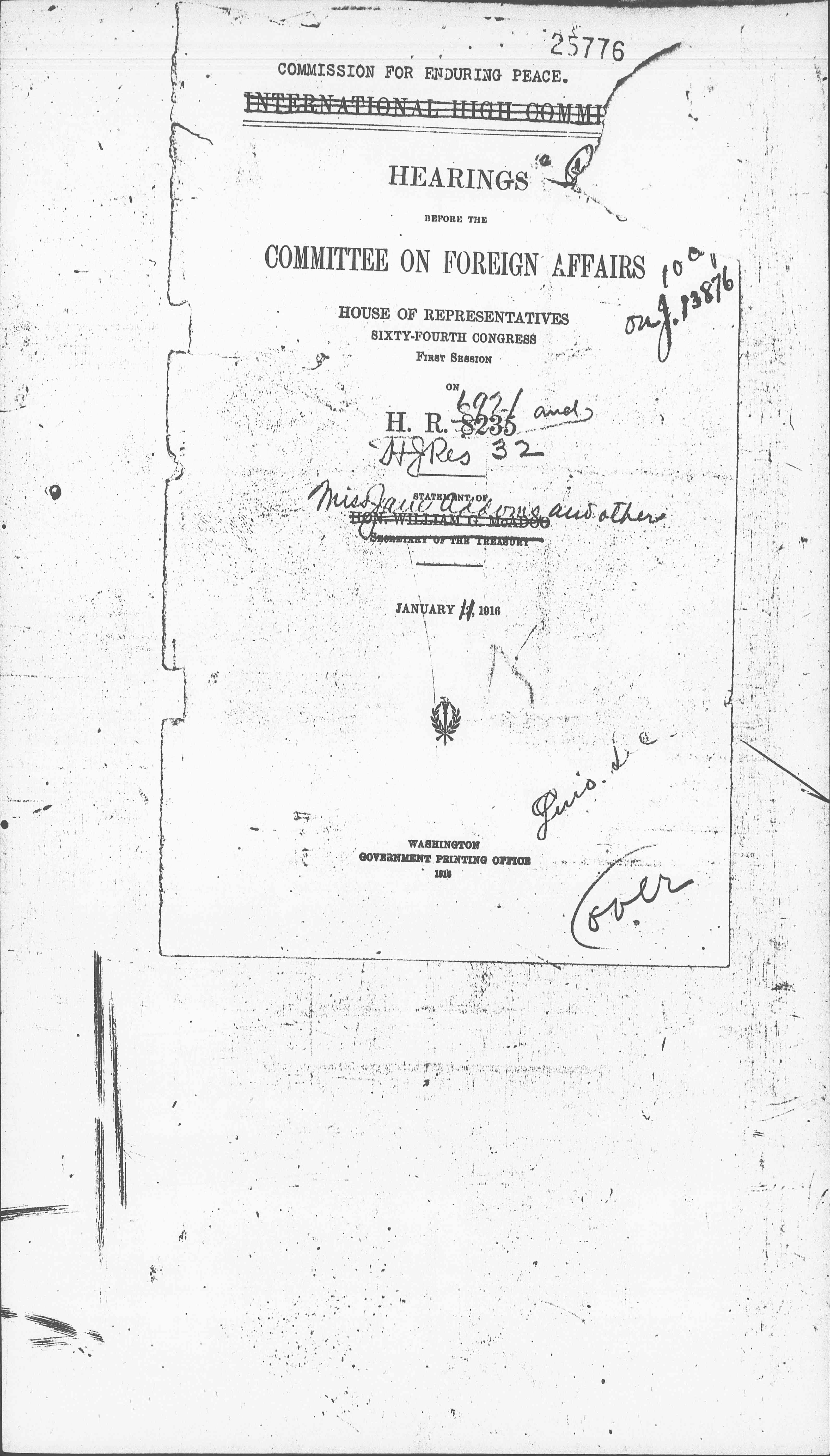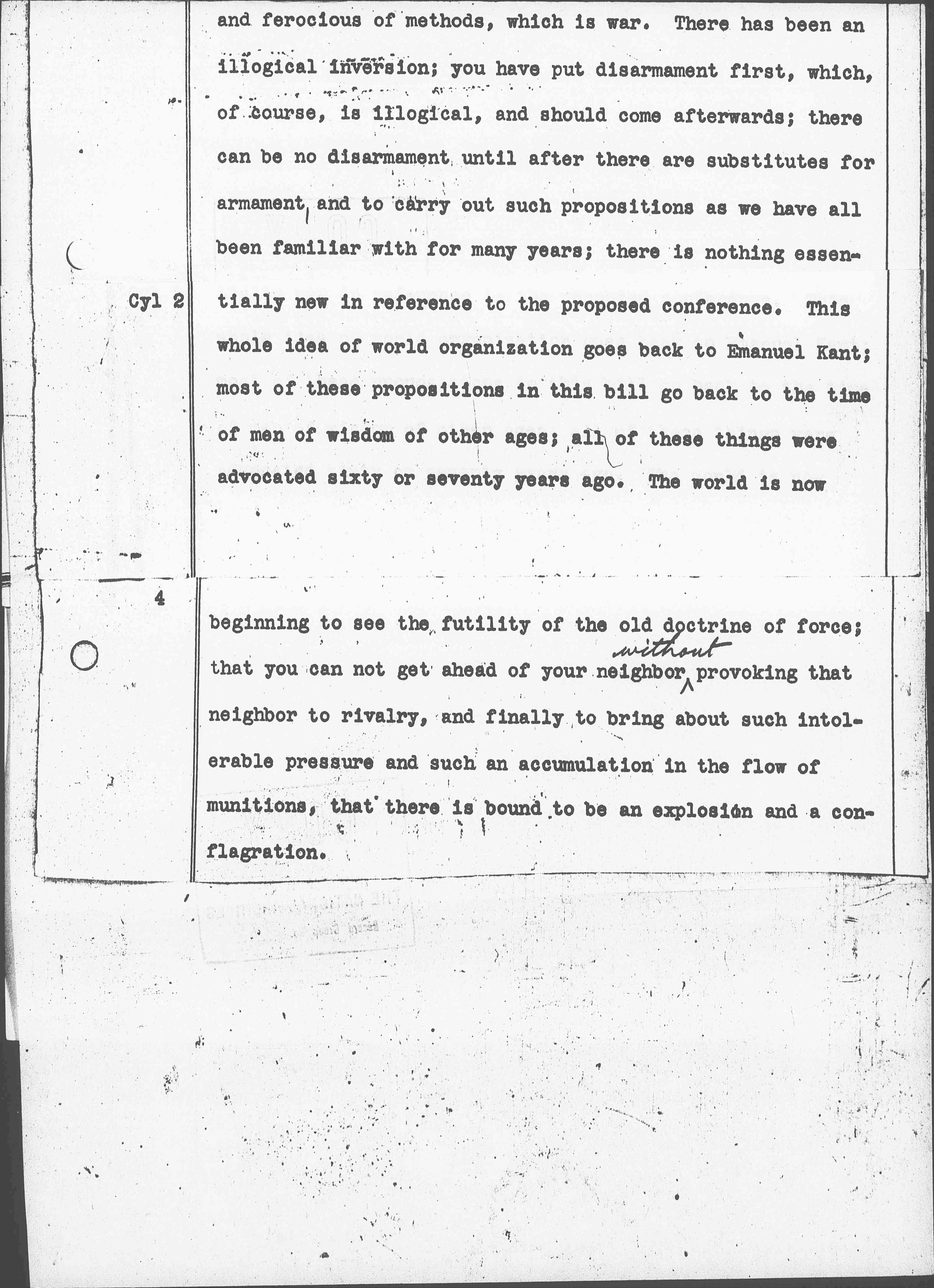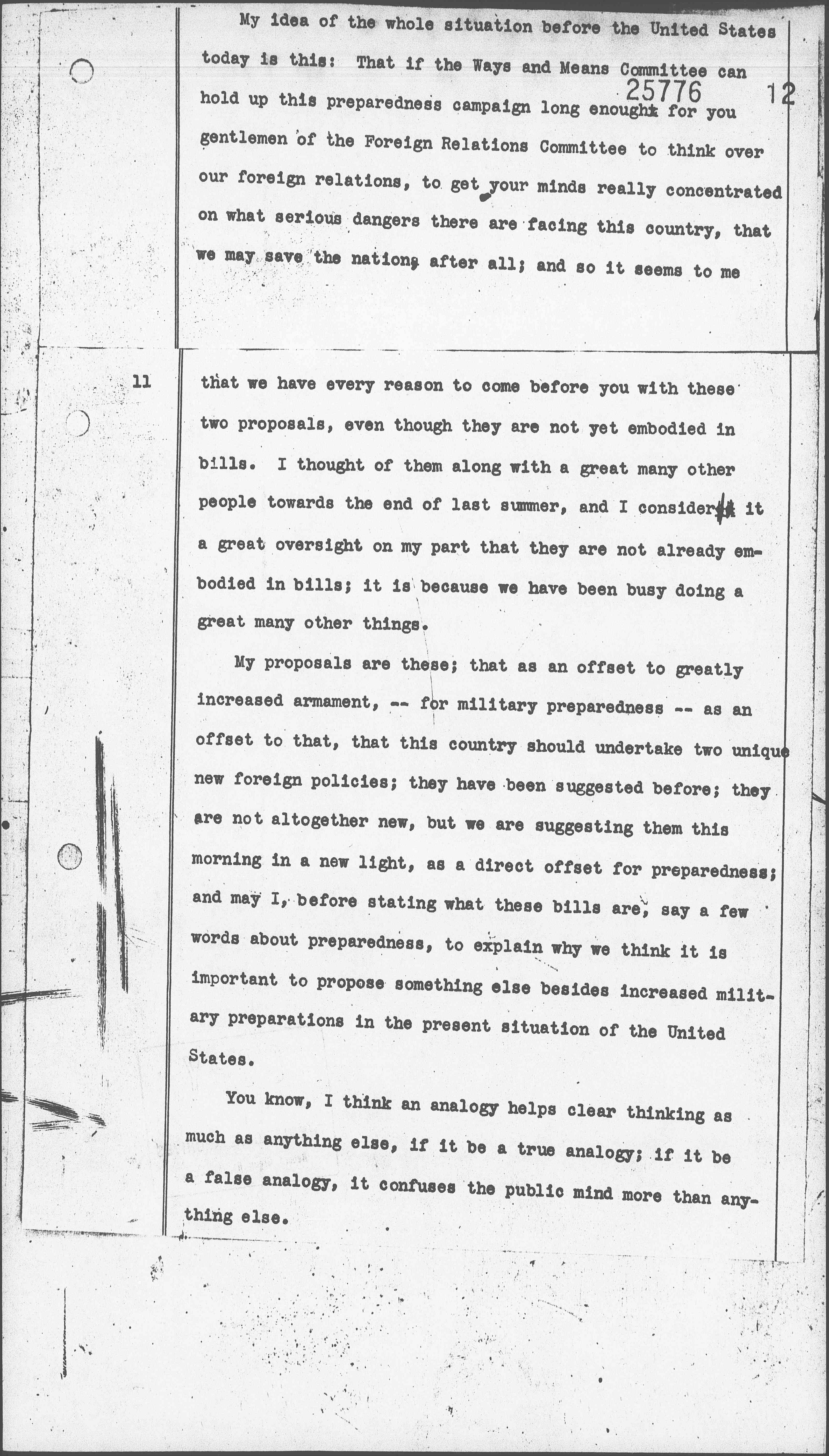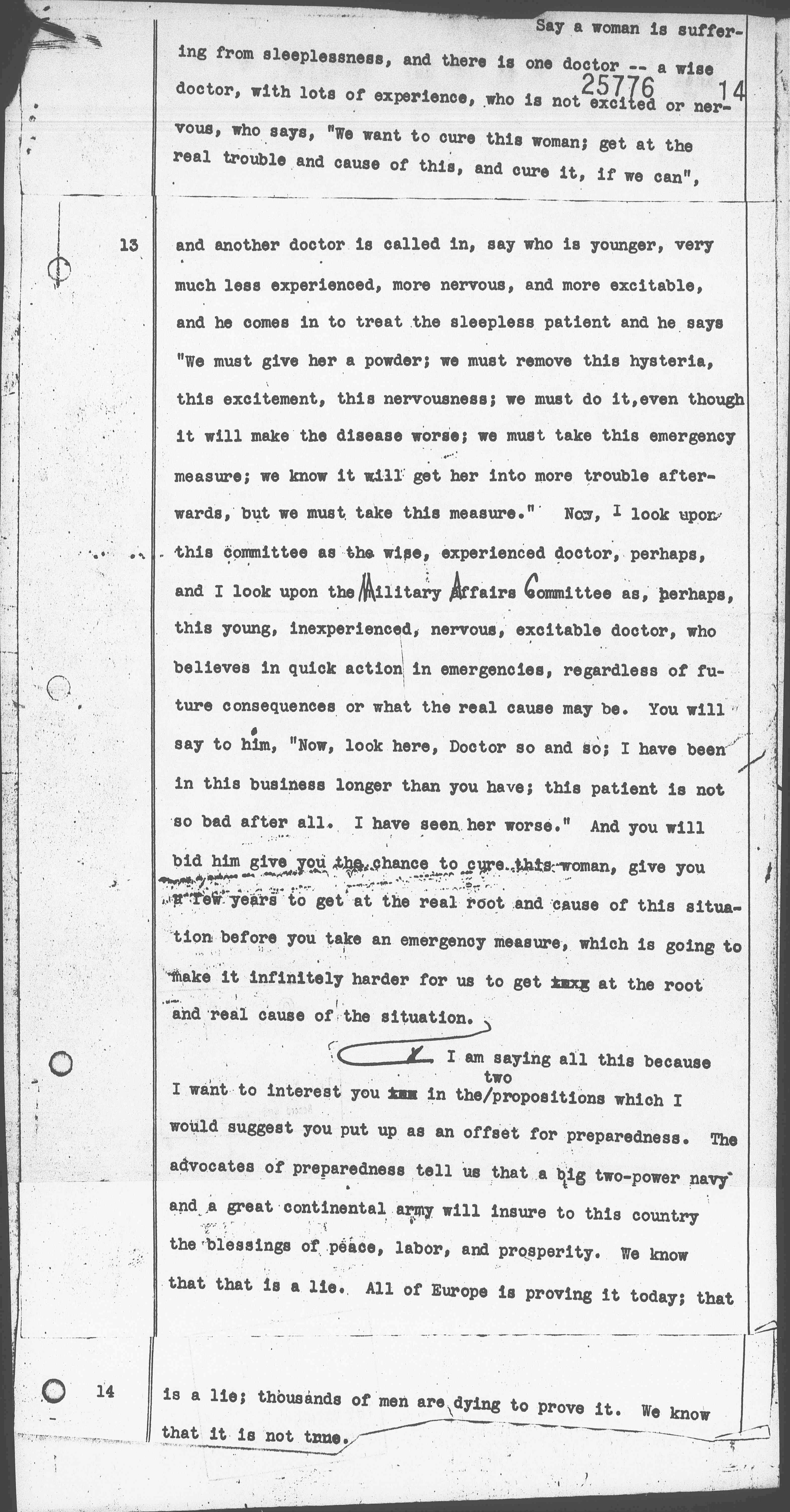 Say a woman is suffering from sleeplessness, and there is one doctor -- a wise doctor, with lots of experience, who is not excited or nervous, who says, “We want to cure this woman; get at the real trouble and cause of this, and cure it, if we can”, and another doctor is called in, say who is younger, very much less experienced, more nervous, and more excitable, and he comes in to treat the sleepless patient and he says “We must give her a powder; we must remove this hysteria, this excitement, this nervousness; we must do it, even though it will make the disease worse; we must take this emergency measure, we know it will get her into more trouble afterwards, but we must take this measure.” Now, I look upon this committee as the wise, experienced doctor, perhaps, and I look upon the Military Affairs Committee as, perhaps, this young, inexperienced, nervous, excitable doctor, who believes in quick action in emergencies, regardless of future consequences or what the real cause may be. You will say to him, “Now, look here, Doctor so and so; I have been in this business longer than you have; this patient is not so bad after all. I have seen her worse.” And you will bid him give you the chance to cure this woman, give you a few years to get at the real root and cause of this situation before you take an emergency measure, which is going to make it infinitely harder for us to get [illegible] at the root and real cause of the situation. I am saying all this because I want to interest you [illegible] in the ↑two↓ propositions which I would suggest you put up as an offset for preparedness. The advocates of preparedness tell us that a big two-power navy and a great continental army will insure to this country the blessings of peace, labor, and prosperity. We know that that is a lie. All of Europe is proving it today; that is a lie; thousands of men are dying to prove it. We know that it is not true. [page 16]