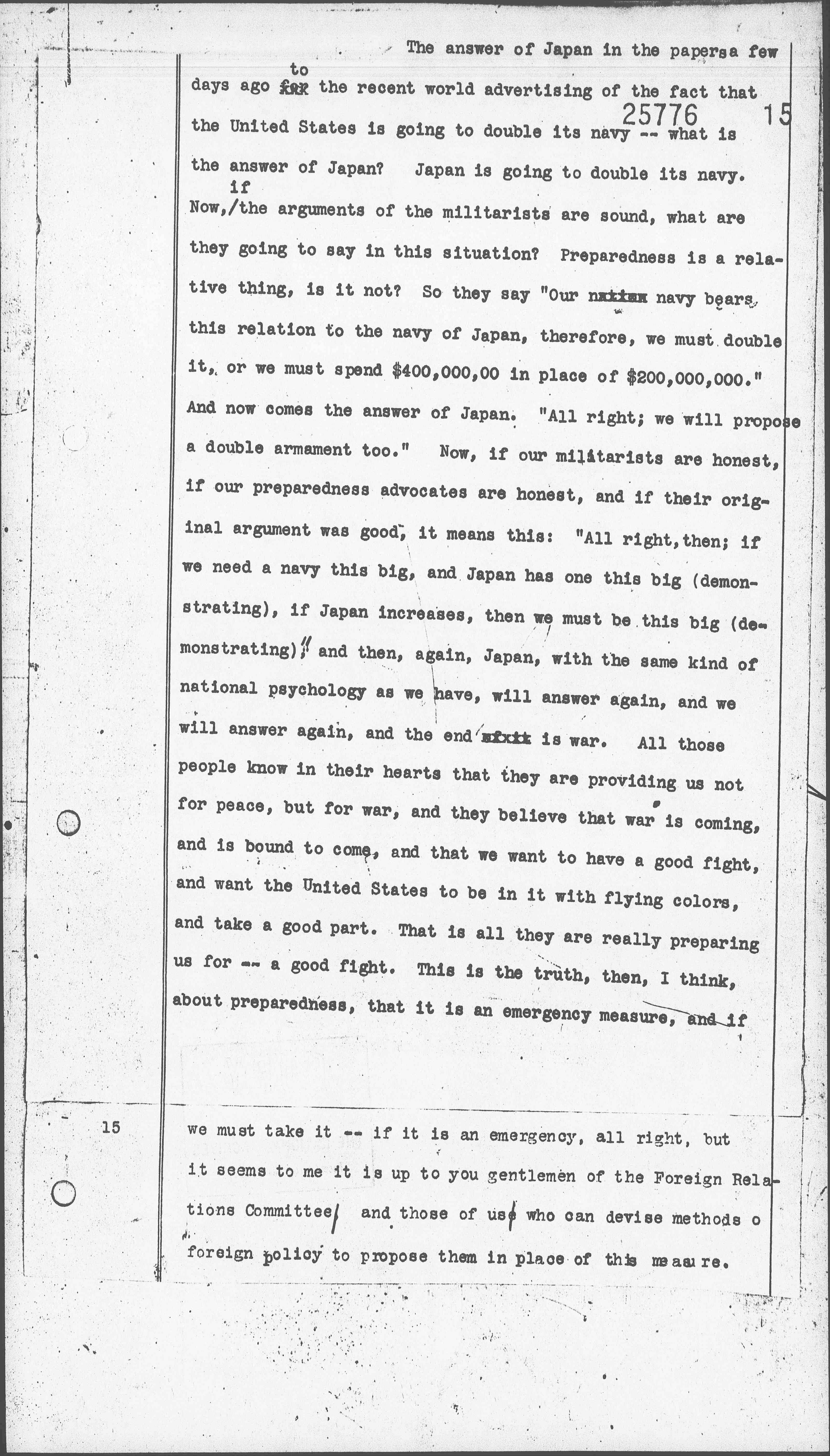 The answer of Japan in the papers a few days ago for ↑to↓ the recent world advertising of the fact that the United States is going to double its navy -- what is the answer of Japan? Japan is going to double its navy. Now, ↑if↓ the arguments of the militarists are sound, what are they going to say in this situation? Preparedness is a relative thing, is it not? So they say “Our [illegible] navy bears this relation to the navy of Japan, therefore, we must double it, or we must spend [$400,000,000] in place of $200,000,000.” And now comes the answer of Japan. “All right; we will propose a double armament too.” Now, if our militarists are honest, if our preparedness advocates are honest, and if their original argument was good, it means this: “All right, then; if we need a navy this big, and Japan has one this big (demonstrating), if Japan increases, then we must be this big (demonstrating)," and then, again, Japan, with the same kind of national psychology as we have, will answer again, and we will answer again, and the end [illegible] is war. All those people know in their hearts that they are providing us not for peace, but for war, and they believe that war is coming, and is bound to come, and that we want to have a good fight, and want the United States to be in it with flying colors, and take a good part. That is all they are really preparing us for -- a good fight. This is the truth, then, I think, about preparedness, that it is an emergency measure, and if we must take it -- if it is an emergency, all right, but it seems to me it is up to you gentlemen of the Foreign Relations Committee and those of us who can devise methods [of] foreign policy to propose them in place of this measure. [page 17]