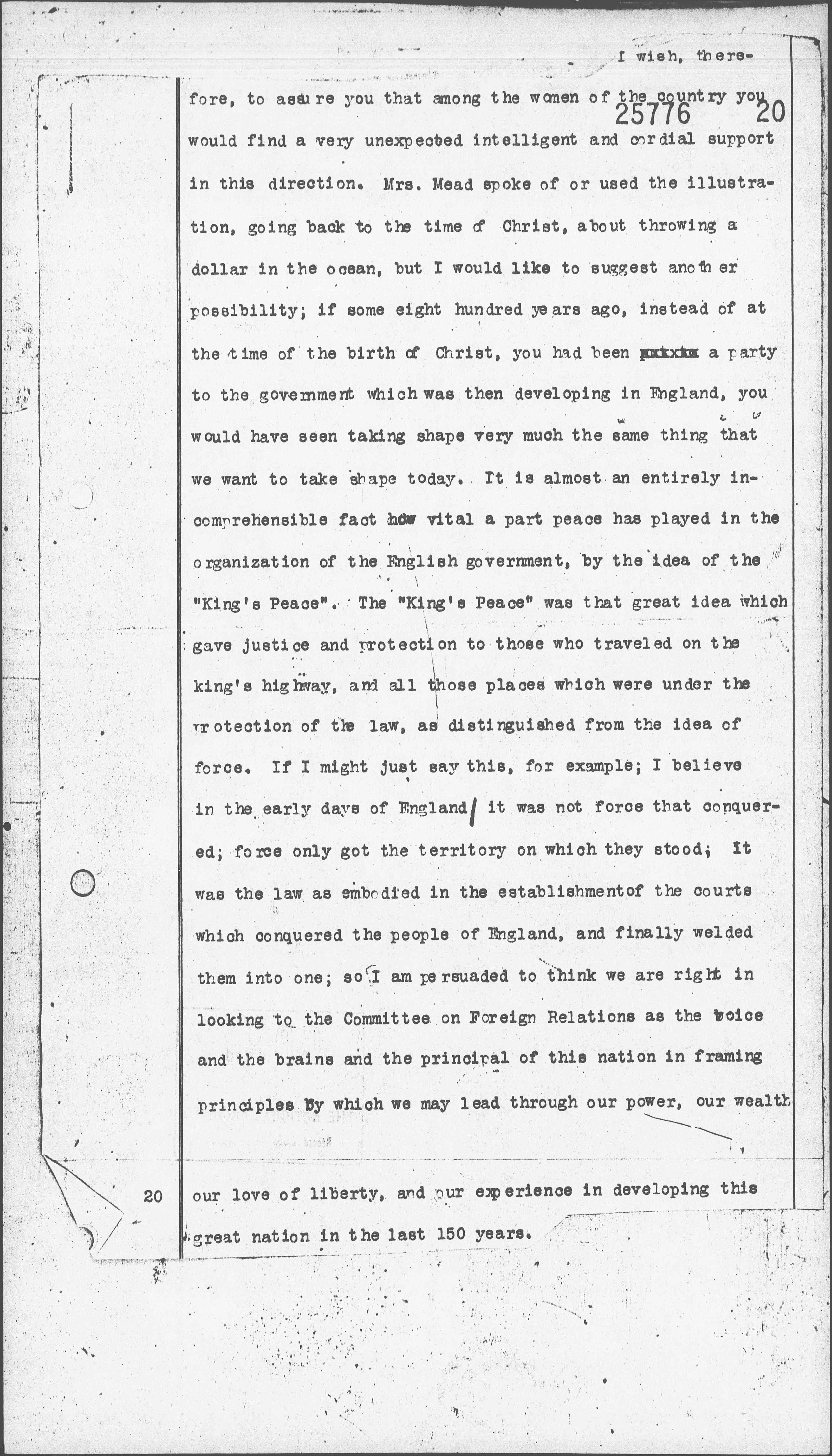 I wish, therefore, to assure you that among the women of the country you would find a very unexpected intelligent and cordial support in this direction. Mrs. Mead spoke of or used the illustration, going back to the time of Christ, about throwing a dollar in the ocean, but I would like to suggest another possibility; if some eight hundred years ago, instead of at the time of the birth of Christ, you had been [illegible] a party to the government which was then developing in England, you would have seen taking shape very much the same thing that we want to take shape today. It is almost an entirely incomprehensible fact how vital a part peace has played in the organization of the English government, by the idea of the "King's Peace". The "King's Peace" was that great idea which gave justice and protection to those who traveled on the king's highway, and all those places which were under the protection of the law, as distinguished from the idea of force. If I might just say this, for example; I believe in the early days of England it was not force that conquered; force only got the territory on which they stood; it was the law as embodied in the establishment of the courts which conquered the people of England, and finally welded them into one; so I am persuaded to think we are right in looking to the Committee on Foreign Relations as the voice and the brains and the principal of this nation in framing principles by which we may lead through our power, our wealth, our love of liberty, and our experience in developing this great nation in the last 150 years. [page 23]