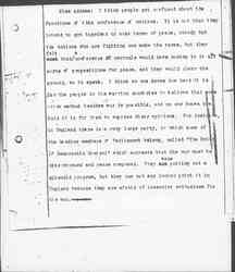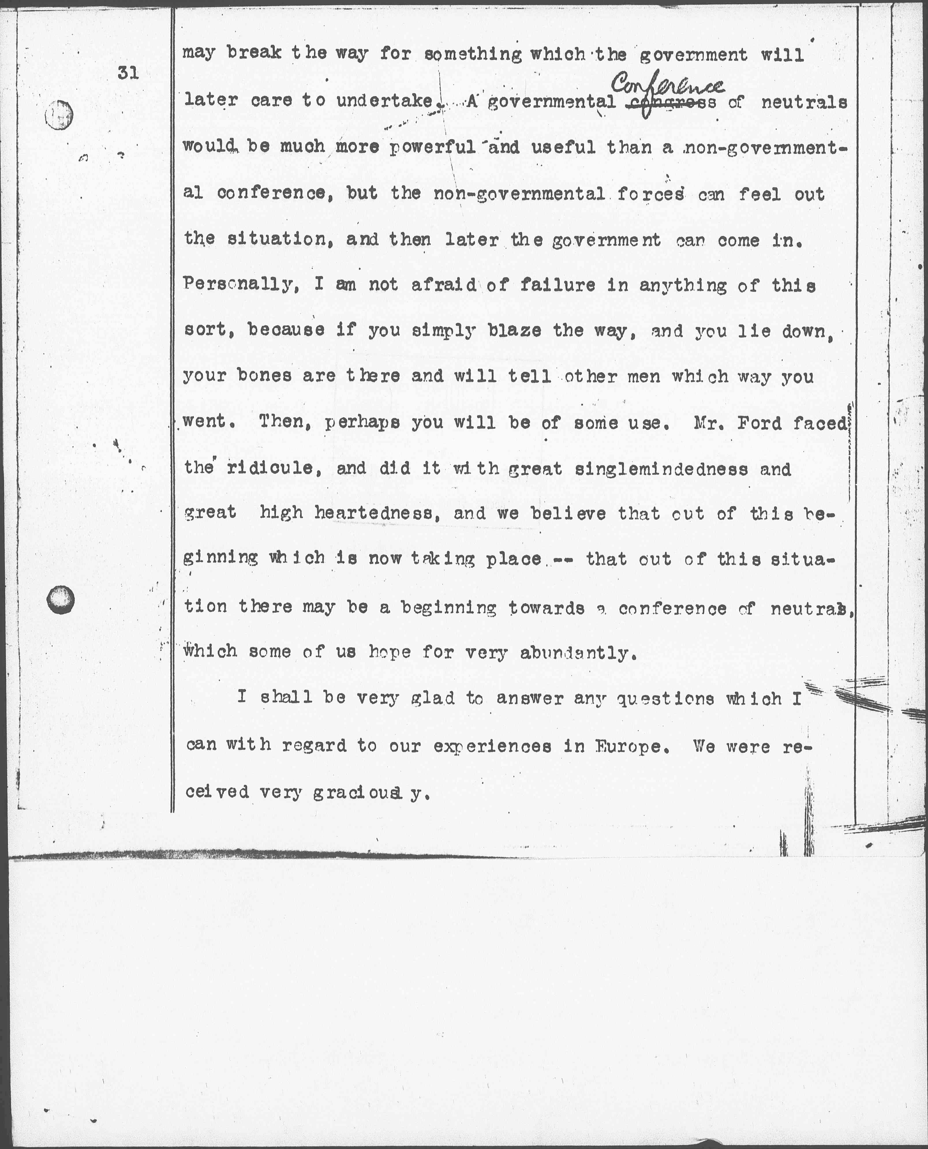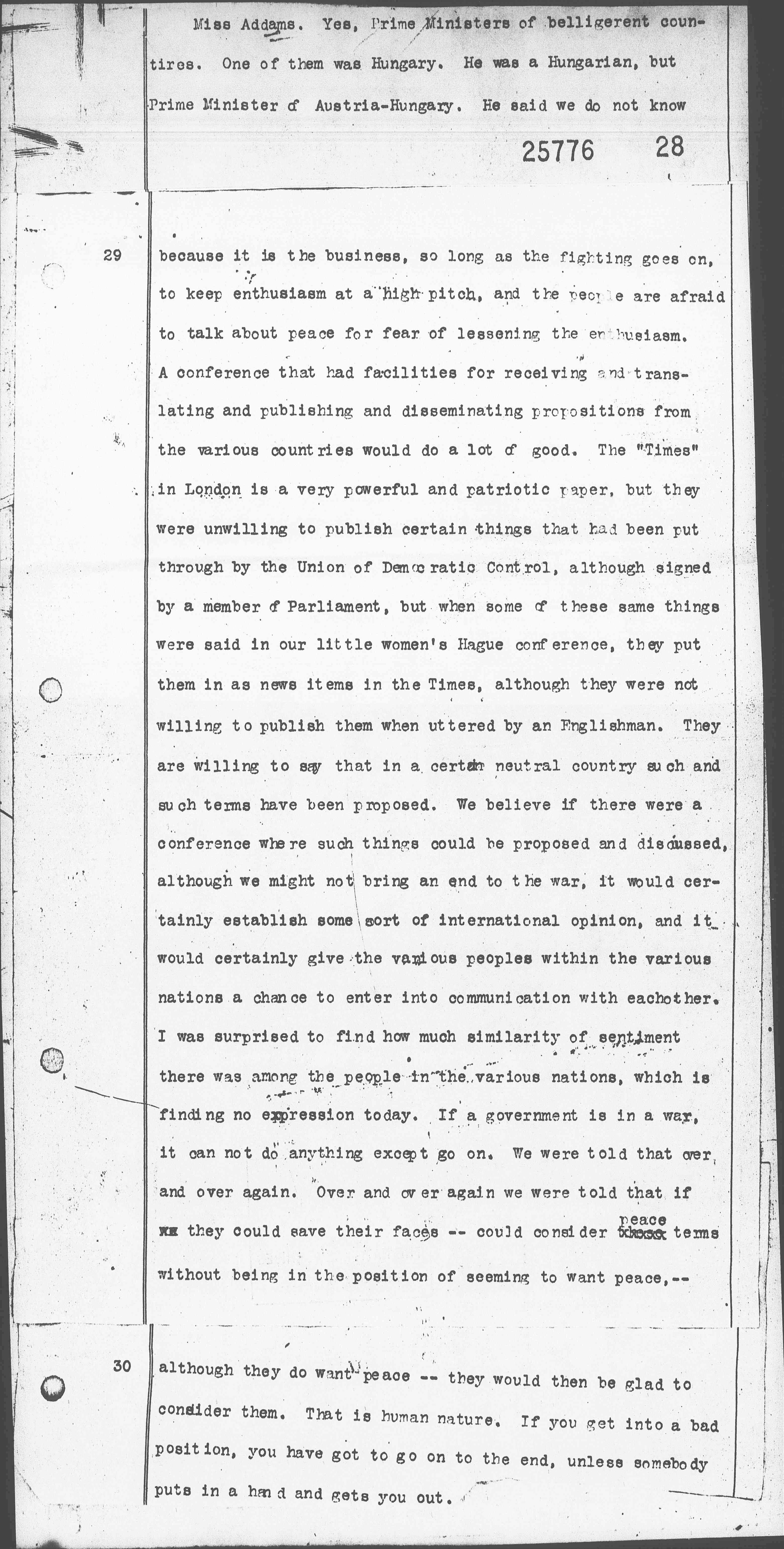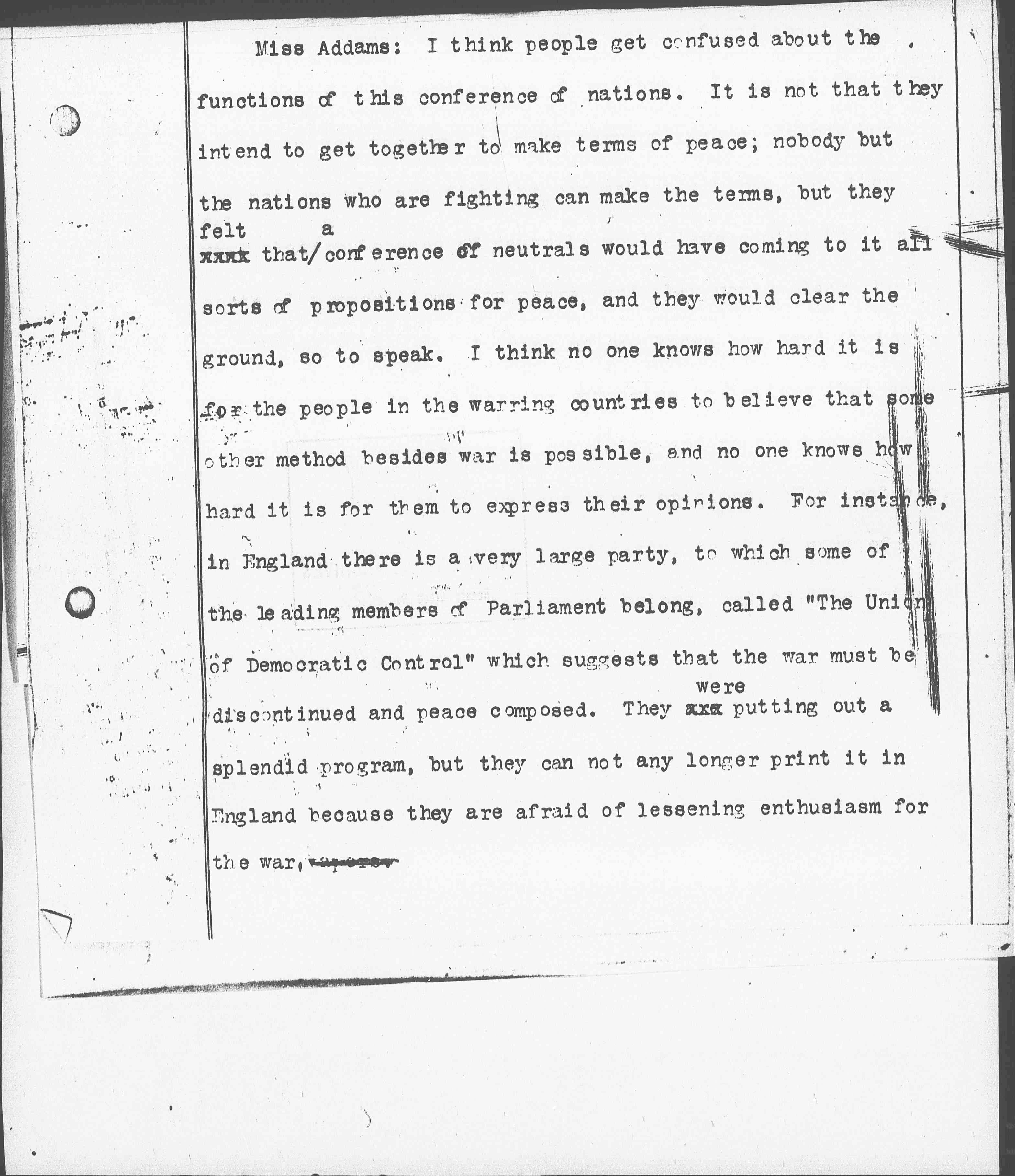 Miss Addams: I think people get confused about the functions of this conference of nations. It is not that they intend to get together to make terms of peace; nobody but the nations who are fighting can make the terms, but they [illegible] ↑felt↓ that ↑a↓ conference of neutrals would have coming to it all sorts of propositions for peace, and they would clear the ground, so to speak. I think no one knows how hard it is for the people in the warring countries to believe that some other method besides war is possible, and no one knows how hard it is for them to express their opinions. For instance, in England there is a very large party, to which some of the leading members of Parliament belong, called "The Union of Democratic Control" which suggests that the war must be discontinued and peace composed. They [illegible] ↑were↓ putting out a splendid program, but they can not any longer print it in England because they are afraid of lessening enthusiasm for the war. [illegible] [page 32]