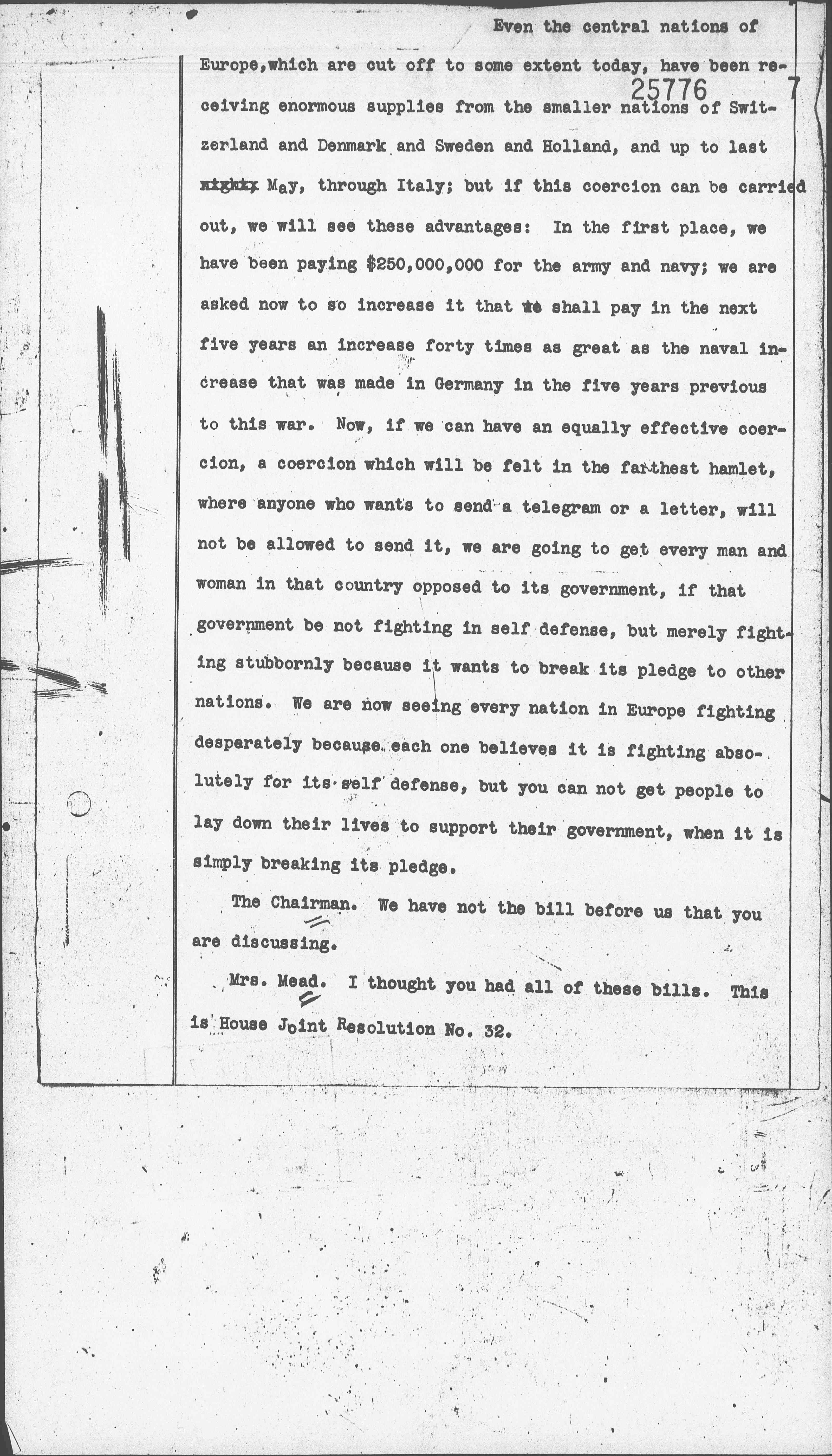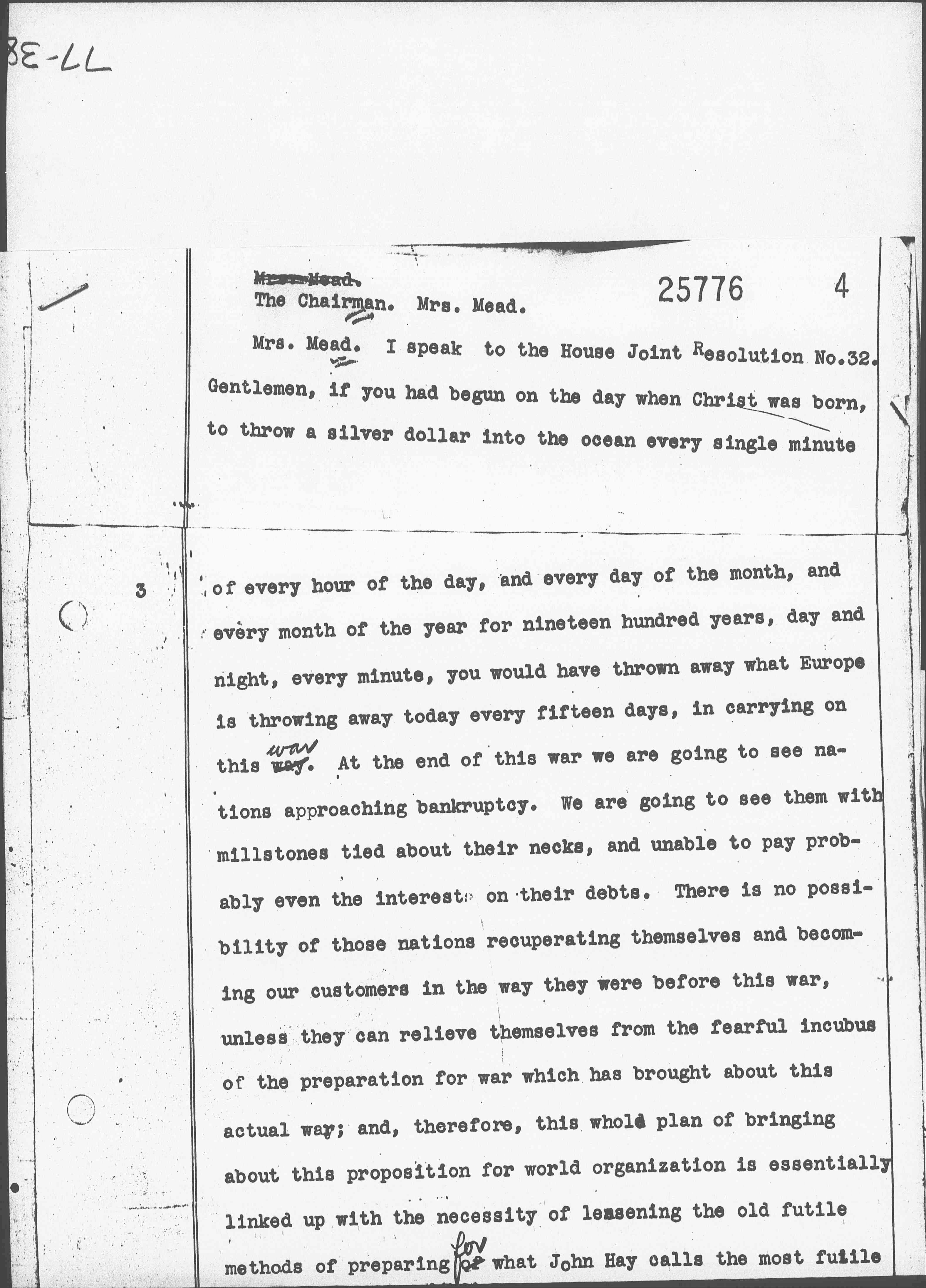 Mrs. Mead. I speak to the House Joint Resolution No.32. Gentlemen, if you had begun on the day when Christ was born, to throw a silver dollar into the ocean every single minute of every hour of the day, and every day of the month, and every month of the year for nineteen hundred years, day and night, every minute, you would have thrown away what Europe is throwing away today every fifteen days, in carrying on this way ↑war↓. At the end of this war we are going to see nations approaching bankruptcy. We are going to see them with millstones tied about their necks, and unable to pay probably even the interest on their debts. There is no possibility of those nations recuperating themselves and becoming our customers in the way they were before this war, unless they can relieve themselves from the fearful incubus of the preparation for war which has brought about this actual war; and, therefore, this whole plan of bringing about this proposition for world organization is essentially linked up with the necessity of lessening the old futile methods of preparing of ↑for↓ what John Hay calls the most futile [page 5] and ferocious of methods, which is war. There has been an illogical inversion; you have put disarmament first, which, of course, is illogical, and should come afterwards; there can be no disarmament until after there are substitutes for armament, and to carry out such propositions as we have all been familiar with for many years; there is nothing essentially new in reference to the proposed conference. This whole idea of world organization goes back to [Immanuel] Kant; most of these propositions in this bill go back to the time of men of wisdom of other ages; all of these things were advocated sixty or seventy years ago. The world is now beginning to see the futility of the old doctrine of force; that you can not get ahead of your neighbor ↑without↓ provoking that neighbor to rivalry, and finally to bring about such intolerable pressure and such an accumulation in the flow of munitions, that there is bound to be an explosion and a conflagration. [typed in left margin] ↑cyl 2↓ [page 6]