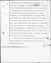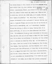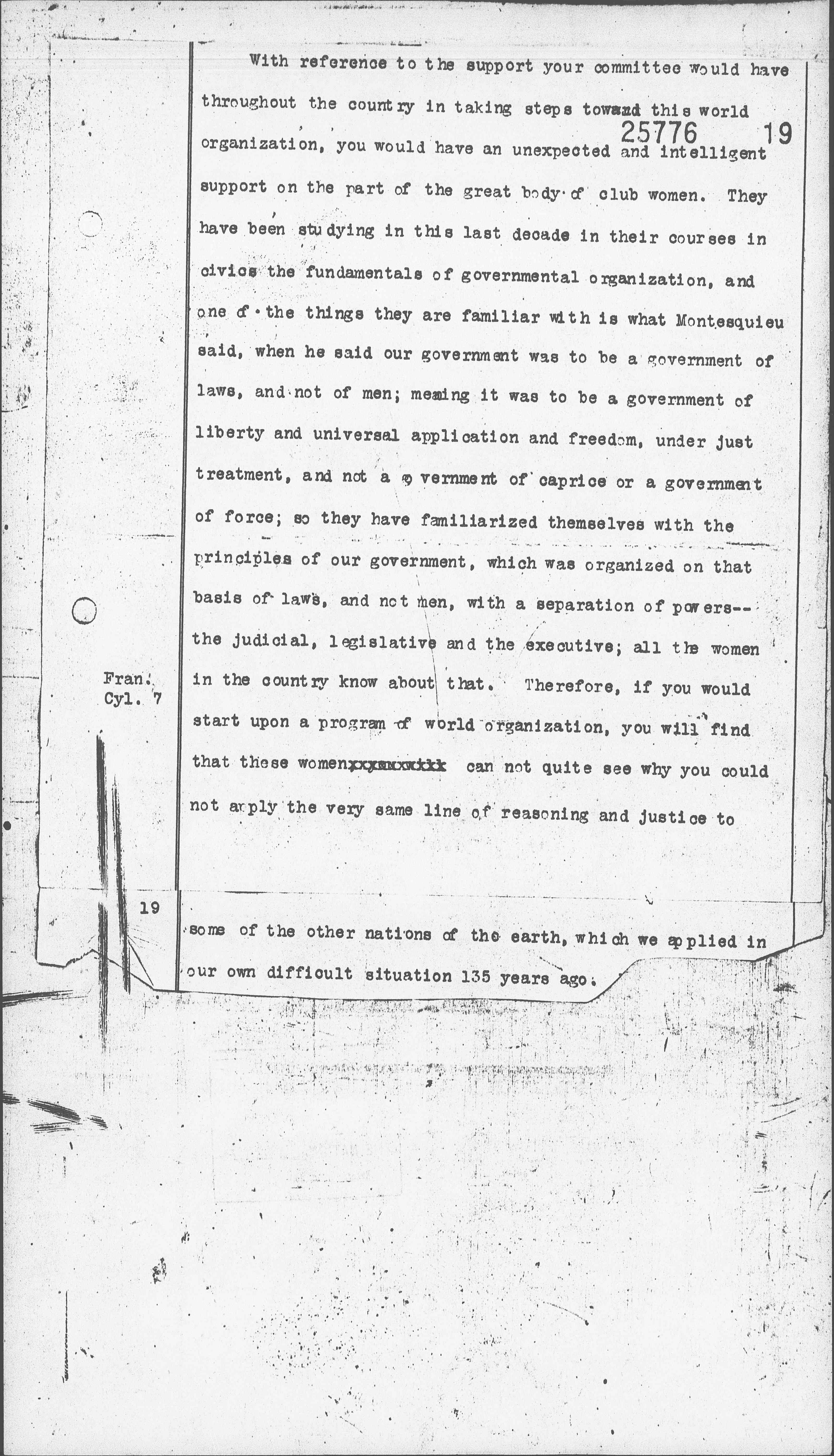 With reference to the support your committee would have throughout the country in taking steps toward this world organization, you would have an unexpected and intelligent support on the part of the great body of club women. They have been studying in this last decade in their courses in civics the fundamentals of governmental organization, and one of the things they are familiar with is what Montesquieu said, when he said our government was to be a government of laws, and not of men; meaning it was to be a government of liberty and universal application and freedom, under just treatment, and not a [government] of caprice or a government of force; so they have familiarized themselves with the principles of our government, which was organized on that basis of laws, and not men, with a separation of powers -- the judicial, legislative and the executive; all the women in the country know about that. Therefore, if you would start upon a program of world organization, you will find that these women [illegible] can not quite see why you could not apply the very same line of reasoning and justice to some of the other nations of the earth, which we applied in our own difficult situation 135 years ago. [page 22]