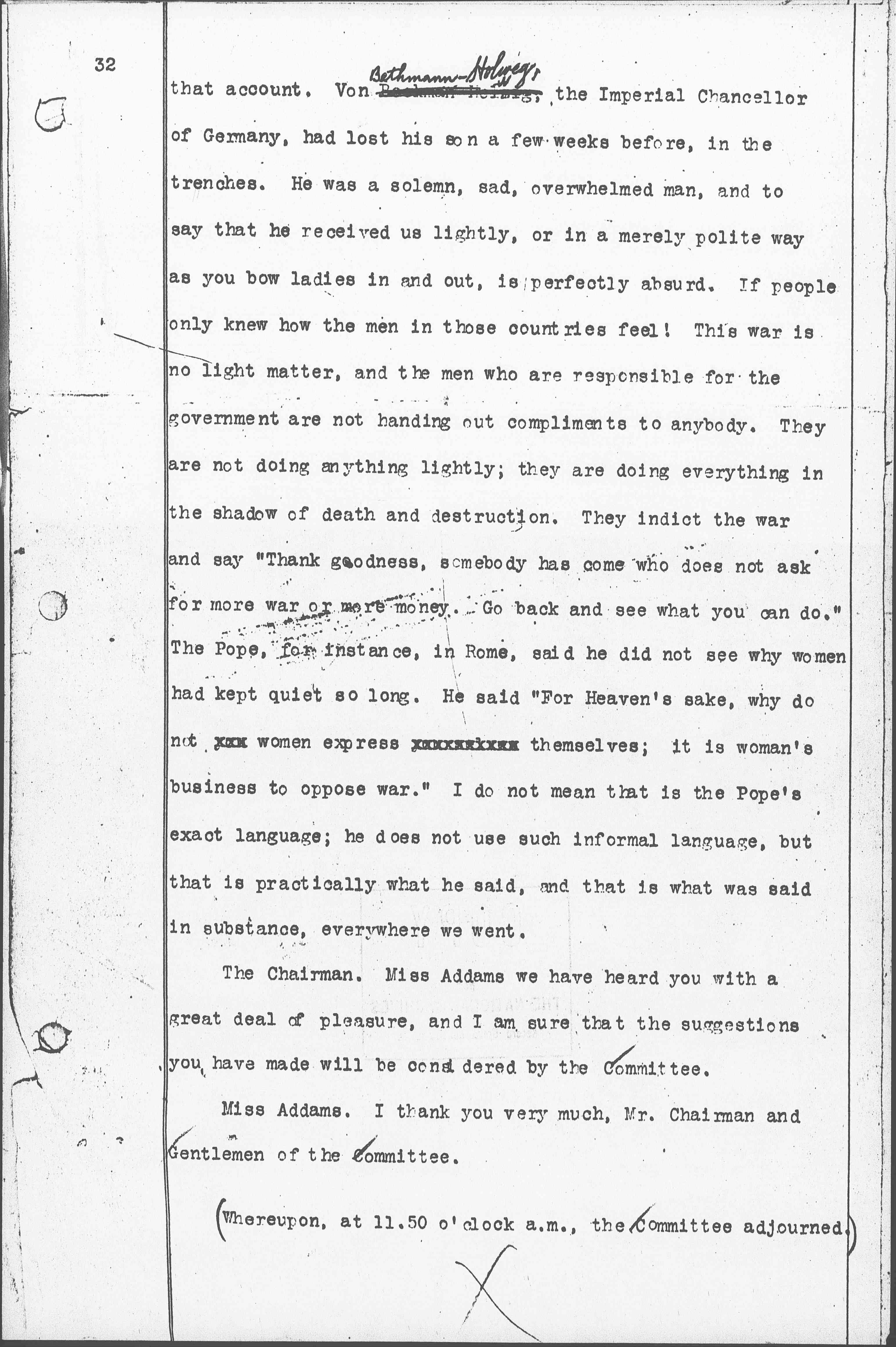 Miss Addams. (interposing), I know people have said that. I can not understand why they do. They say two things, first, that we were received very lightly, and second, that we were received politely because we were ladies, and bowed in and out, and pleasant things were said to us on [page 37] that account. Von Bethmann-[Hollweg], the Imperial Chancellor of Germany, had lost his son a few weeks before, in the trenches. He was a solemn, sad, overwhelmed man, and to say that he received us lightly, or in a merely polite way as you bow ladies in and out, is perfectly absurd. If people only knew how the men in those countries feel! This war is no light matter, and the men who are responsible for the government are not handing out compliments to anybody. They are not doing anything lightly; they are doing everything in the shadow of death and destruction. They indict the war and say "Thank goodness, somebody has come who does not ask for more war or more money. Go back and see what you can do." The Pope, for instance, in Rome, said he did not see why women had kept quiet so long. He said "For Heaven's sake, why do not [illegible] women express [illegible] themselves; it is woman's business to oppose war." I do not mean that is the Pope's exact language; he does not use such informal language, but that is practically what he said, and that is what was said in substance, everywhere we went.