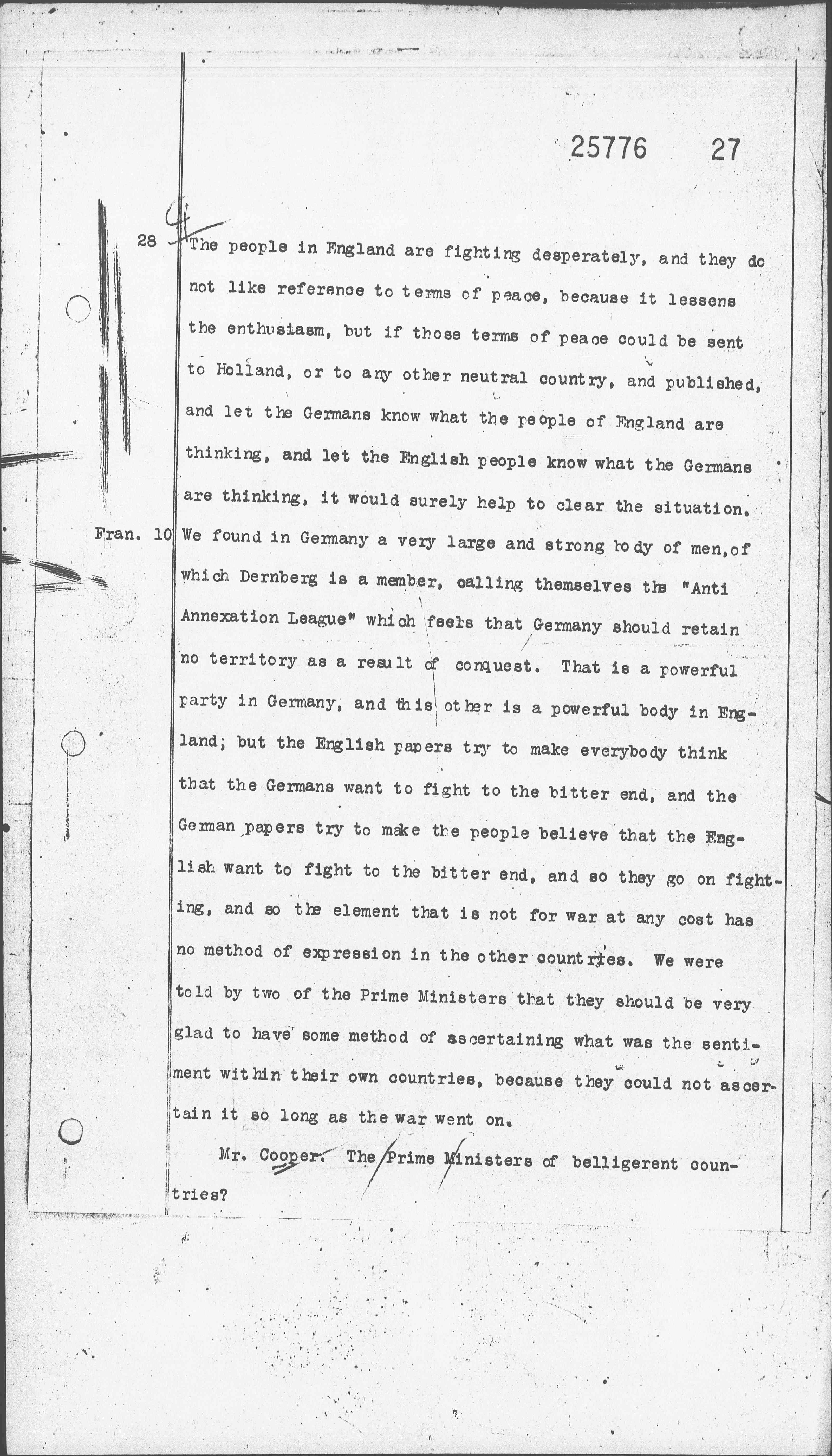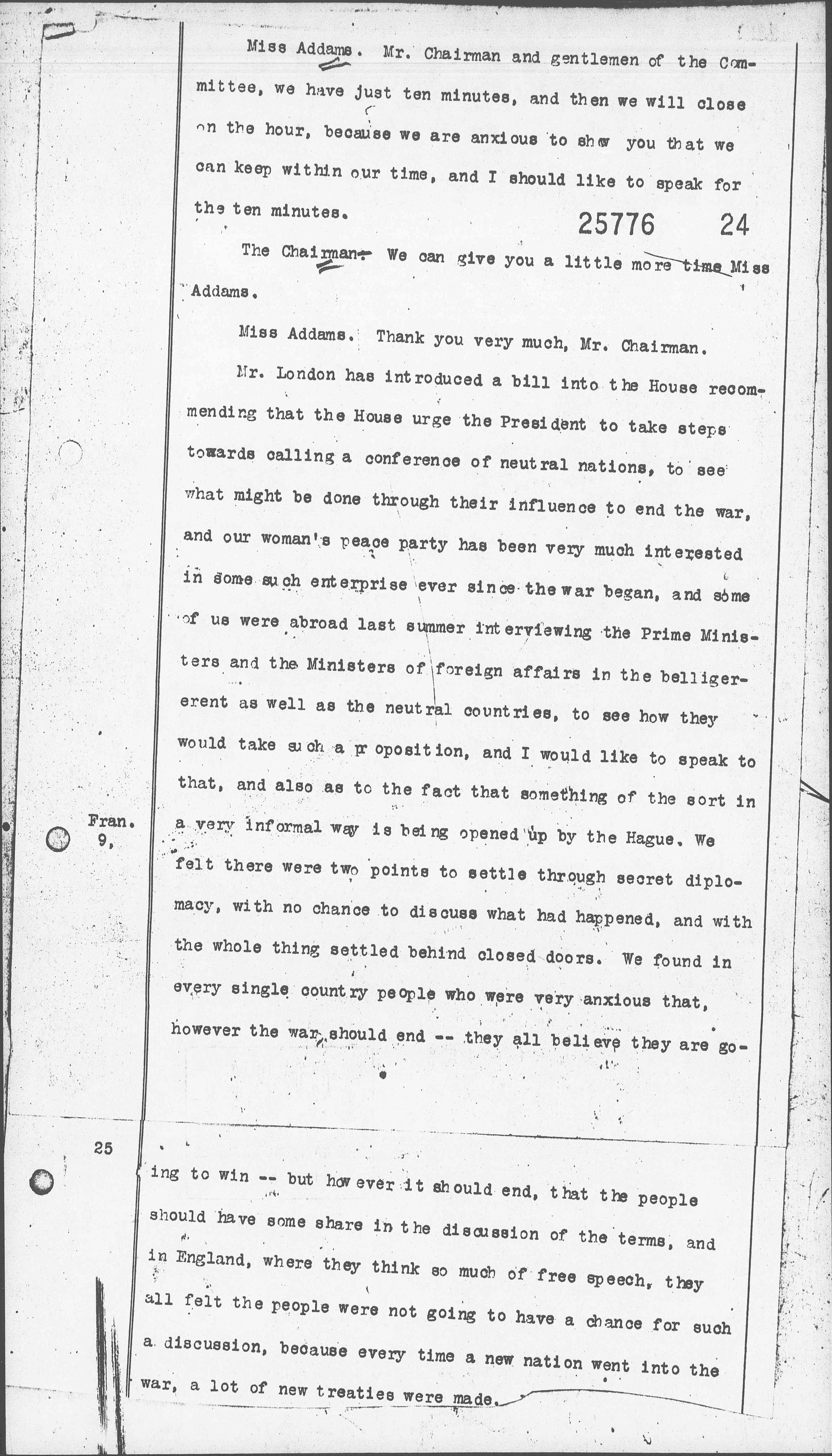 Miss Addams. Yes, Prime Ministers of belligerent countries. One of them was Hungary. He was a Hungarian, but Prime Minister of Austria-Hungary. He said we do not know because it is the business, so long as the fighting goes on, to keep enthusiasm at a high pitch, and the people are afraid to talk about peace for fear of lessening the enthusiasm. A conference that had facilities for receiving and translating and publishing and disseminating propositions from the various countries would do a lot of good. The "Times" in London is a very powerful and patriotic paper, but they were unwilling to publish certain things that had been put through by the Union of Democratic Control, although signed by a member of Parliament, but when some of these same things were said in our little women's Hague conference, they put them in as news items in the Times, although they were not willing to publish them when uttered by an Englishman. They are willing to say that in a certain neutral country such and such terms have been proposed. We believe if there were a conference where such things could be proposed and discussed, although we might not bring an end to the war, it would certainly establish some sort of international opinion, and it would certainly give the various peoples within the various nations a chance to enter into communication with each other. I was surprised to find how much similarity of sentiment there was among the people in the various nations, which is finding no expression today. If a government is in a war, it can not do anything except go on. We were told that over and over again. Over and over again we were told that if [illegible] they could save their faces -- could consider [illegible] ↑peace↓ terms without being in the position of seeming to want peace, -- although they do want peace -- they would then be glad to consider them. That is human nature. If you get into a bad position, you have got to go on to the end, unless somebody puts in a hand and gets you out. [page 34]