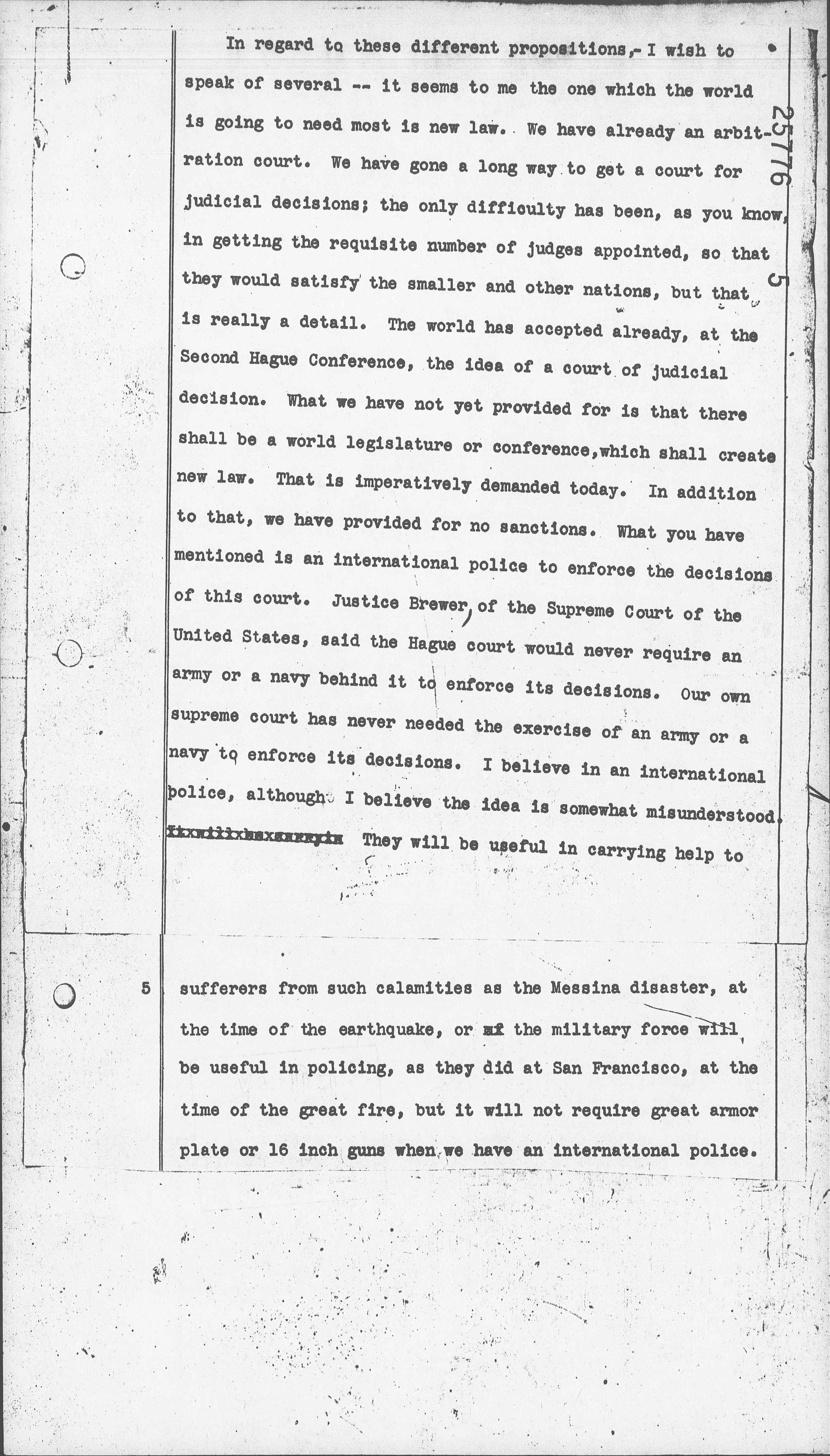 In regard to these different propositions, -- I wish to speak of several -- it seems to me the one which the world is going to need most is new law. We have already an arbitration court. We have gone a long way to get a court for judicial decisions; the only difficulty has been, as you know, in getting the requisite number of judges appointed, so that they would satisfy the smaller and other nations, but that is really a detail. The world has accepted already at the Second Hague Conference, the idea of a court of judicial decision. What we have not yet provided for is that there shall be a world legislature or conference, which shall create new law. That is imperatively demanded today. In addition to that, we have provided for no sanctions. What you have mentioned is an international police to enforce the decisions of this court. Justice Brewer, of the Supreme Court of the United States, said The Hague court would never require an army or a navy behind it to enforce its decisions. Our own supreme court has never needed the exercise of an army or a navy to enforce its decisions. I believe in an international police, although I believe the idea is somewhat misunderstood. [illegible] They will be useful in carrying help to sufferers from such calamities as the Messina disaster, at the time of the earthquake, or [illegible] the military force will be useful in policing, as they did at San Francisco, at the time of the great fire, but it will not require great armor plate or 16 inch guns when we have an international police. [page 7] When we have no armies left, it will necessarily be a small body and I do not believe it will be a body that it will be difficult to coerce nations into obeying the decisions of the courts. No nation which has ever gone into an arbitration has ever gone back on its word, and gone to war. In some cases there have been delays and retrials, but in no case has a nation gone into an arbitration court and then broken its word afterward, and gone to war. I believe, therefore, that the functions of our international police will be largely those of our city police, and we shall need their helpful protection at times; but, gentlemen, there is another sanction which I hope you will introduce as an amendment to this bill before it is passed. There have ↑has↓ come to our attention in the last few years, with the rapid connection of nations now -- even by the wireless -- the opportunity to coerce a nation in a far more powerful way than by bombarding its great cities. It is the coercion of non-intercourse. If such coercion, in the form of concerned drastic non-intercourse be carried out, to the extent of cutting off all passports, copyrights, and patents, and cutting off all railroad and shipping connections, cutting off absolutely the telegraph and coastal ↑postal↓ connections, it will be effective, in that it will leave that nation absolutely alone, and no nation has yet stood absolutely alone. [typed in left margin] ↑Francisco Cyl. 3↓ [page 8]
