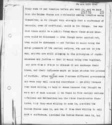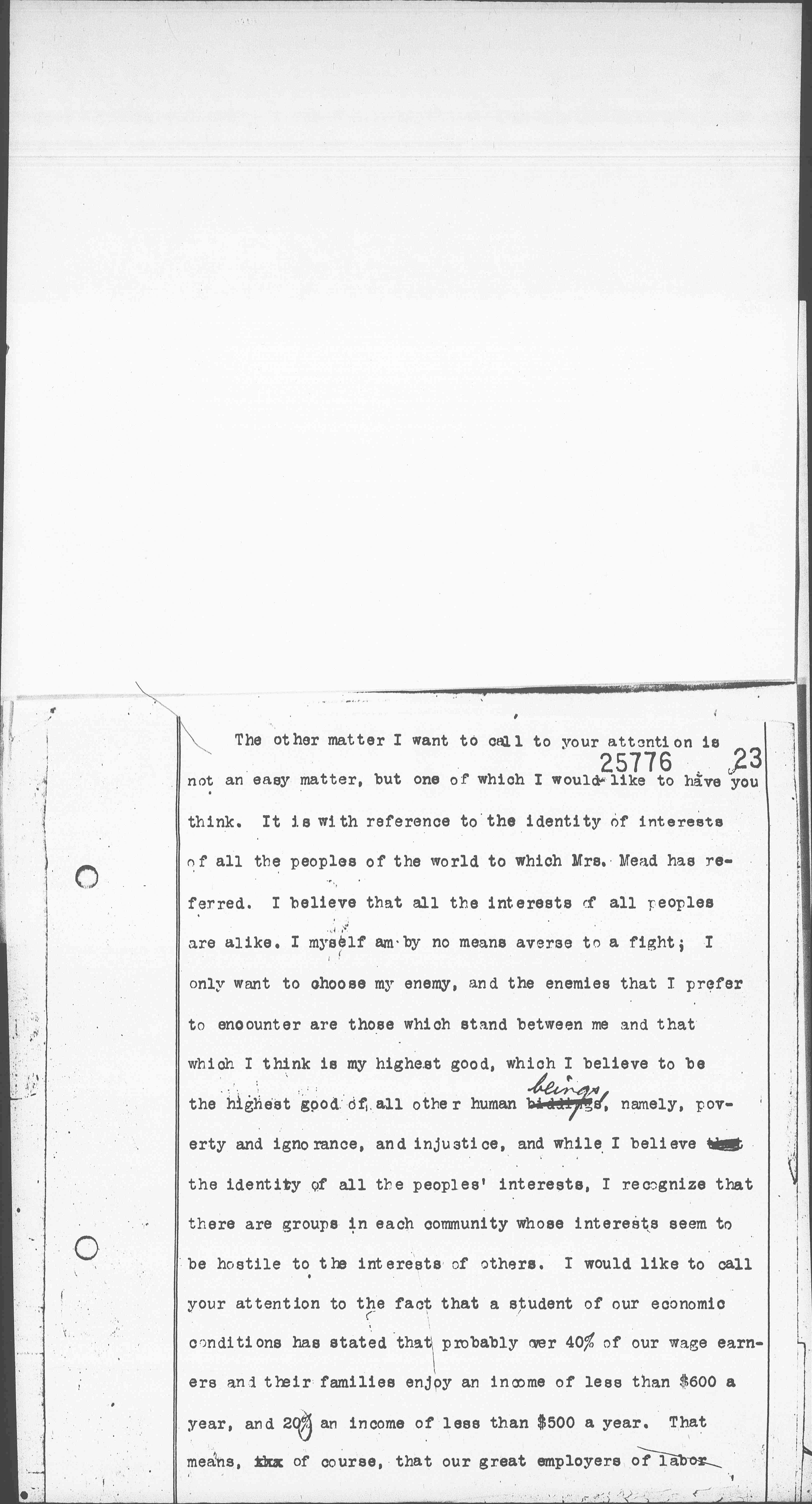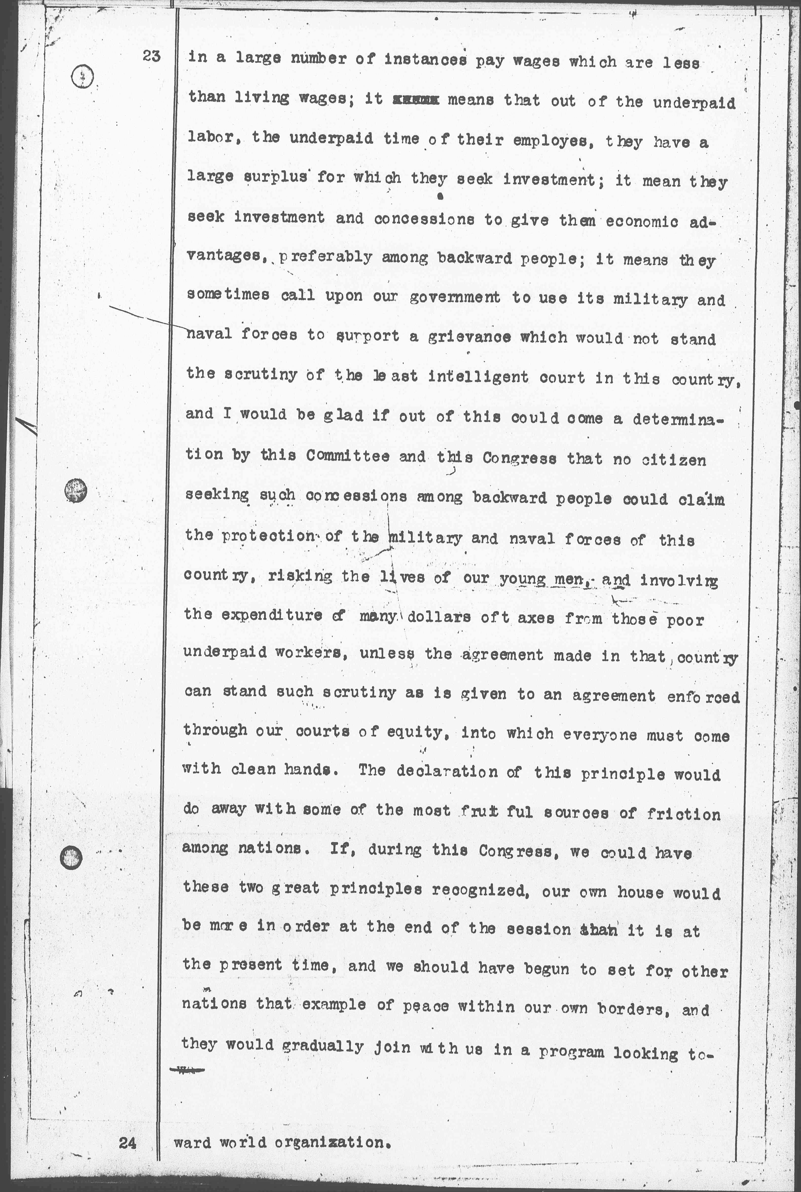 The other matter I want to call to your attention is not an easy matter, but one of which I would like to have you think. It is with reference to the identity of interests of all the peoples of the world to which Mrs. Mead has referred. I believe that all the interests of all peoples are alike. I myself am by no means averse to a fight; I only want to choose my enemy, and the enemies that I prefer to encounter are those which stand between me and that which I think is my highest good, which I believe to be the highest good of all other human biddings ↑beings,↓ namely, poverty and ignorance, and injustice, and while I believe that the identity of all the peoples' interests, I recognize that there are groups in each community whose interests seem to be hostile to the interests of others. I would like to call your attention to the fact that a student of our economic conditions has stated that probably over 40% of our wage earners and their families enjoy an income of less than $600 a year, and 20% an income of less than $500 a year. That means, [illegible] of course, that our great employers of labor [page 26] in a large number of instances pay wages which are less than living wages; it [illegible] means that out of the underpaid labor, the underpaid time of their [employees], they have a large surplus for which they seek investment; it [means] they seek investment and concessions to give them economic advantages, preferably among backward people; it means they sometimes call upon our government to use its military and naval forces to support a grievance which would not stand the scrutiny of the least intelligent court in this country, and I would be glad if out of this could come a determination by this Committee and this Congress that no citizen seeking such concessions among backward people could claim the protection of the military and naval forces of this country, risking the lives of our young men, and involving the expenditure of many dollars of taxes from those poor underpaid workers, unless the agreement made in that country can stand such scrutiny as is given to an agreement enforced through our courts of equity, into which everyone must come with clean hands. The declaration of this principle would do away with some of the most fruitful sources of friction among nations. If, during this Congress, we could have these two great principles recognized, our own house would be more in order at the end of the session than it is at the present time, and we should have begun to set for other nations that example of peace within our own borders, and they would gradually join with us in a program looking toward world organization. [page 27]