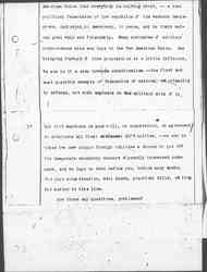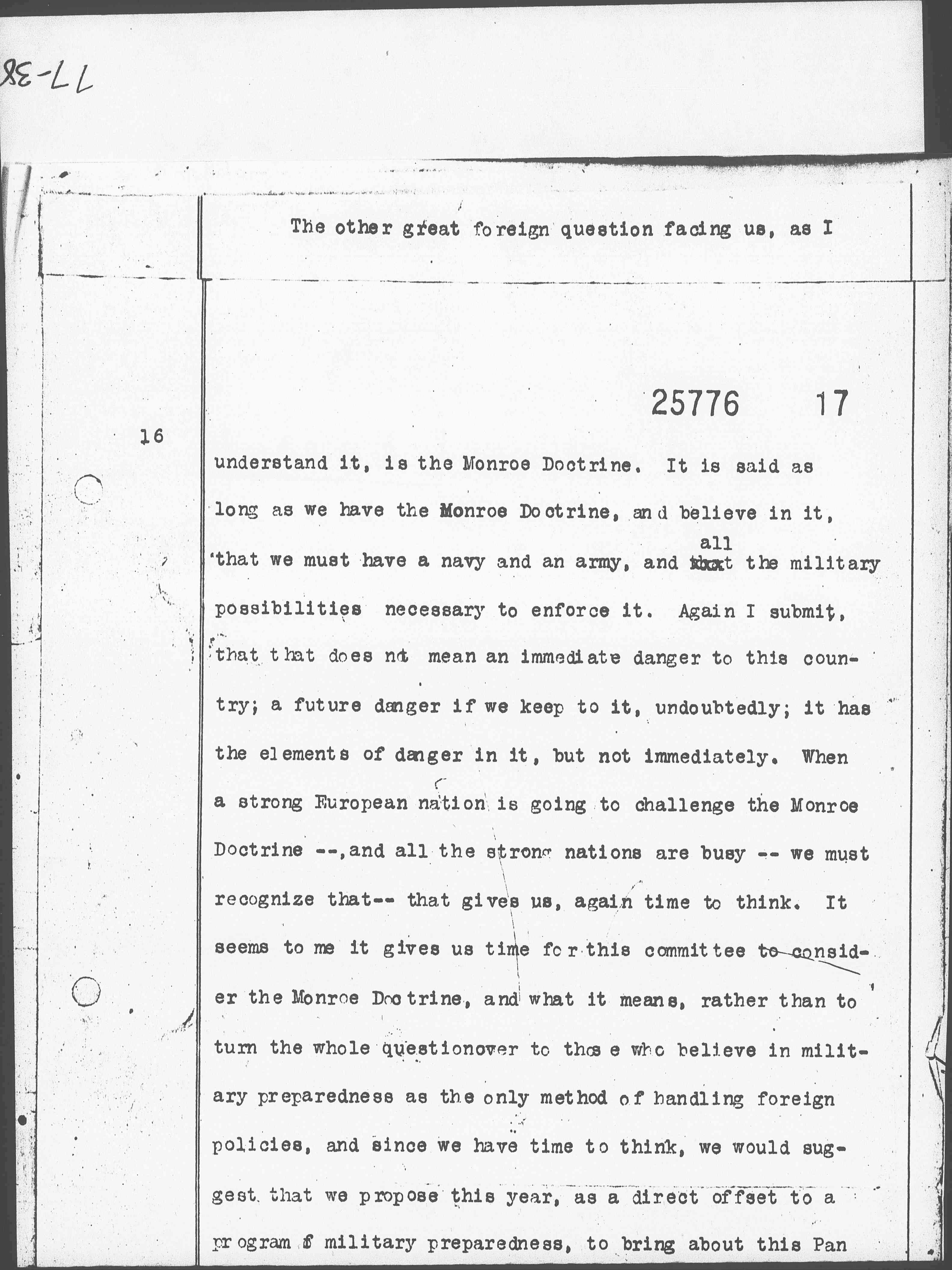 The other great foreign question facing us, as I understand it, is the Monroe Doctrine. It is said as long as we have the Monroe Doctrine, and believe in it, that we must have a navy and an army, and that ↑all↓ the military possibilities necessary to enforce it. Again I submit, that that does [not] mean an immediate danger to this country; a future danger if we keep to it, undoubtedly; it has the elements of danger in it, but not immediately. When a strong European nation is going to challenge the Monroe Doctrine -- and all the strong nations are busy -- we must recognize that -- that gives us, again time to think. It seems to me it gives us time for this committee to consider the Monroe Doctrine, and what it means, rather than to turn the whole question over to those who believe in military preparedness as the only method of handling foreign policies, and since we have time to think, we would suggest that we propose this year, as a direct offset to a program [of] military preparedness, to bring about this Pan [page 19] American Union that everybody is talking about, -- a real political federation of the republics of the western hemisphere, dedicated to democracy, to peace, and to their mutual good will and friendship. Many advocates of military preparedness also see hope in the Pan American Union. Our bringing forward of this proposition is a little different. We see in it a step towards unnationalism -- the first and most possible example of federation of nations, [not] primarily by defense, not with emphasis on the military side of it, but with emphasis on good will, on cooperation, on agreement to arbitrate all their [illegible] difficulties, -- we see in these two new unique foreign policies a chance to put off the desperate emergency measure of greatly increased armament, and we hope to have before you, before many weeks, for your consideration, well drawn, practical bills, calling for action in this line.