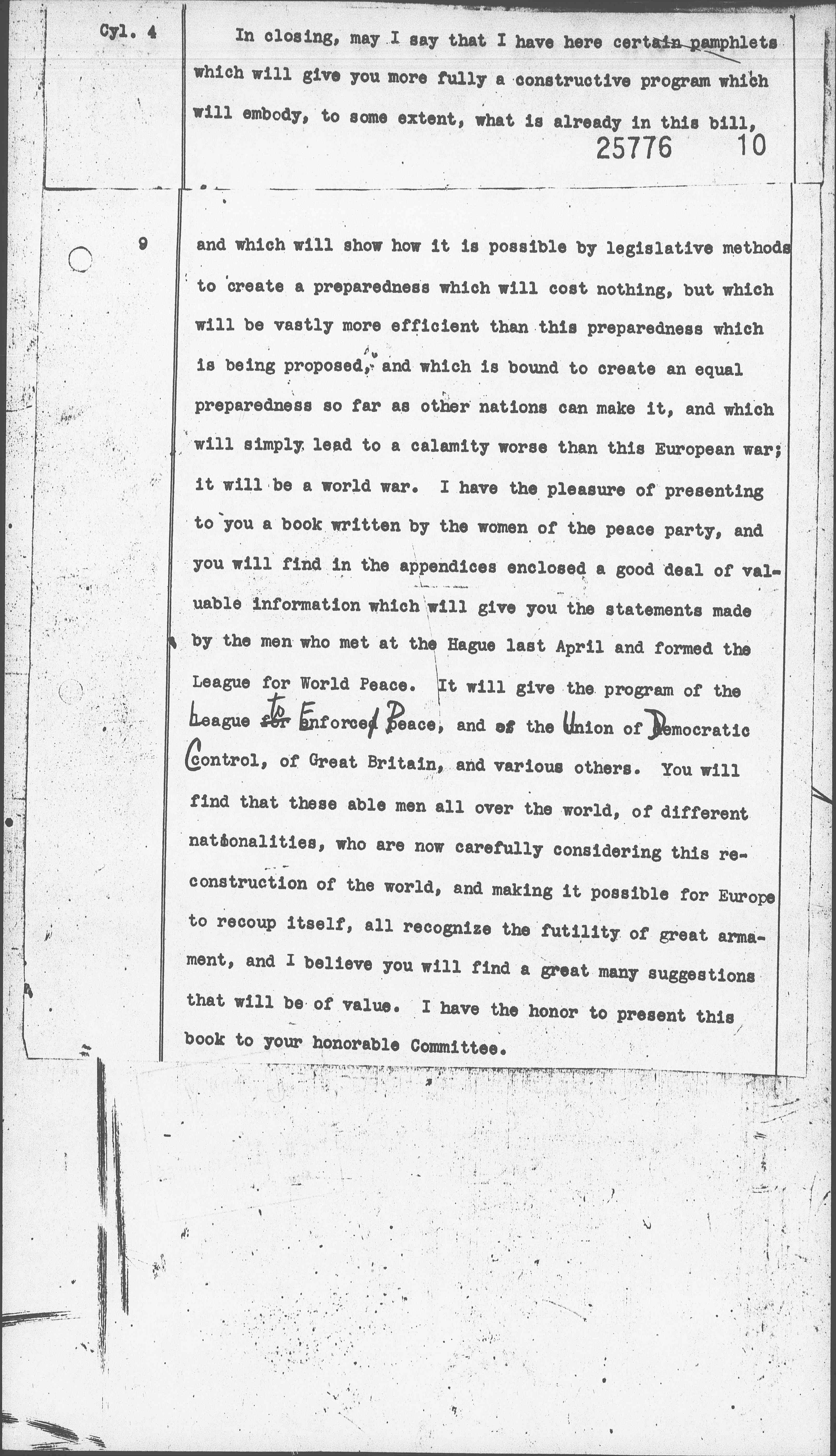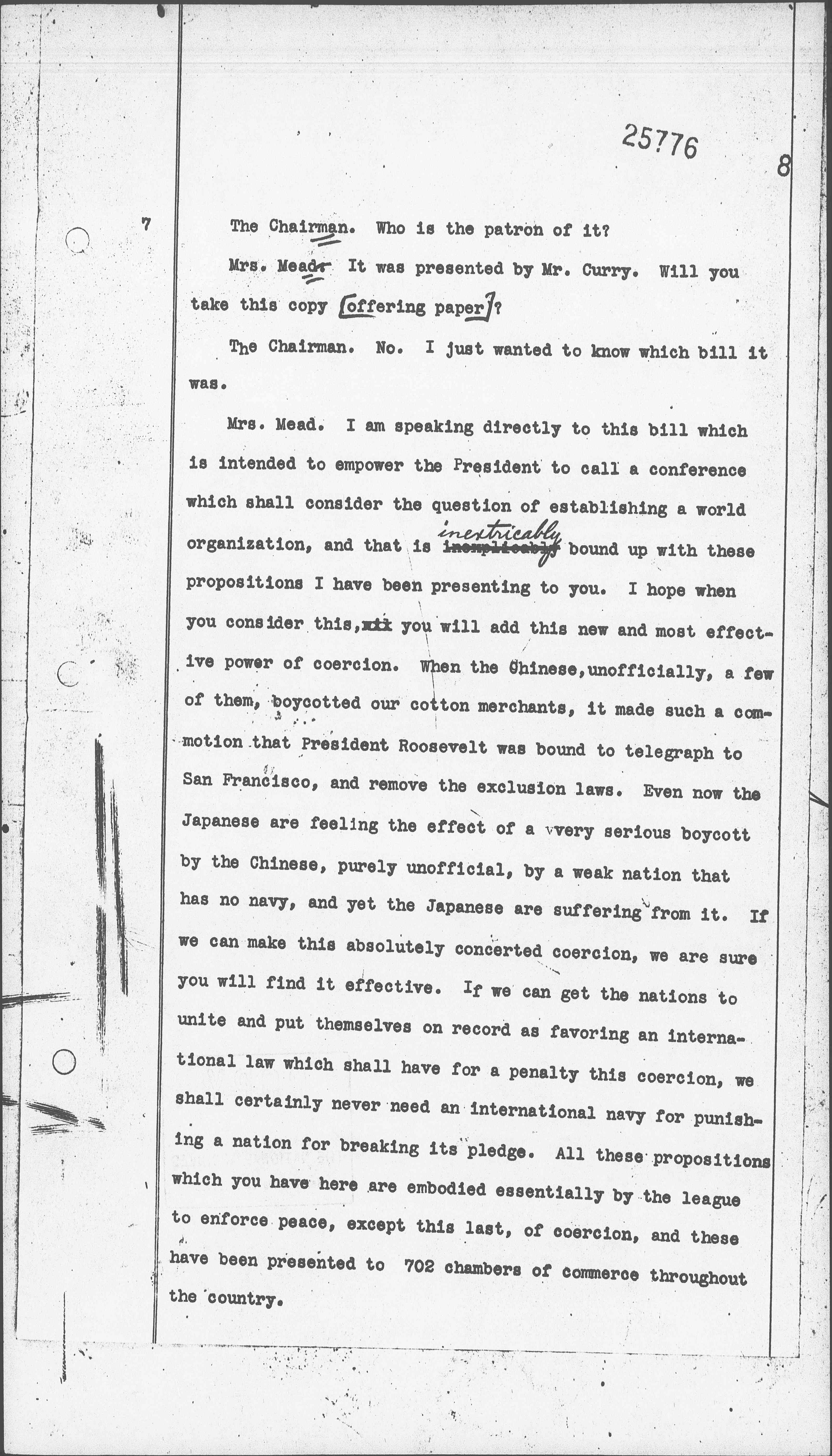 Mrs. Mead. I am speaking directly to this bill which is intended to empower the President to call a conference which shall consider the question of establishing a world organization, and that is [illegible] ↑inextricably↓ bound up with these propositions I have been presenting to you. I hope when you consider this, [illegible] you will add this new and most effective power of coercion. When the Chinese, unofficially, a few of them, boycotted our cotton merchants, it made such a commotion that President Roosevelt was bound to telegraph to San Francisco, and remove the exclusion laws. Even now the Japanese are feeling the effect of a very serious boycott by the Chinese, purely unofficial, by a weak nation that has no navy, and yet the Japanese are suffering from it. If we can make this absolutely concerted coercion, we are sure you will find it effective. If we can get the nations to unite and put themselves on record as favoring an international law which shall have for a penalty this coercion, we shall certainly never need an international navy for punishing a nation for breaking its pledge. All these propositions which you have here are embodied essentially by the league to enforce peace, except this last, of coercion, and these have been presented to 702 chambers of commerce throughout the country. [page 10]