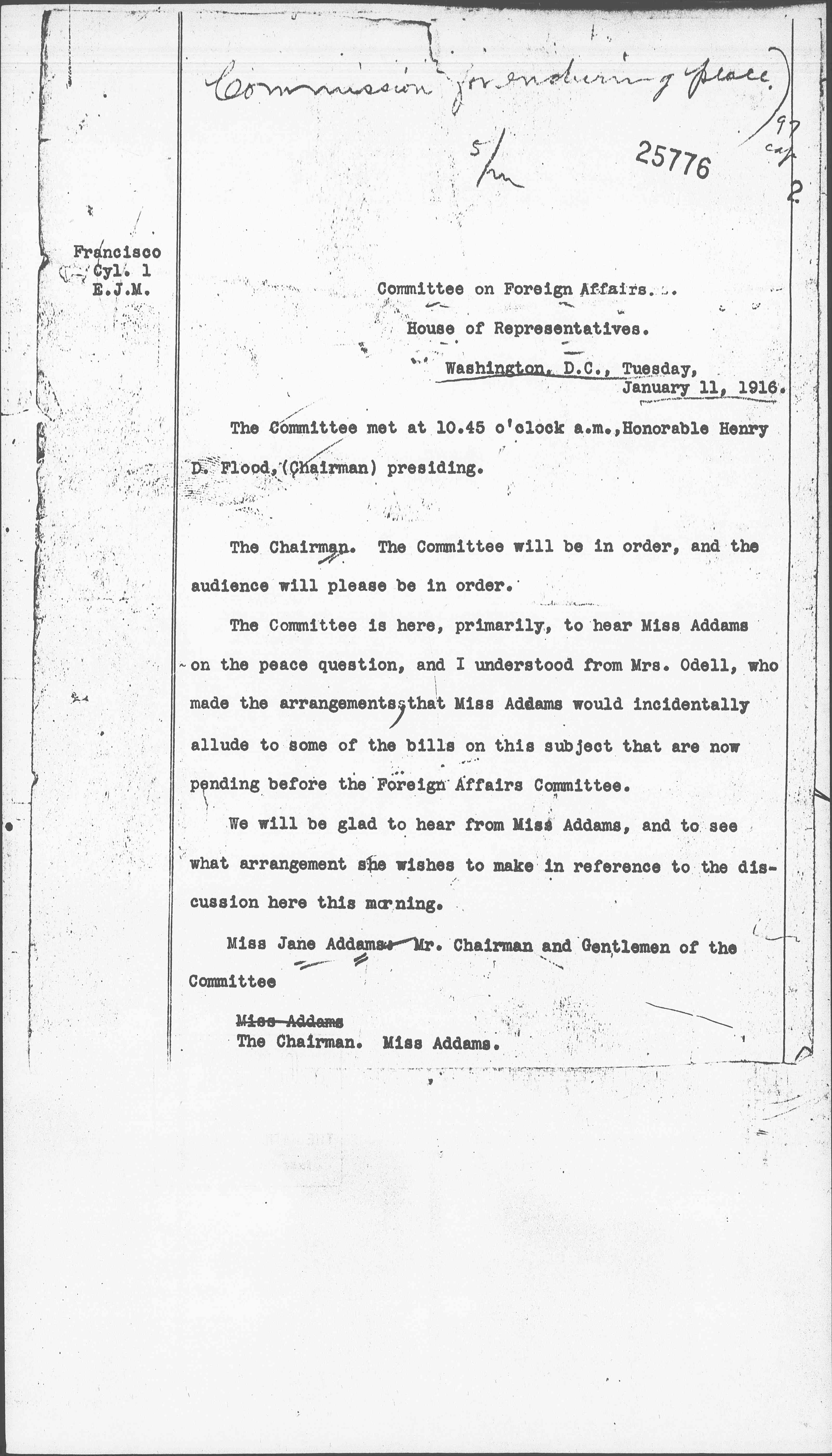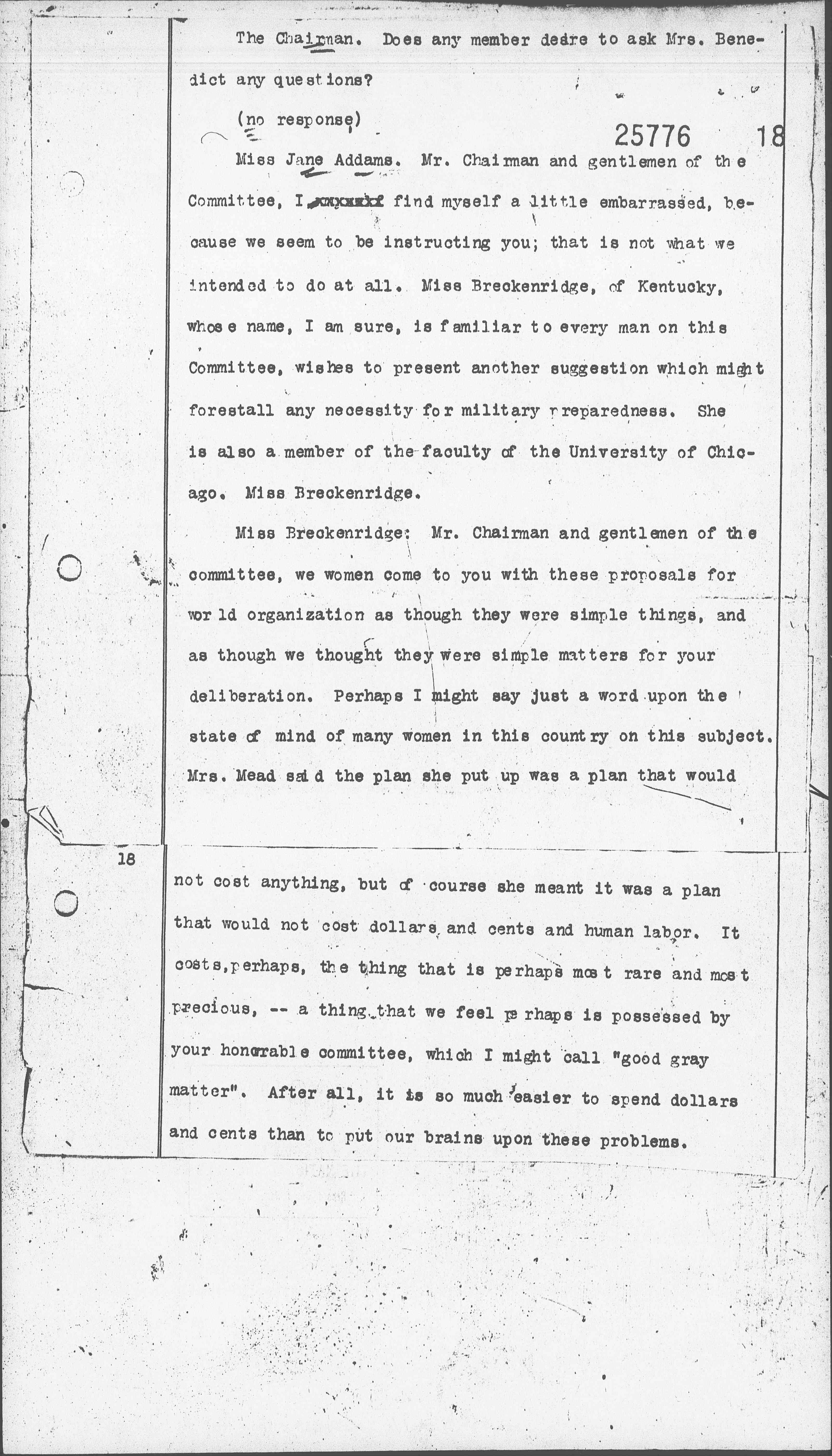 Miss Jane Addams. Mr. Chairman and gentlemen of the Committee, I [illegible] find myself a little embarrassed, because we seem to be instructing you; that is not what we intended to do at all. Miss [Breckinridge], of Kentucky, whose name, I am sure, is familiar to every man on this Committee, wishes to present another suggestion which might forestall any necessity for military preparedness. She is also a member of the faculty of the University of Chicago, Miss Breckenridge.