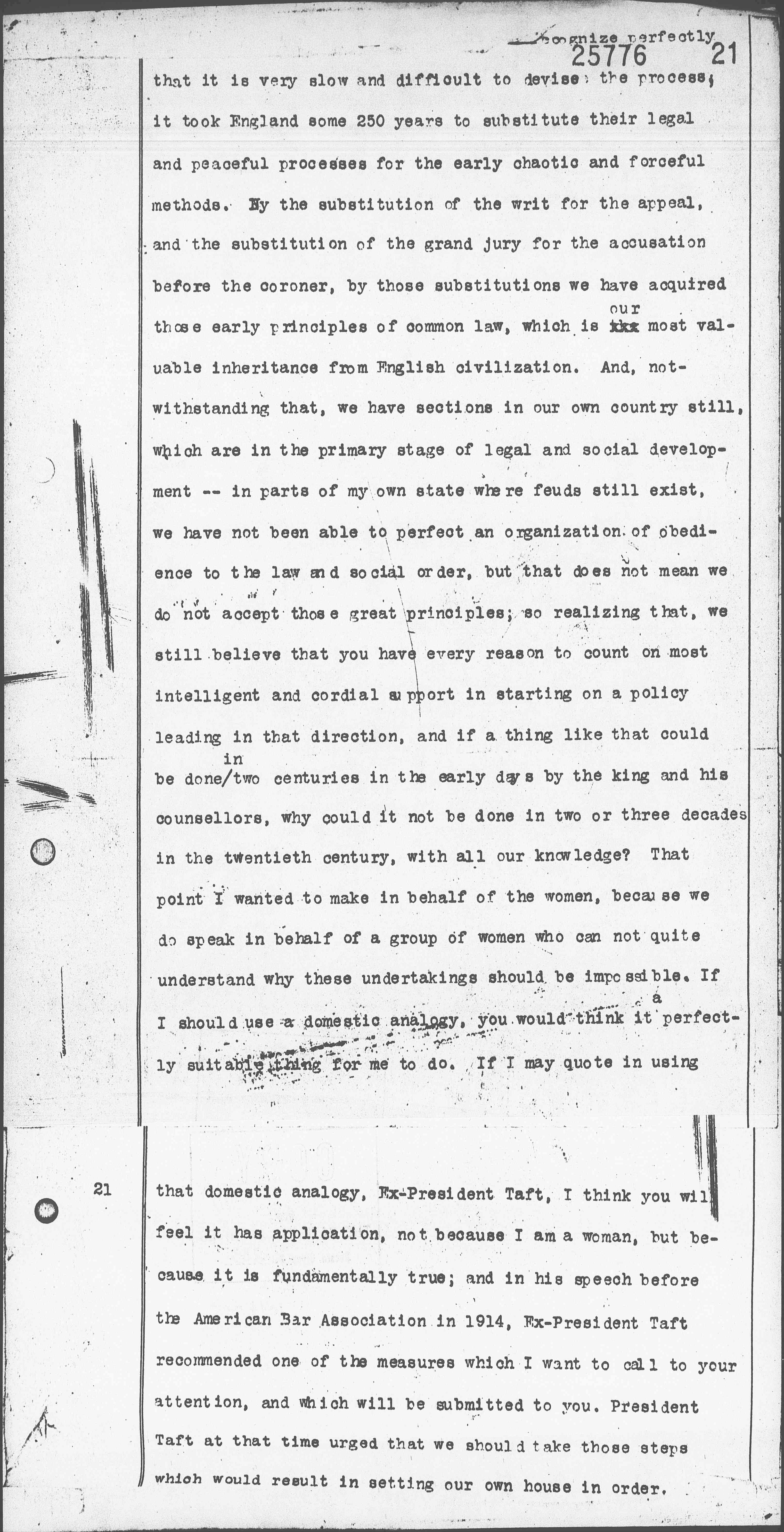 [We?] recognize perfectly that it is very slow and difficult to devise the process; it took England some 250 years to substitute their legal and peaceful processes for the early chaotic and forceful methods. By the substitution of the writ for the appeal, and the substitution of the grand jury for the accusation before the coroner, by those substitutions we have acquired those early principles of common law, which is [illegible] ↑our↓ most valuable inheritance from English civilization. And, notwithstanding that, we have sections in our own country still, which are in the primary stage of legal and social development -- in parts of my own state where feuds still exist, we have not been able to perfect an organization of obedience to the law and social order, but that does not mean we do not accept those great principles; so realizing that, we still believe that you have every reason to count on most intelligent and cordial support in starting on a policy leading in that direction, and if a thing like that could be done ↑in↓ two centuries in the early days by the king and his counsellors, why could it not be done in two or three decades in the twentieth century, with all our knowledge? That point I wanted to make in behalf of the women, because we do speak in behalf of a group of women who can not quite understand why these undertakings should be impossible. If I should use a domestic analogy, you would think it ↑a↓ perfectly suitable thing for me to do. If I may quote in using that domestic analogy, Ex-President Taft, I think you will feel it has application, not because I am a woman, but because it is fundamentally true; and in his speech before the American Bar Association in 1914, Ex-President Taft recommended one of the measures which I want to call to your attention, and which will be submitted to you. President Taft at that time urged that we should take those steps which would result in setting our own house in order. [page 24]
