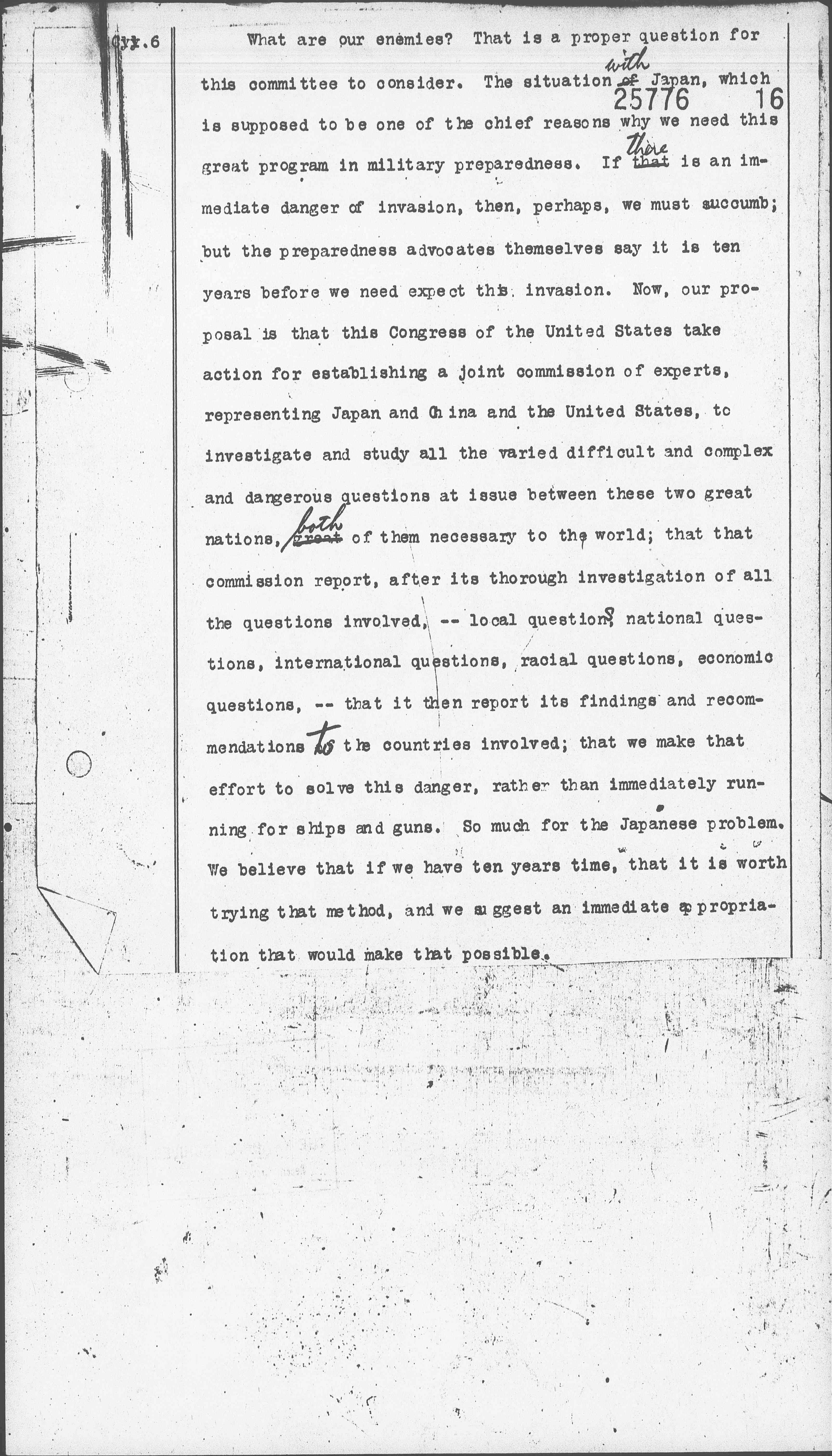 What are our enemies? That is a proper question for this committee to consider. The situation of ↑with↓ Japan, which is supposed to be one of the chief reasons why we need this great program in military preparedness. If that ↑there↓ is an immediate danger of invasion, then, perhaps, we must succumb; but the preparedness advocates themselves say it is ten years before we need expect this invasion. Now, our proposal is that this Congress of the United States take action for establishing a joint commission of experts, representing Japan and China and the United States, to investigate and study all the varied difficult and complex and dangerous questions at issue between these two great nations, great ↑both↓ of them necessary to the world; that that commission report, after its thorough investigation of all the questions involved, -- local questions, national questions, international questions, racial questions, economic questions, -- that it then report its findings and recommendations to the countries involved; that we make that effort to solve this danger, rather than immediately running for ships and guns. So much for the Japanese problem. We believe that if we have ten years time, that it is worth trying that method, and we suggest an immediate appropriation that would make that possible. [page 18]