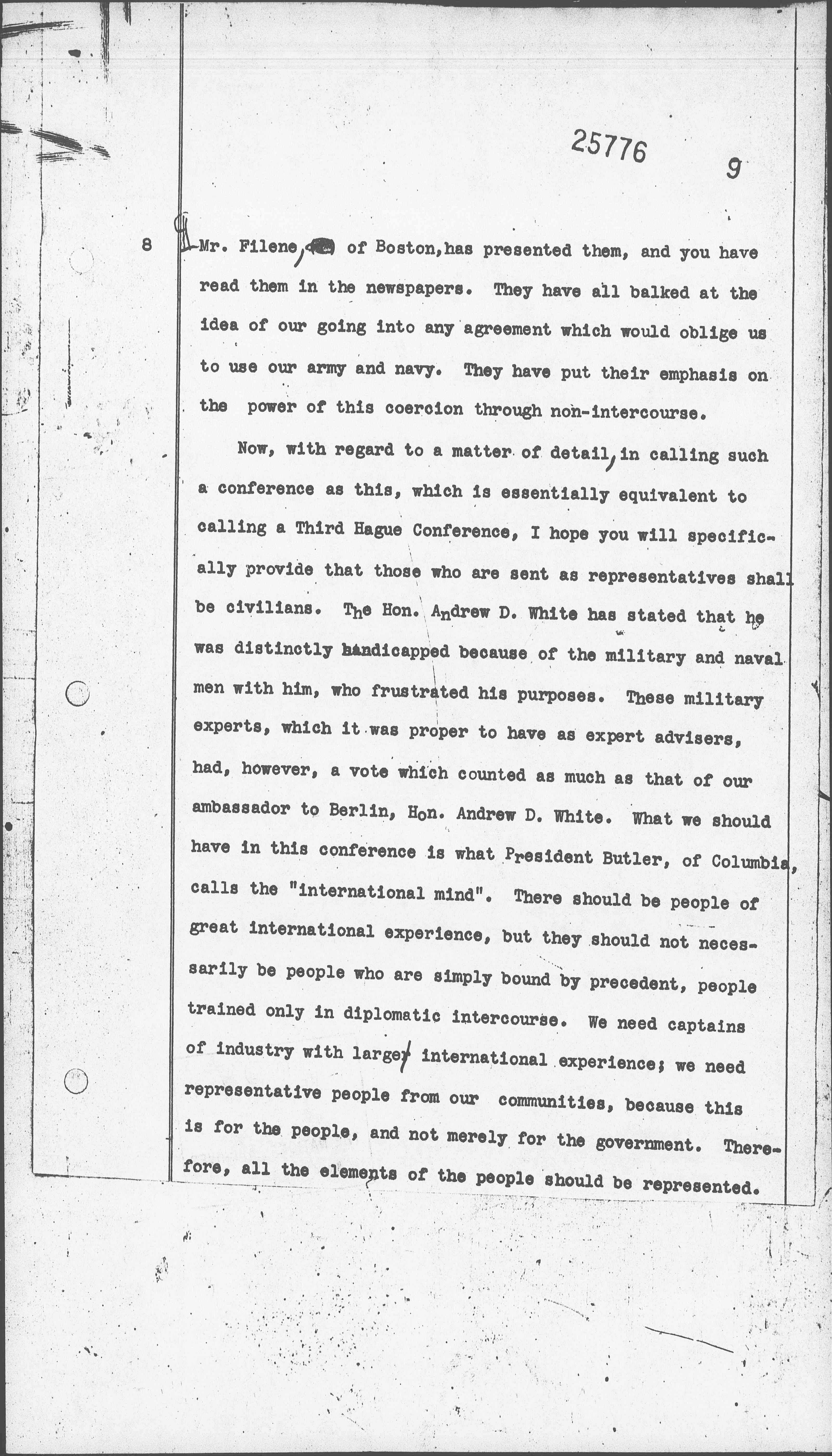 Now, with regard to a matter of detail, in calling such a conference as this, which is essentially equivalent to calling a Third Hague Conference, I hope you will specifically provide that those who are sent as representatives shall be civilians. The Hon. Andrew D. White has stated that he was distinctly handicapped because of the military and naval men with him, who frustrated his purposes. These military experts, which it was proper to have as expert advisers, had, however, a vote which counted as much as that of our ambassador to Berlin, Hon. Andrew D. White. What we should have in this conference is what President Butler, of Columbia, calls the “international mind”. There should be people of great international experience, but they should not necessarily be people who are simply bound by precedent, people trained only in diplomatic intercourse. We need captains of industry with large international experience; we need representative people from our communities, because this is for the people, and not merely for the government. Therefore, all the elements of the people should be represented. [page 11]