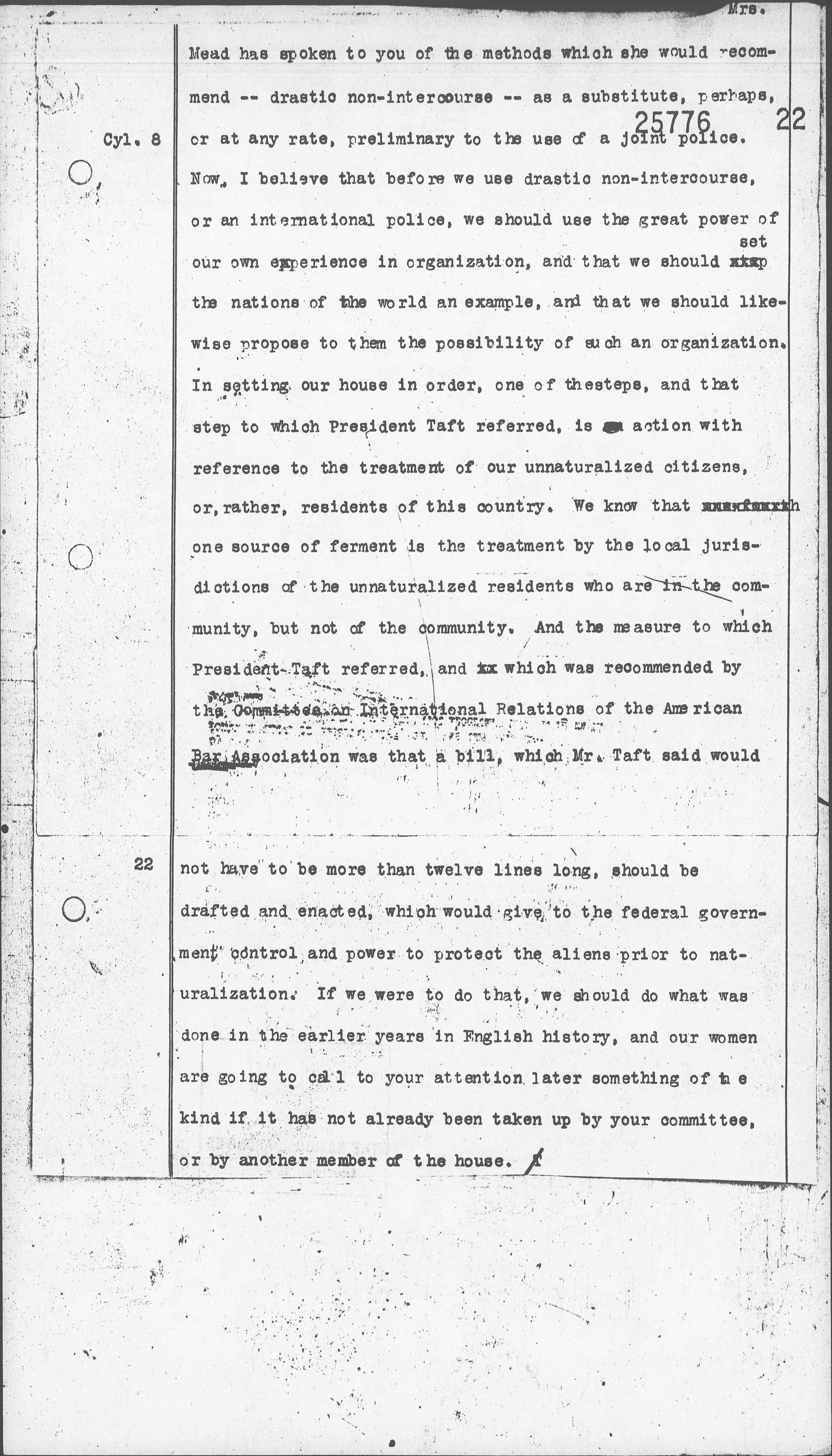 Mrs. Mead has spoken to you of the methods which she would recommend -- drastic non-intercourse -- as a substitute, perhaps, or at any rate, preliminary to the use of a joint police. Now, I believe that before we use drastic non-intercourse, or an international police, we should use the great power of our own experience in organization, and that we should [illegible] ↑set↓ the nations of the world an example, and that we should likewise propose to them the possibility of such an organization. In setting our house in order, one of the steps, and that step to which President Taft referred, is [illegible] action with reference to the treatment of our unnaturalized citizens, or, rather, residents of this country. We know that [illegible] one source of ferment is the treatment by the local jurisdictions of the unnaturalized residents who are in the community, but not of the community. And the measure to which President Taft referred, and [illegible] which was recommended by the Committee on International Relations of the American Bar Association was that a bill, which Mr. Taft said would not have to be more than twelve lines long, should be drafted and enacted, which would give to the federal government control and power to protect the aliens prior to naturalization. If we were to do that, we should do what was done in the earlier years in English history, and our women are going to call to your attention later something of the kind if it has not already been taken up by your committee, or by another member of the house. [page 25]