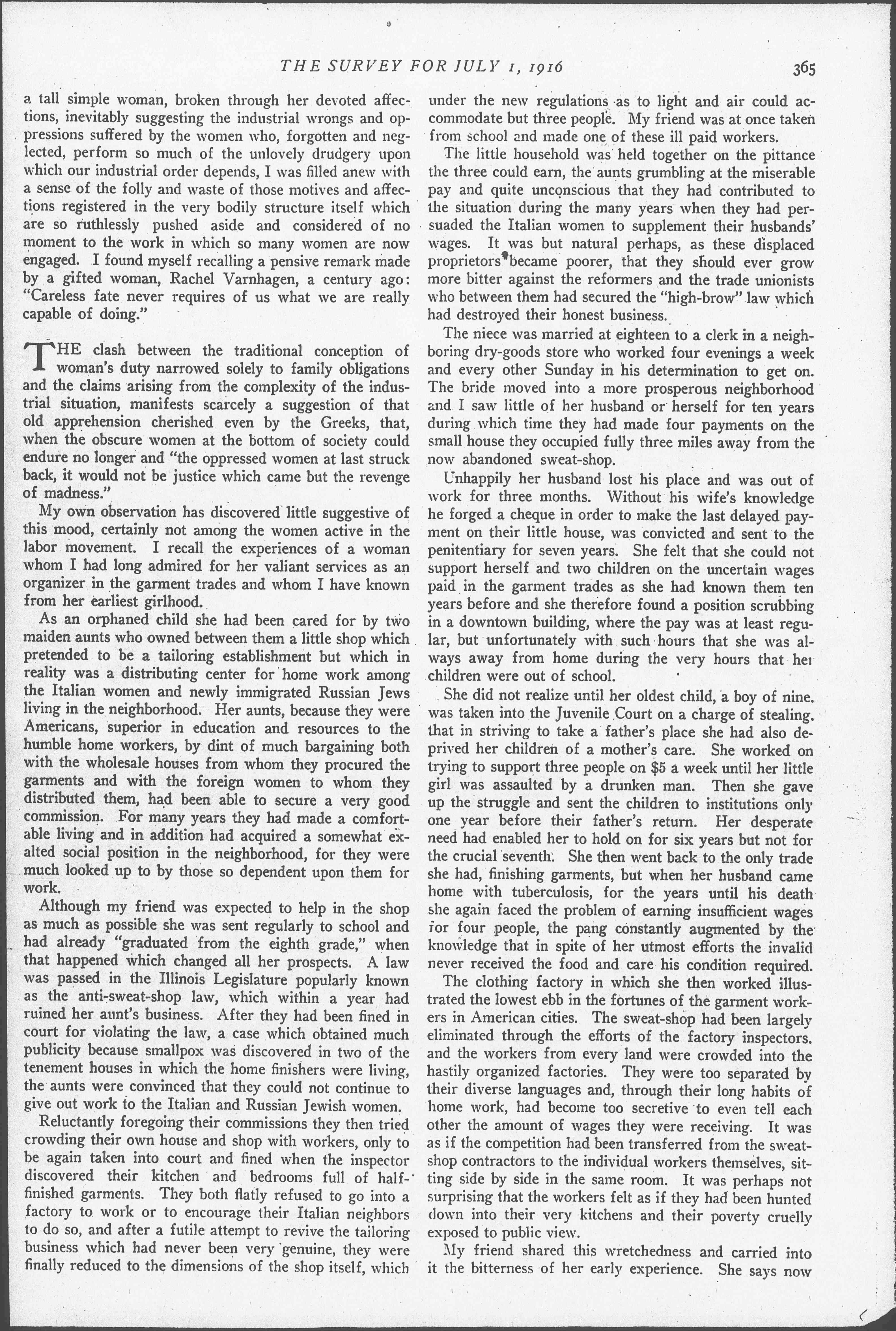 As an orphaned child she had been cared for by two maiden aunts who owned between them a little shop which pretended to be a tailoring establishment but which in reality was a distributing center for home work among the Italian women and newly immigrated Russian Jews living in the neighborhood. Her aunts, because they were Americans, superior in education and resources to the humble home workers, by dint of much bargaining both with the wholesale houses from whom they procured the garments and with the foreign women to whom they distributed them, had been able to secure a very good commission. For many years they had made a comfortable living and in addition had acquired a somewhat exalted social position in the neighborhood, for they were much looked up to by those so dependent upon them for work.