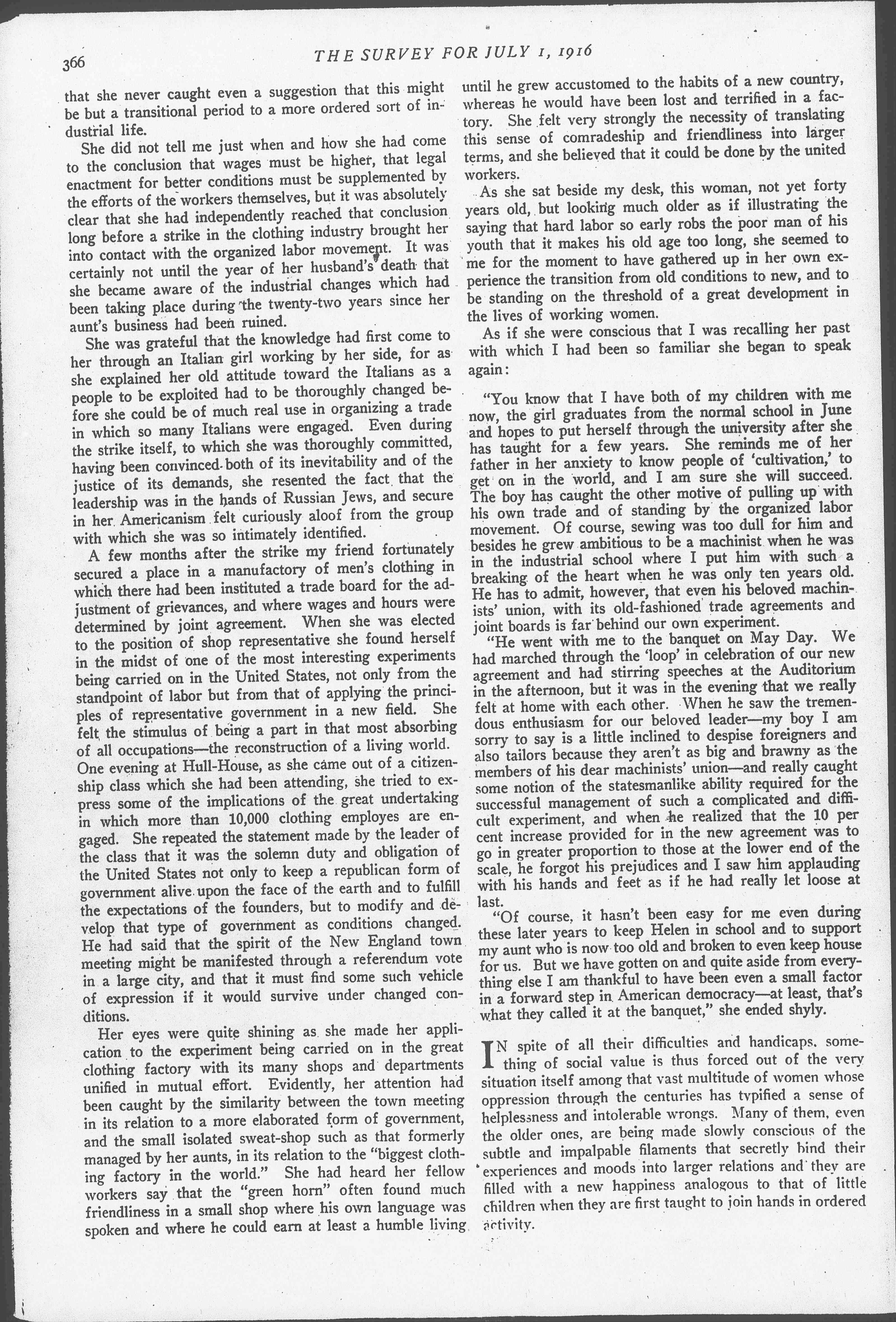A few months after the strike my friend fortunately secured a place in a manufactory of men's clothing in which there had been instituted a trade board for the adjustment of grievances, and where wages and hours were determined by joint agreement. When she was elected to the position of shop representative she found herself in the midst of one of the most interesting experiments being carried on in the United States, not only from the standpoint of labor but from that of applying the principles of representative government in a new field. She felt the stimulus of being a part in that most absorbing of all occupations -- the reconstruction of a living world. One evening at Hull-House, as she came out of a citizenship class which she had been attending, she tried to express some of the implications of the great undertaking in which more than 10,000 clothing [employees] are engaged. She repeated the statement made by the leader of the class that it was the solemn duty and obligation of the United States not only to keep a republican form of government alive upon the face of the earth and to fulfill the expectations of the founders, but to modify and develop that type of government as conditions changed. He had said that the spirit of the New England town meeting might be manifested through a referendum vote in a large city, and that it must find some such vehicle of expression if it would survive under changed conditions.