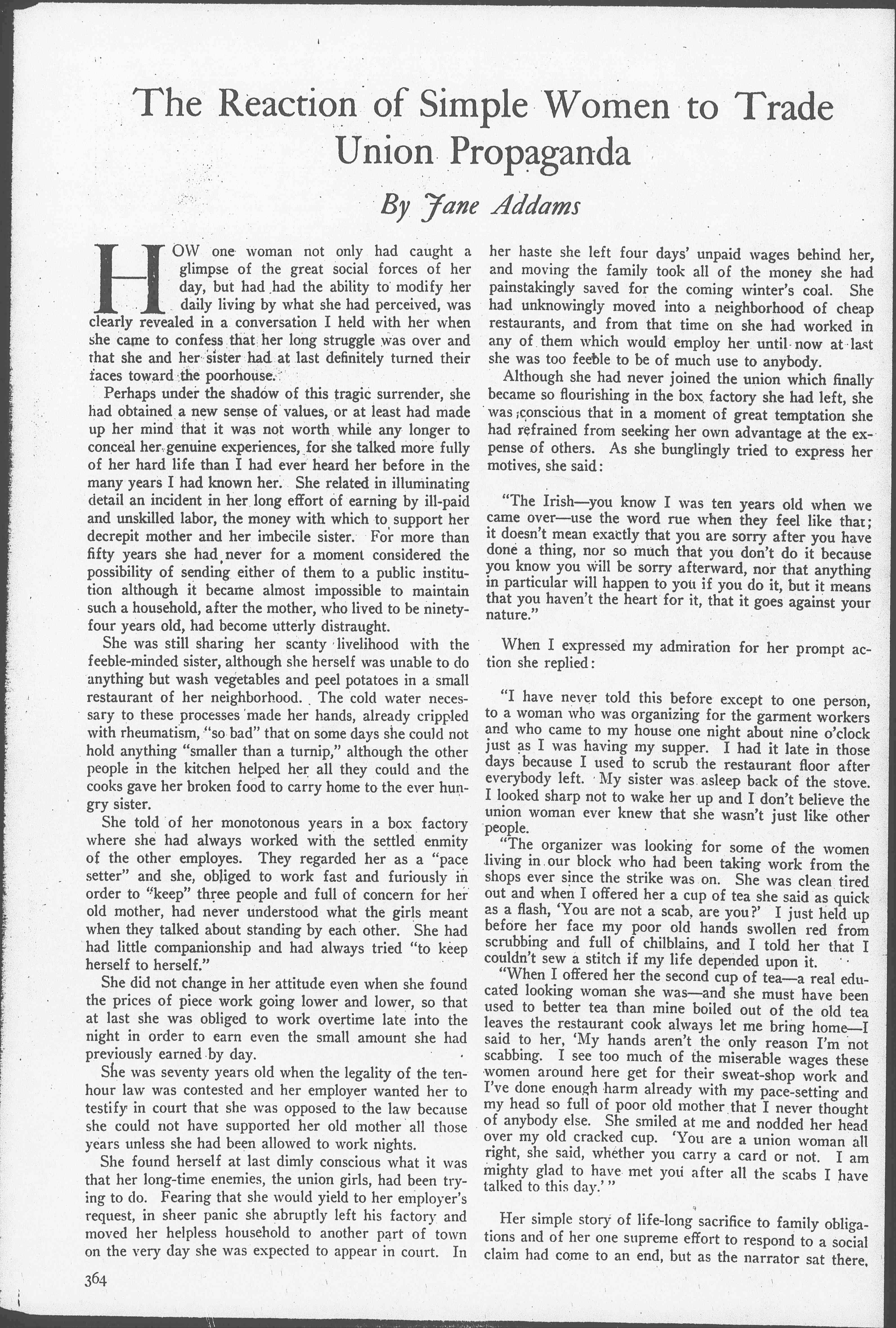 "When I offered her the second cup of tea -- a real educated looking woman she was -- and she must have been used to better tea than mine boiled out of the old tea leaves the restaurant cook always let me bring home -- I said to her, 'My hands aren't the only reason I'm not scabbing. I see too much of the miserable wages these women around here get for their sweat-shop work and I've done enough harm already with my pace-setting and my head so full of poor old mother that I never thought of anybody else. She smiled at me and nodded her head over my old cracked cup. 'You are a union woman all right, she said, whether you carry a card or not. I am mighty glad to have met you after all the scabs I have talked to this day.'"