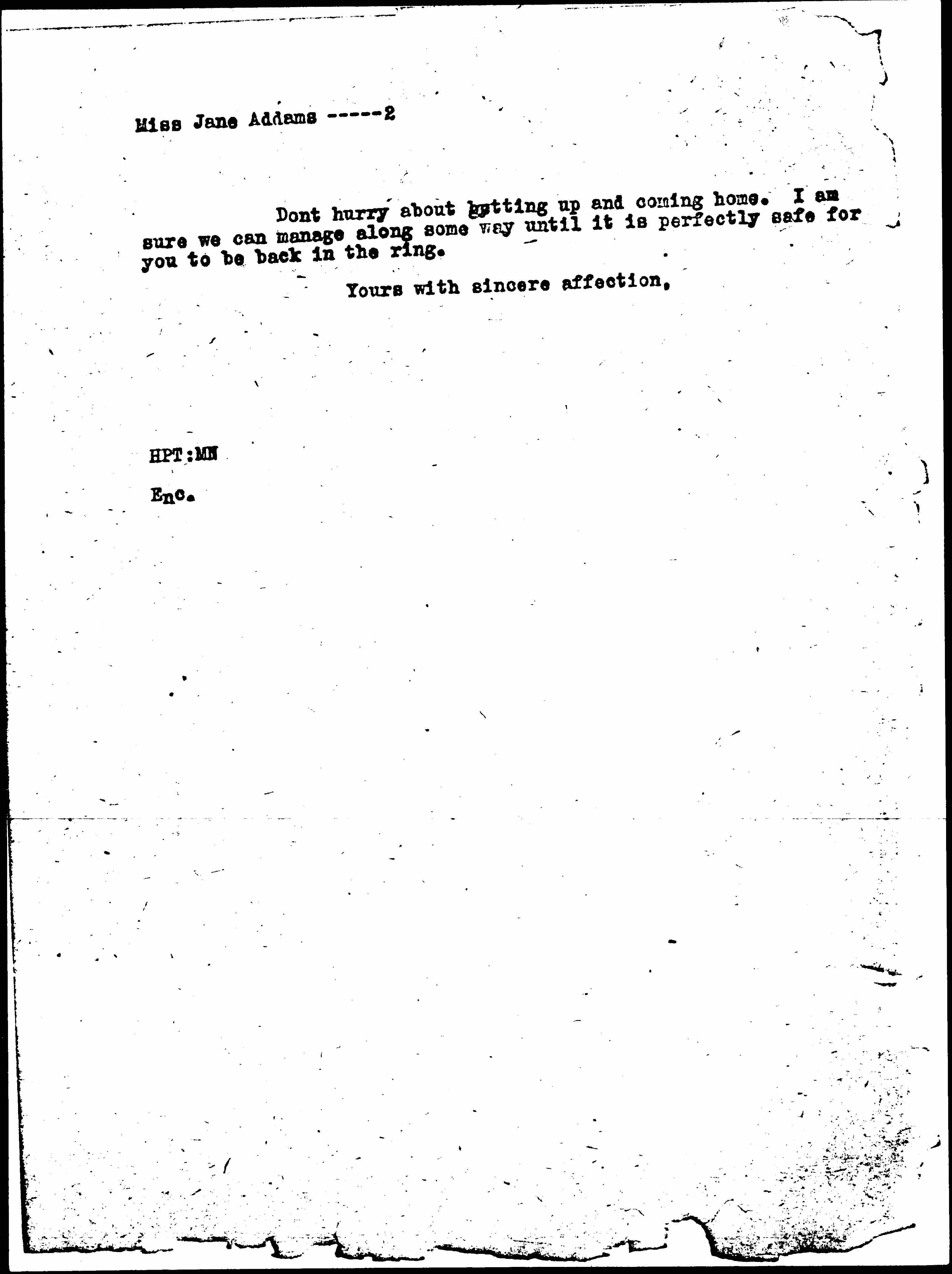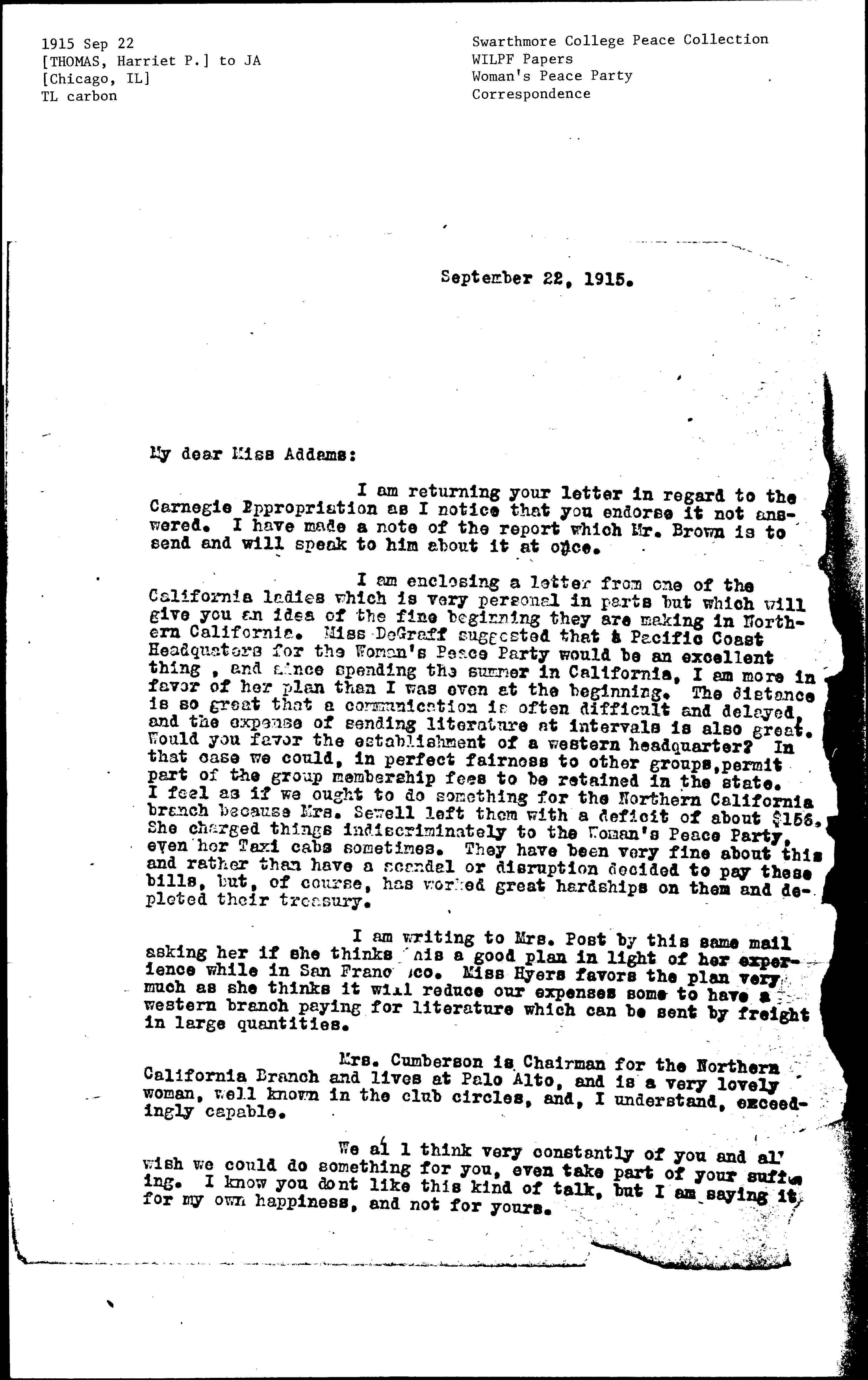 I am enclosing a letter from one of the California ladies which is very personal in parts but which will give you an idea of the fine beginning they are making in Northern California. Miss DeGraff suggested that a Pacific Coast Headquarters for the Woman's Peace Party would be an excellent thing, and since spending the summer in California, I am more in favor of her plan than I was even at the beginning. The distance is so great that a communication is often difficult and delayed, and the expense of sending literature at intervals is also great. Would you favor the establishment of a western headquarter? In that case we could, in perfect fairness to other groups, permit part of the group membership fees to be retained in the state. I feel as if we ought to do something for the Northern California branch because Mrs. [Sewall] left them with a deficit of about [$156]. She charged things indiscriminately to the Woman's Peace Party, and even her Taxi cabs sometimes. They have been very fine about this and rather than have a scandal or disruption decided to pay these bills, but, of course, has worked great hardships on them and depleted their treasury.