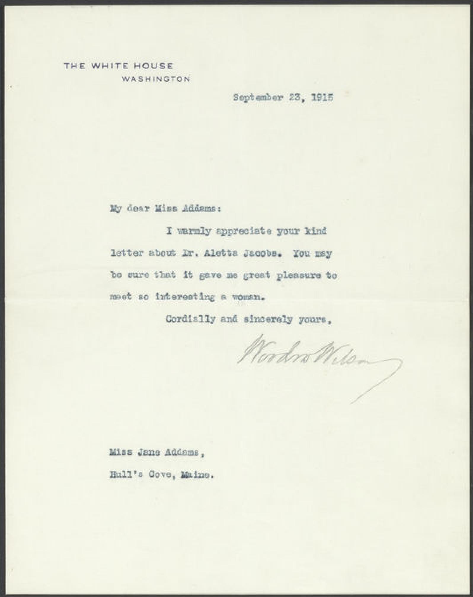 I warmly appreciate your kind letter about Dr. Aletta Jacobs. You may be sure that it gave me great pleasure to meet so interesting a woman.