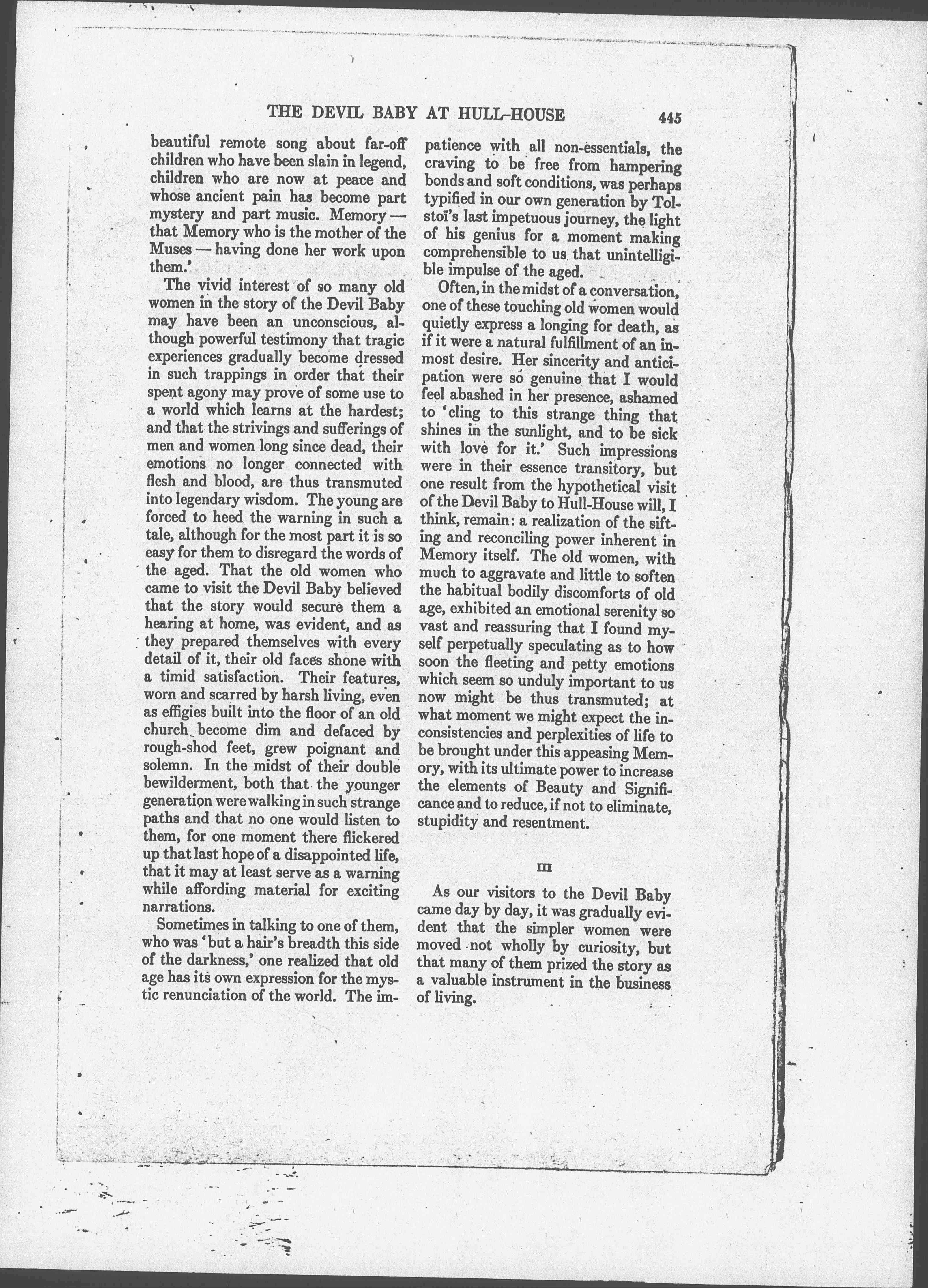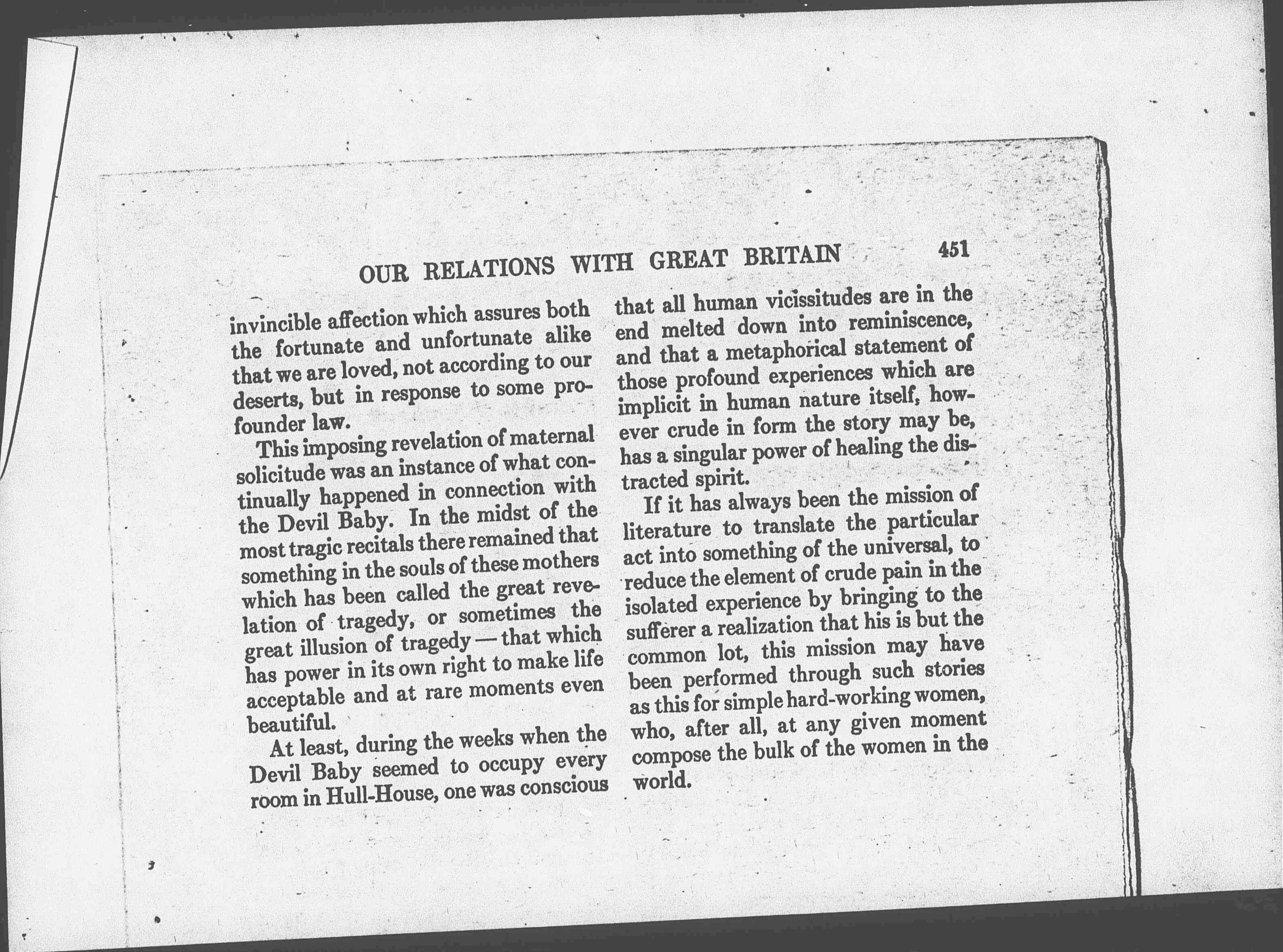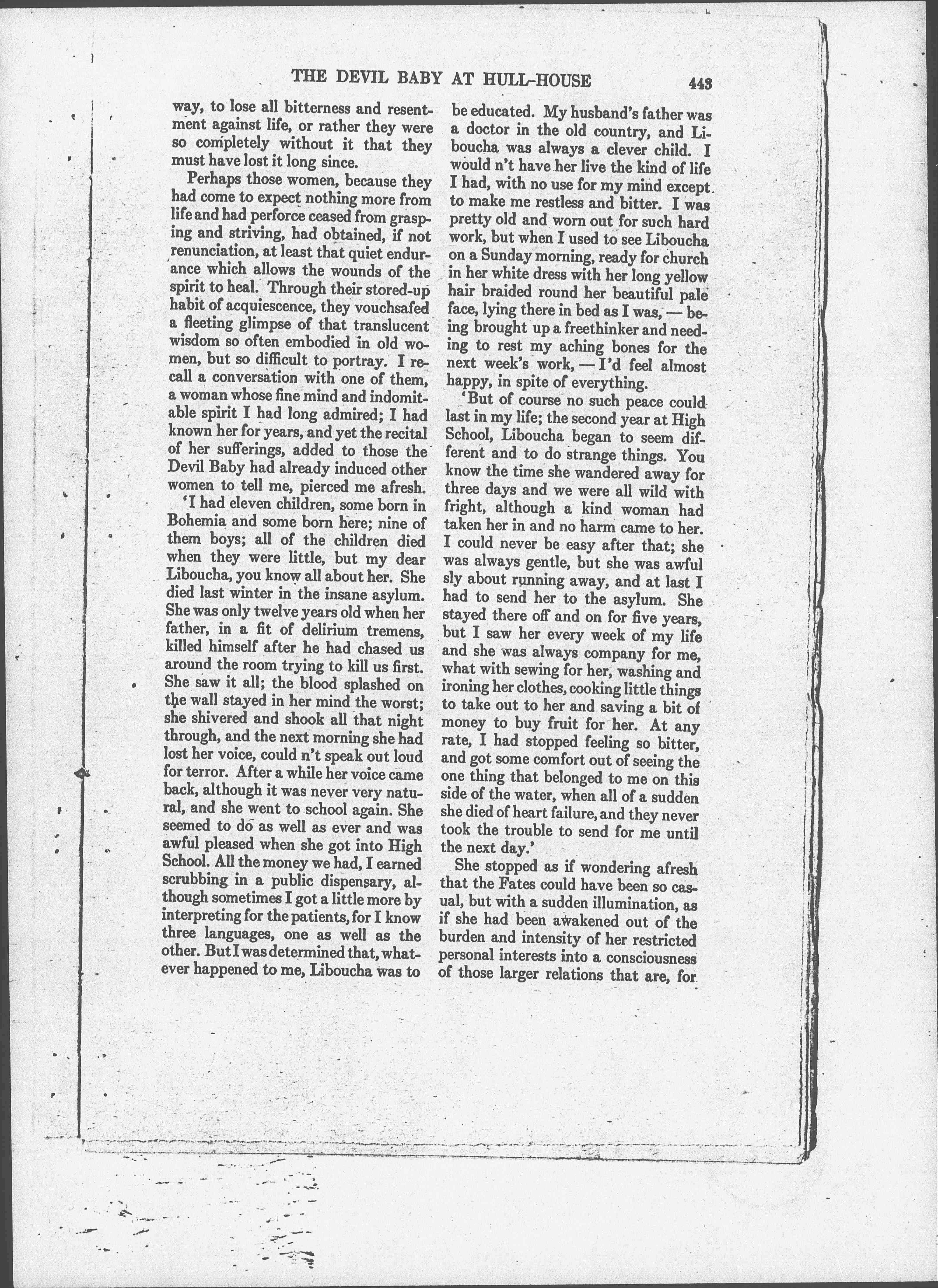 At least, during the weeks when the Devil Baby seemed to occupy every room in Hull-House, one was conscious that all human vicissitudes are in the end melted down into reminiscence, and that a metaphorical statement of those profound experiences which are implicit in human nature itself, however crude in form the story may be, has a singular power of healing the distracted spirit.