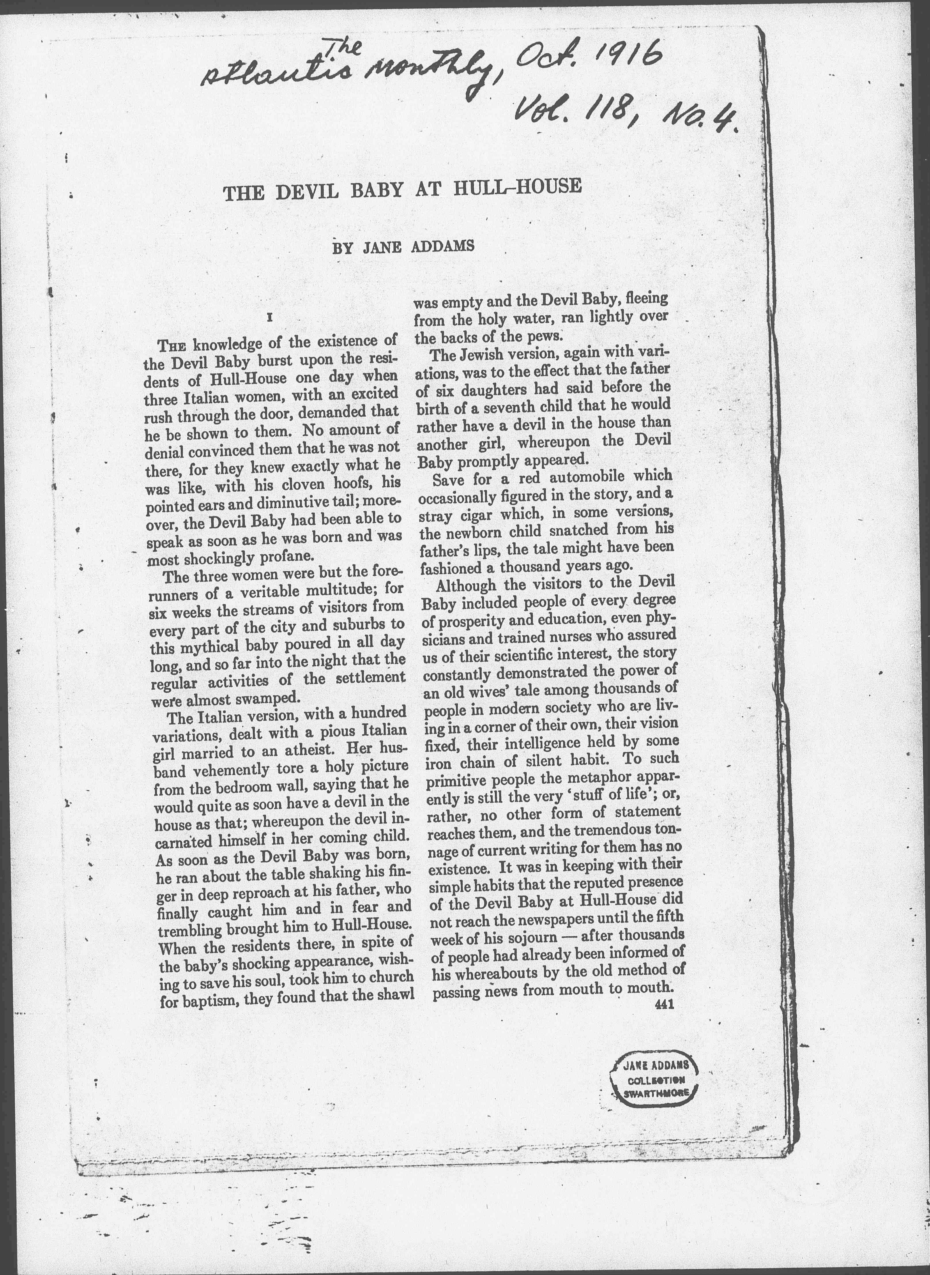 The knowledge of the existence of the Devil Baby burst upon the residents of Hull-House one day when three Italian women, with an excited rush through the door, demanded that he be shown to them. No amount of denial convinced them that he was not there, for they knew exactly what he was like, with his cloven hoofs, his pointed ears and diminutive tail; moreover, the Devil Baby had been able to speak as soon as he was born and was most shockingly profane.