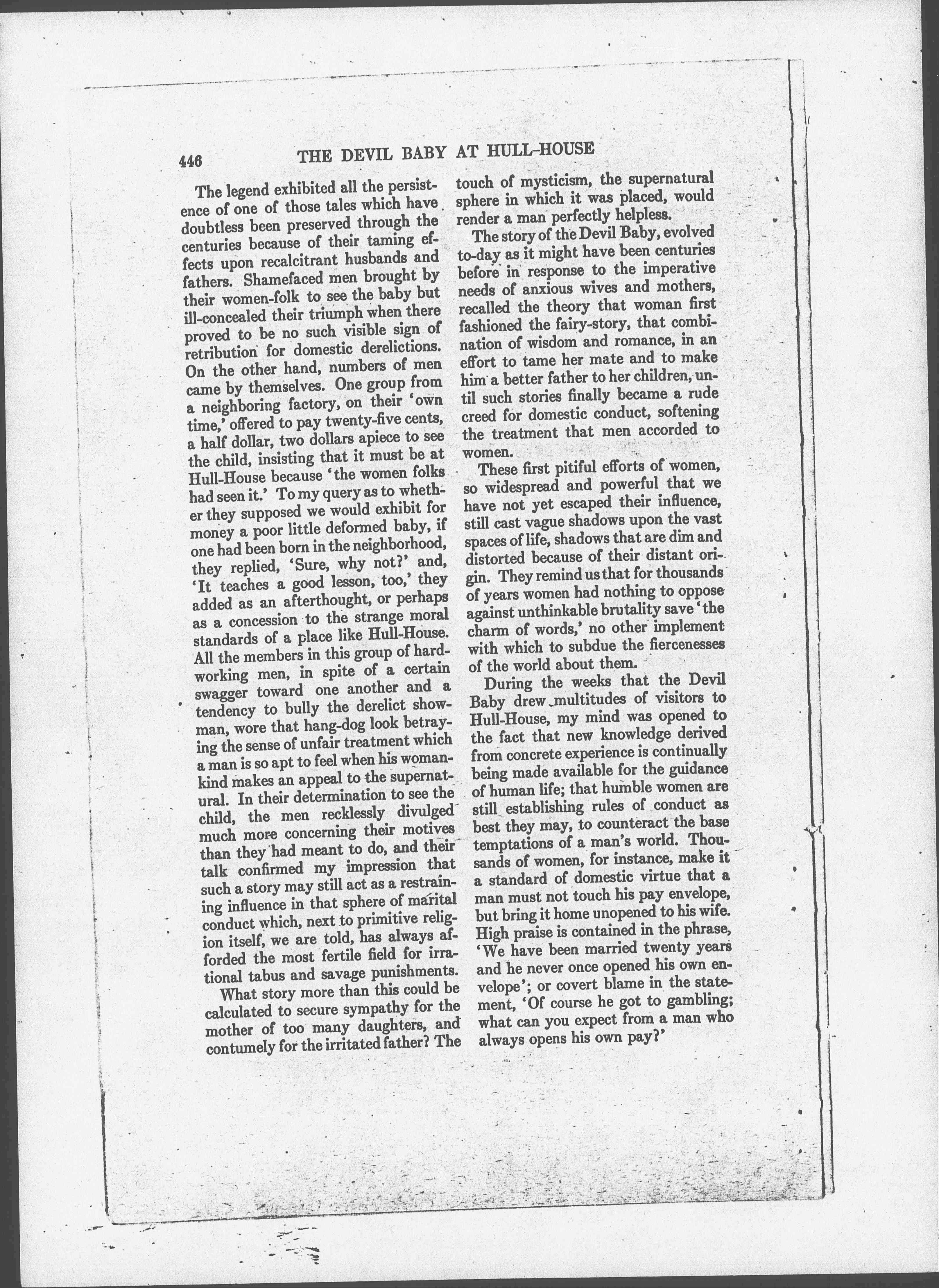 During the weeks that the Devil Baby drew multitudes of visitors to Hull-House, my mind was opened to the fact that new knowledge derived from concrete experience is continually being made available for the guidance of human life; that humble women are still establishing rules of conduct as best they may, to counteract the base temptations of a man's world. Thousands of women, for instance, make it a standard of domestic virtue that a man must not touch his pay envelope, but bring it home unopened to his wife. High praise is contained in the phrase, "We have been married twenty years and he never once opened his own envelope"; or covert blame in the statement, "Of course he got to gambling; what can you expect from a man who always opens his own pay?" [page 7]