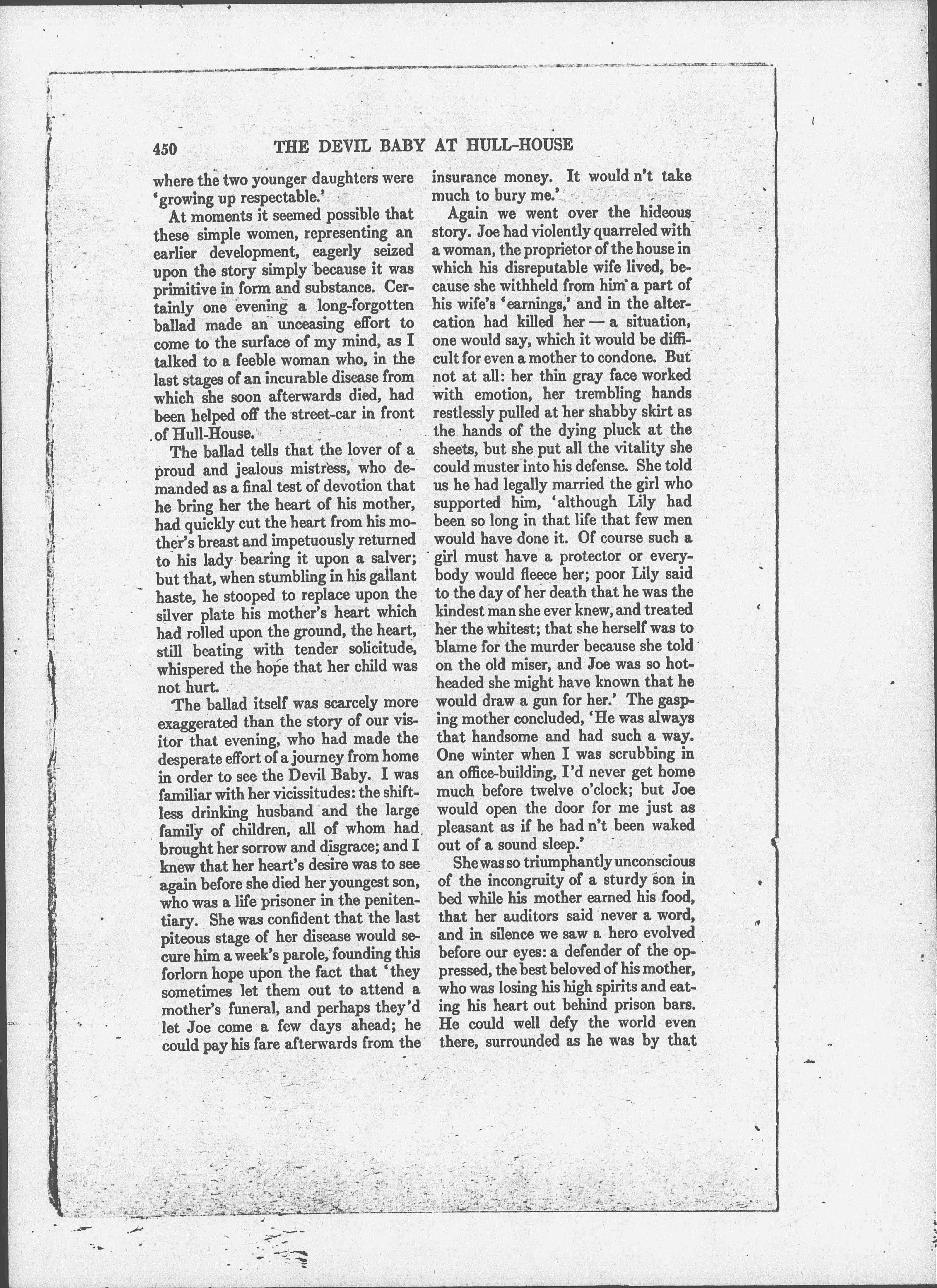 Because the Devil Baby embodied an undeserved wrong to a poor mother, whose tender child had been claimed by the forces of evil, his merely reputed presence had power to attract to Hull-House hundreds of women who had been humbled and disgraced by their children; mothers of the feeble-minded, of the vicious, of the criminal, of the prostitute. In their talk it was as if their long role of maternal apology and protective reticence had at last broken down; as if they could speak out freely because for once a man responsible for an ill-begotten child had been "met up with" and had received his deserts. Their sinister version of the story was that the father of the Devil Baby had married without confessing a hideous crime committed years before, thus basely deceiving both his innocent young bride and the good priest who performed the solemn ceremony; that the sin had become incarnate in his child which, to the horror of the young and trusting mother, had been born with all the outward aspects of the devil himself.