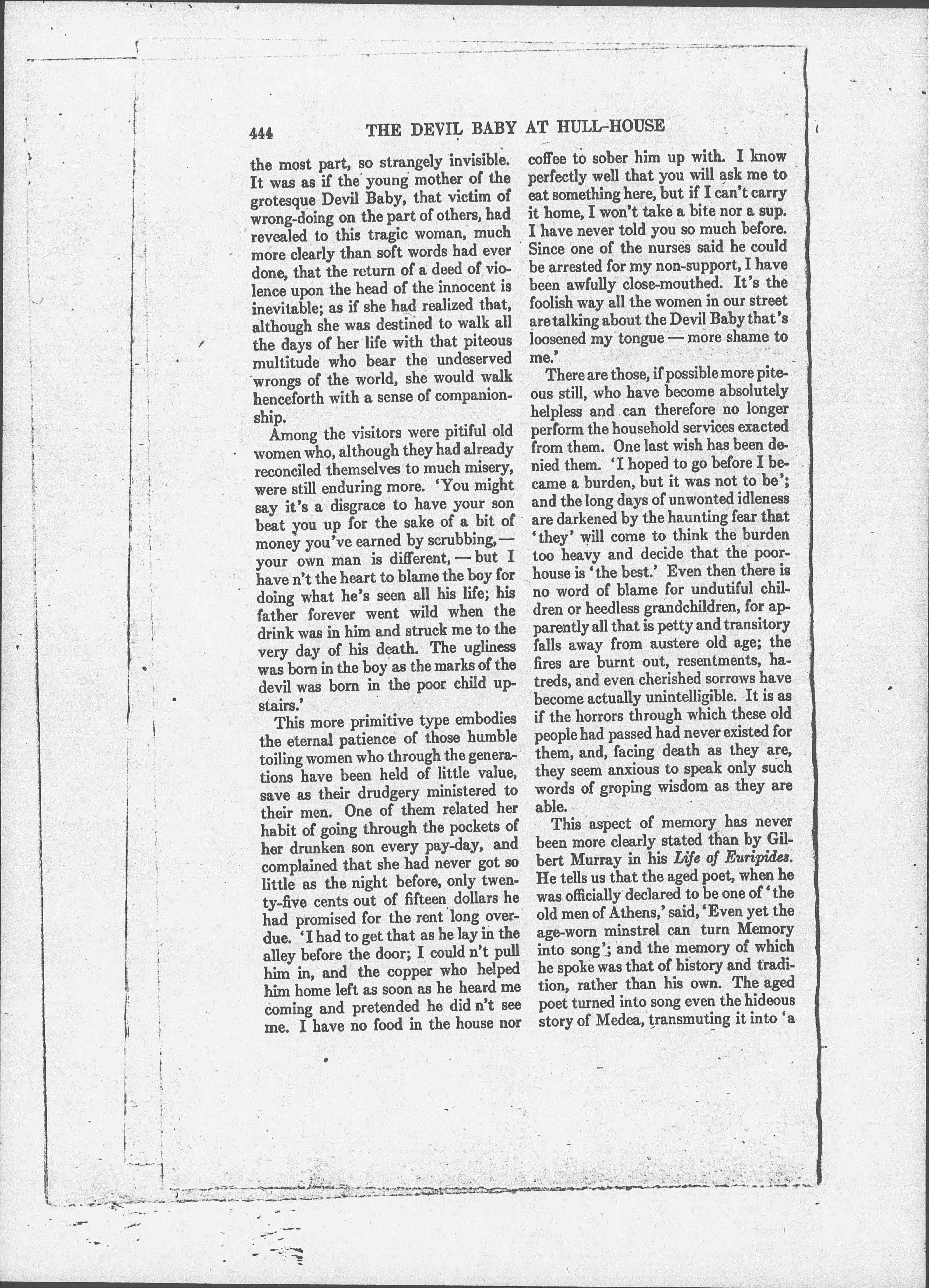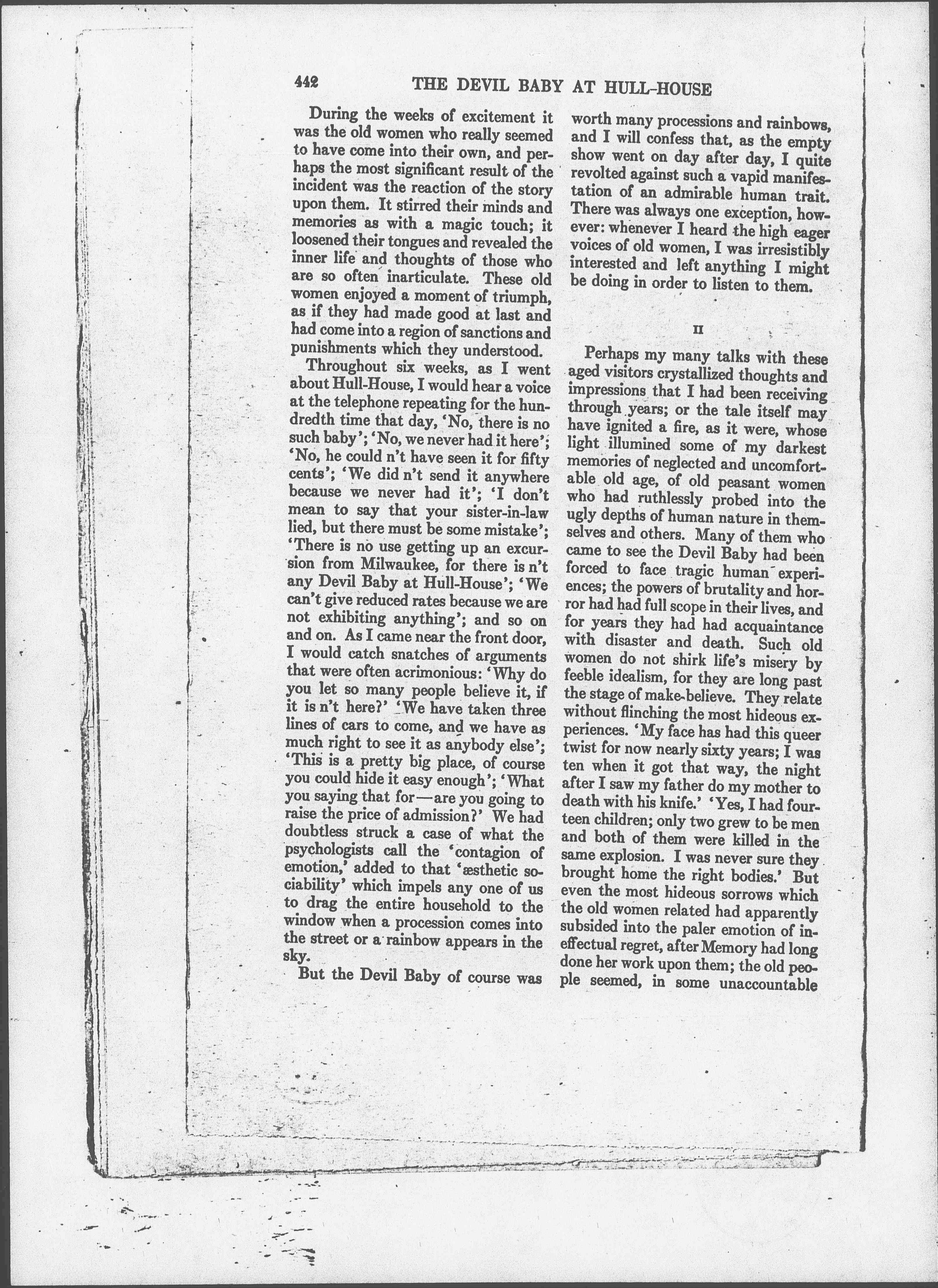 Although the visitors to the Devil Baby included people of every degree of prosperity and education, even physicians and trained nurses who assured us of their scientific interest, the story constantly demonstrated the power of an old wives' tale among thousands of people in modern society who are living in a corner of their own, their vision fixed, their intelligence held by some iron chain of silent habit. To such primitive people the metaphor apparently is still very "stuff of life"; or, rather, no other form of statement reaches them, and the tremendous tonnage of current writing for them has no existence. It was in keeping with their simple habits that the reputed presence of the Devil Baby at Hull-House did not reach the newspapers until the fifth week of his sojourn -- after thousands of people had already been informed of his whereabouts by the old method of passing news from mouth to mouth. [page 2]