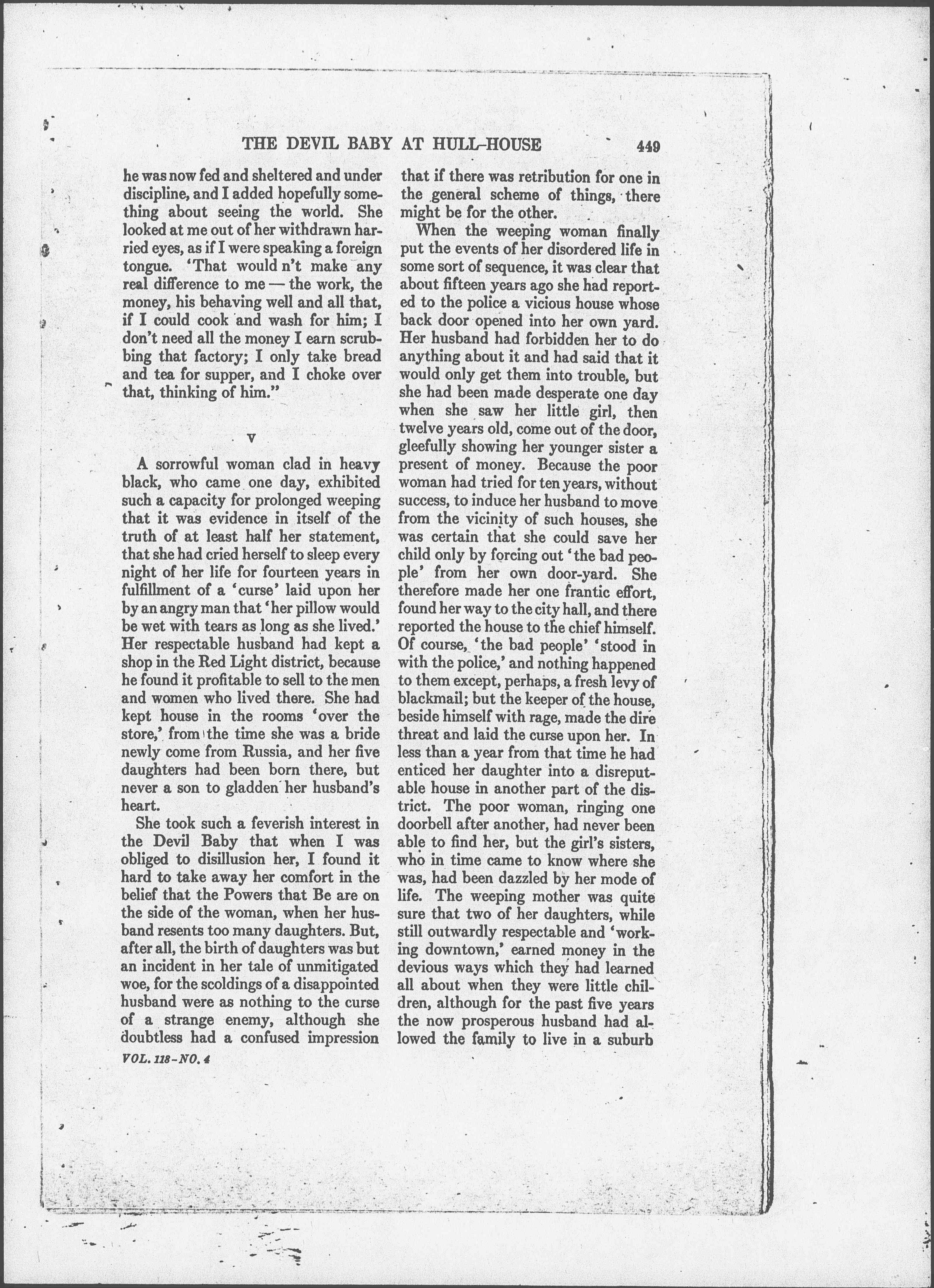 As if drawn by a magnet, week after week, a procession of forlorn women in search of the Devil Baby came to Hull-House from every part of the city, issuing forth from the many homes in which dwelt "the two unprofitable goddesses, Poverty and Impossibility." With an understanding quickened perhaps through my own acquaintance with the mysterious child, I listened to many tragic tales from the visiting women: of premature births, "because he kicked me in the side"; of children maimed and burned because "I had no one to leave them with when I went to [page 8] work." These women had seen the tender flesh of growing little bodies given over to death because "he wouldn't let me send for the doctor," or because "there was no money to pay for the medicine." But even these mothers, rendered childless through insensate brutality, were less pitiful than some of the others, who might well have cried aloud of their children as did a distracted mother of her child centuries ago, --