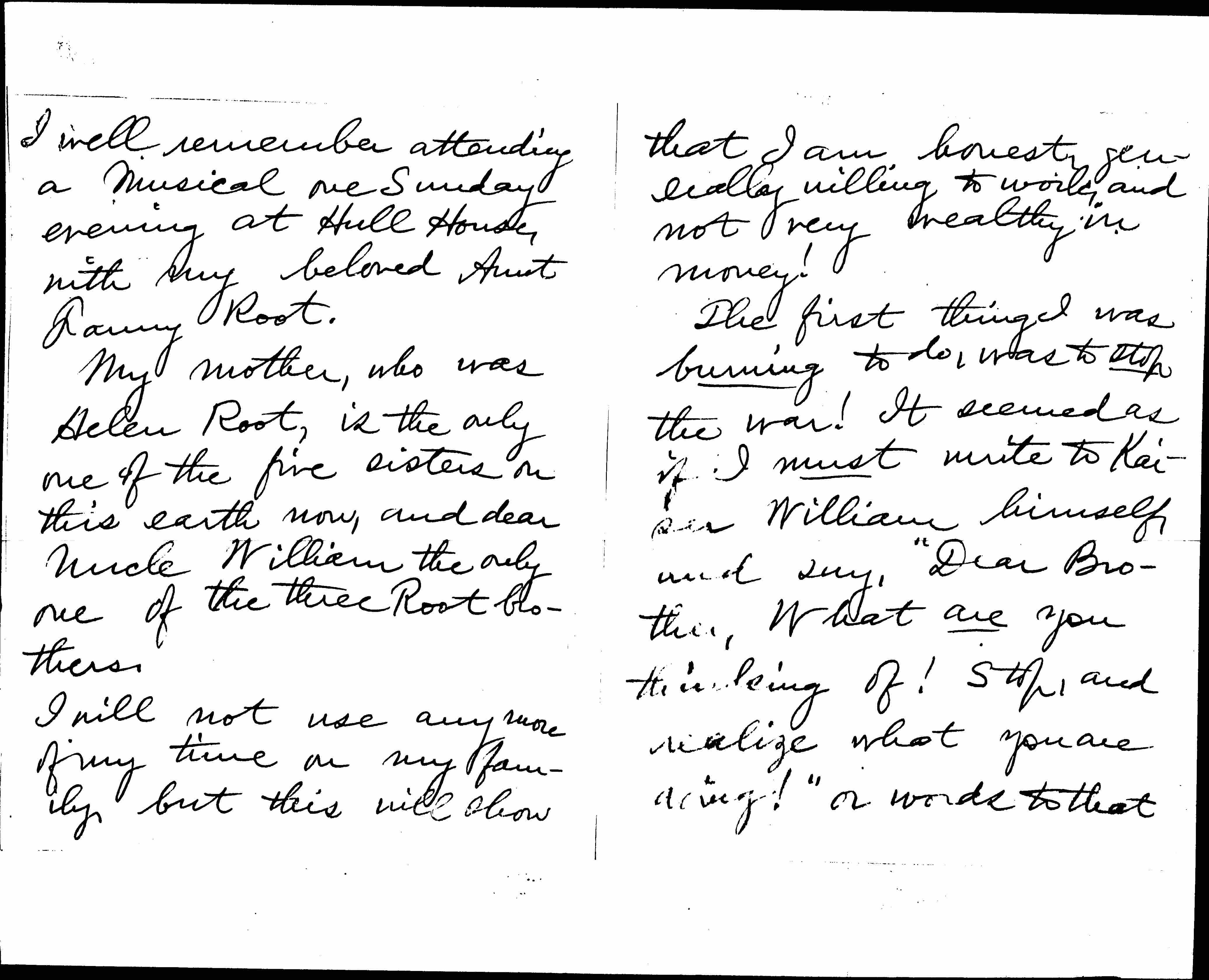 I have not told you yet (but do now) that [page 3] I well remember attending a musical one Sunday evening at Hull House, with my beloved Aunt Fanny Root.