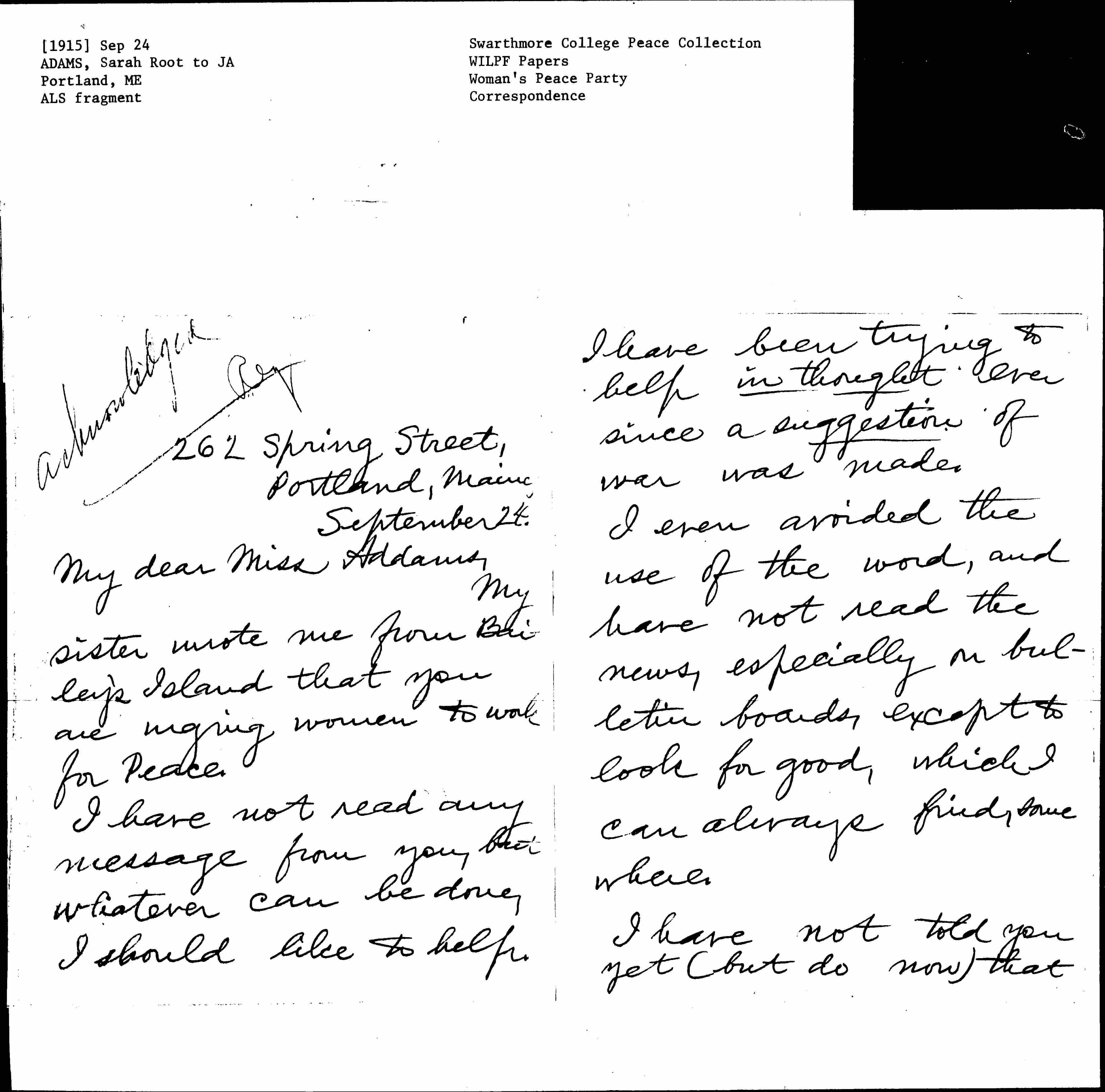 My sister wrote me from Bailey's Island that you are urging women to work for Peace.