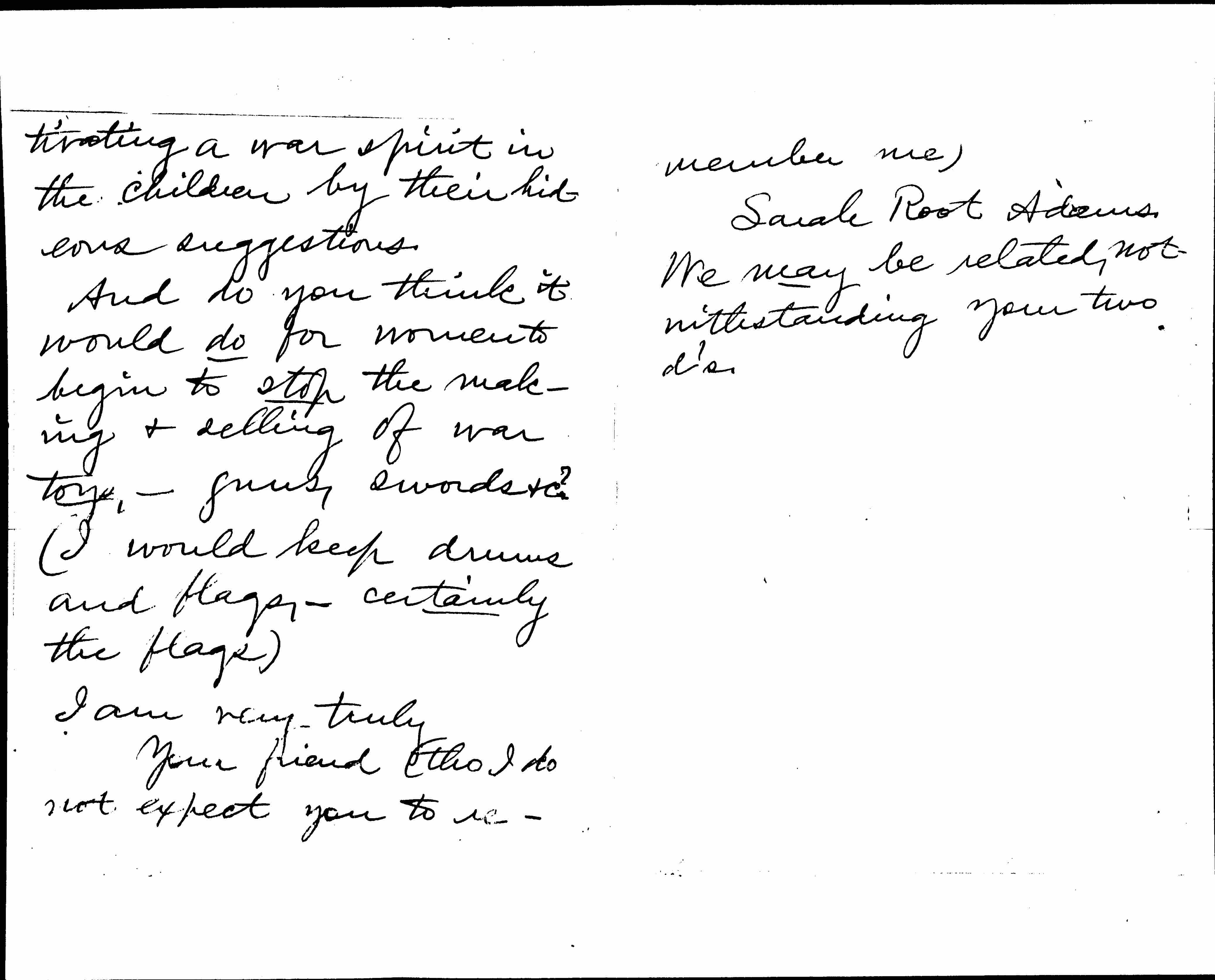 And do you think it would do for women to begin to stop the making & selling of war toys, -- guns, swords [etc.]? (I would keep drums and flags, -- certainly the flags)