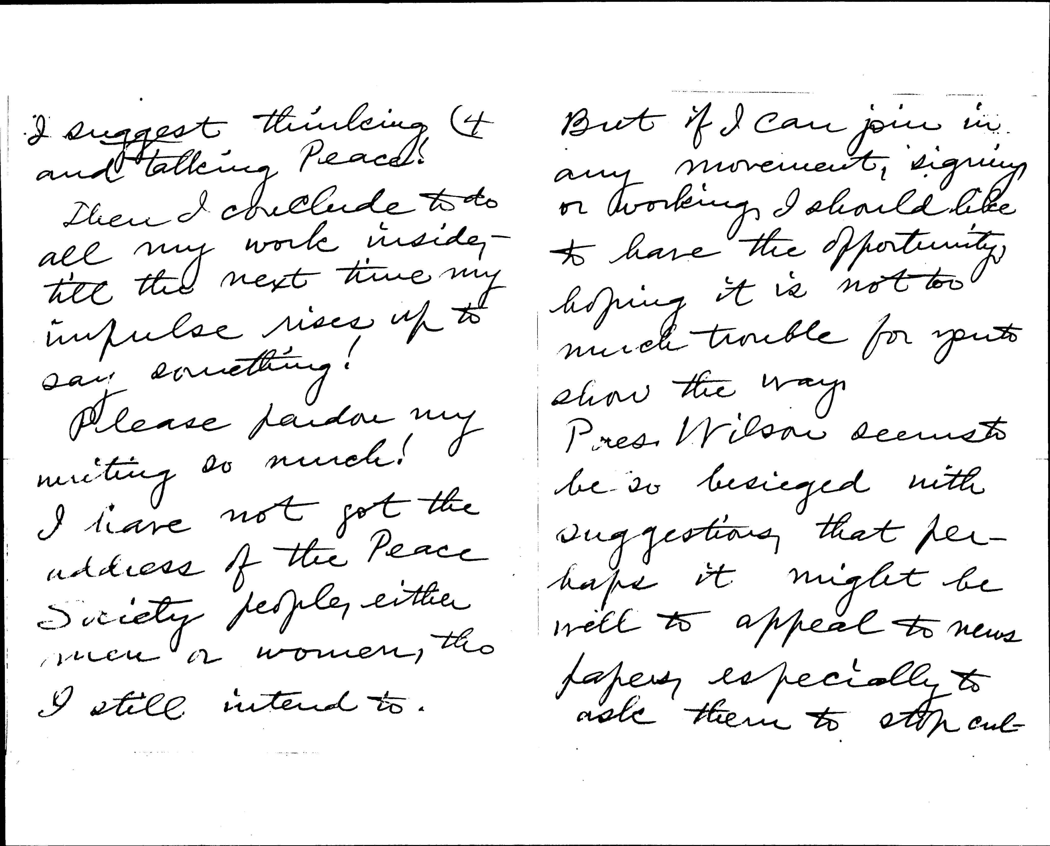 Pres. Wilson seems to be so besieged with suggestions, that perhaps it might be well to appeal to newspapers, especially to ask them to stop cultivating [page 13] a war spirit in the children by their hideous suggestions.