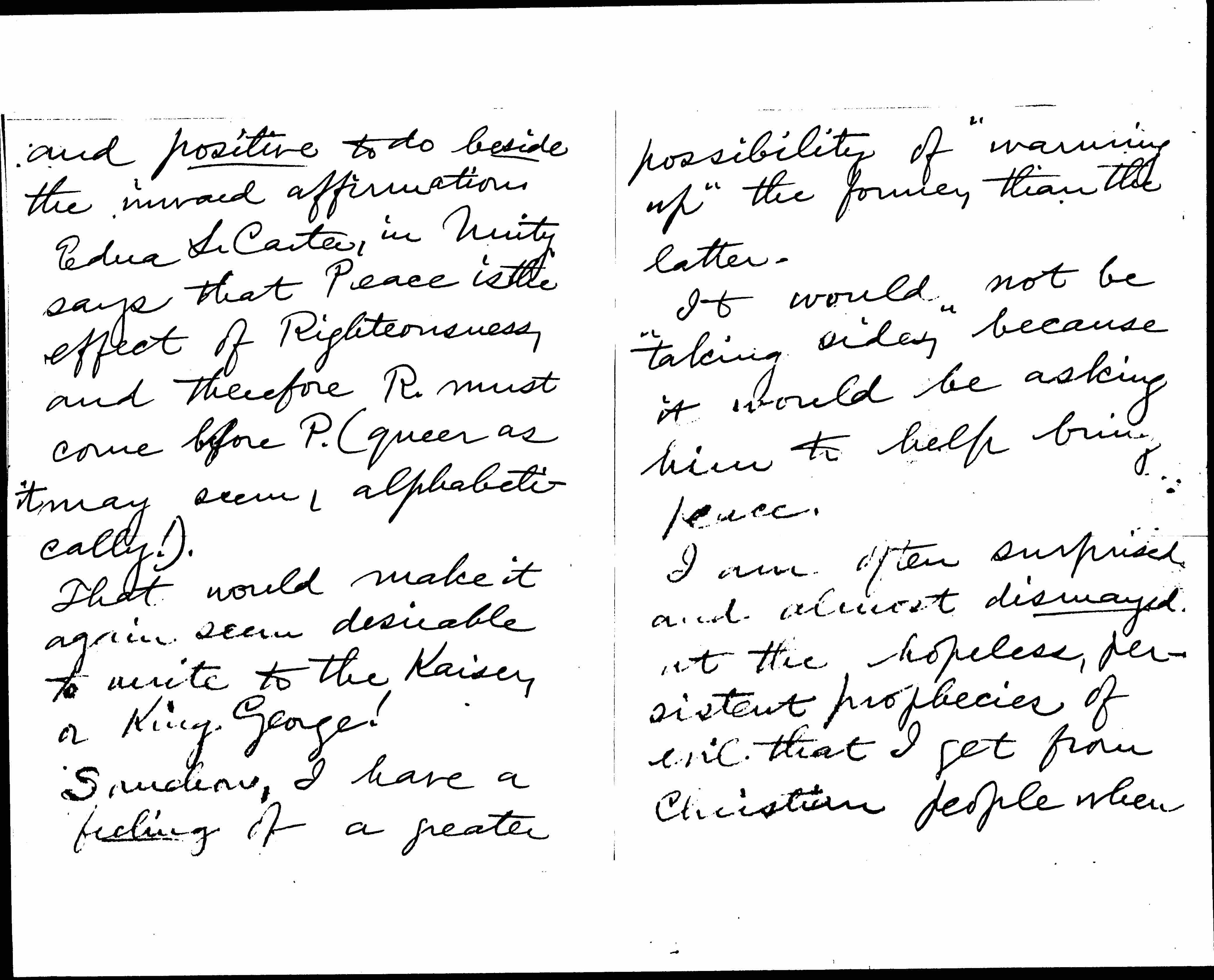 I am often surprised and almost dismayed at the hopeless, persistent prophecies of evil that I get from Christian people when [page 11] I suggest thinking and talking Peace!