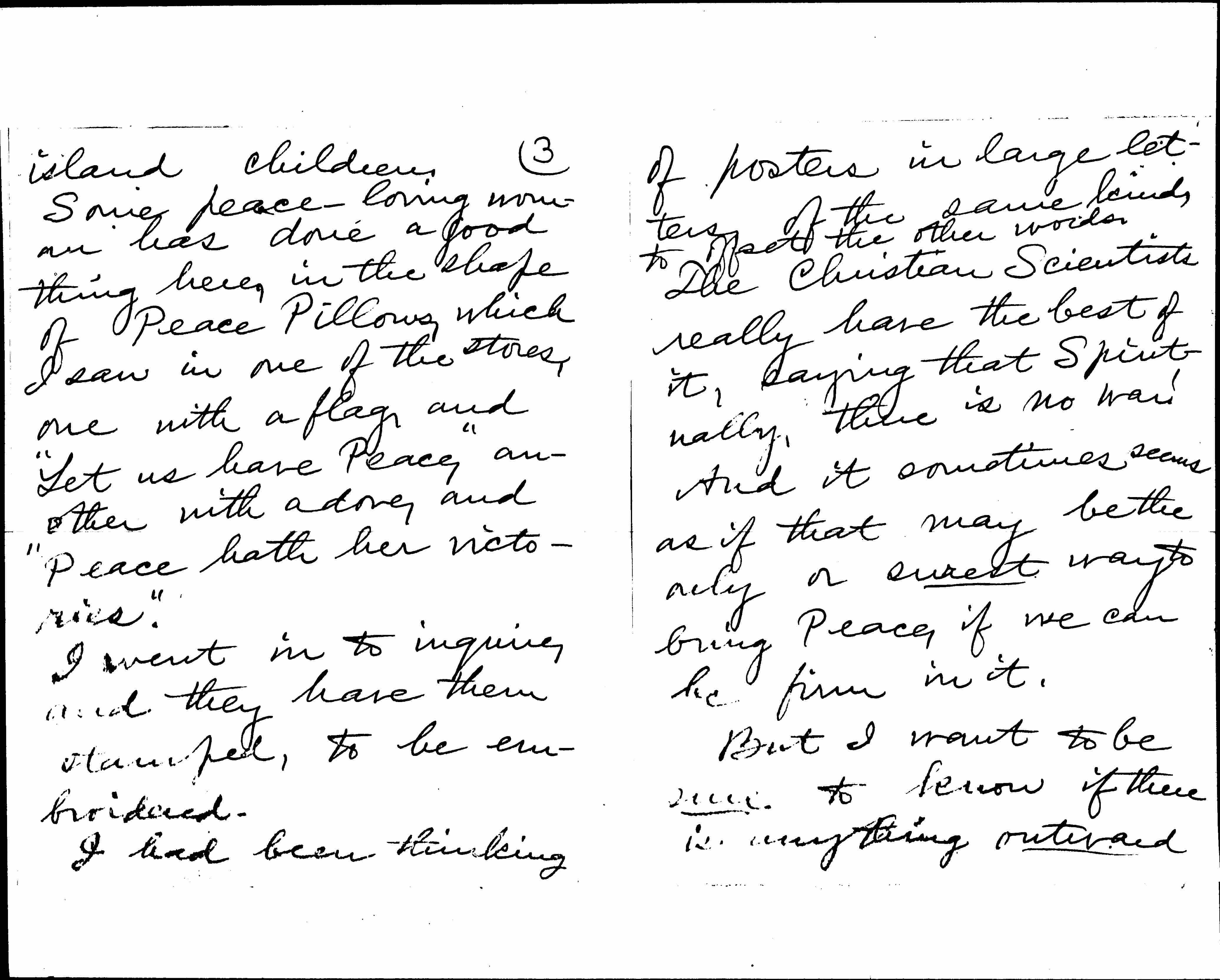 Some peace-loving woman has done a good thing here, in the shape of Peace Pillows, which I saw in one of the stores, one with a flag, and "Let us have Peace," another with a dove, and "Peace hath her victories."