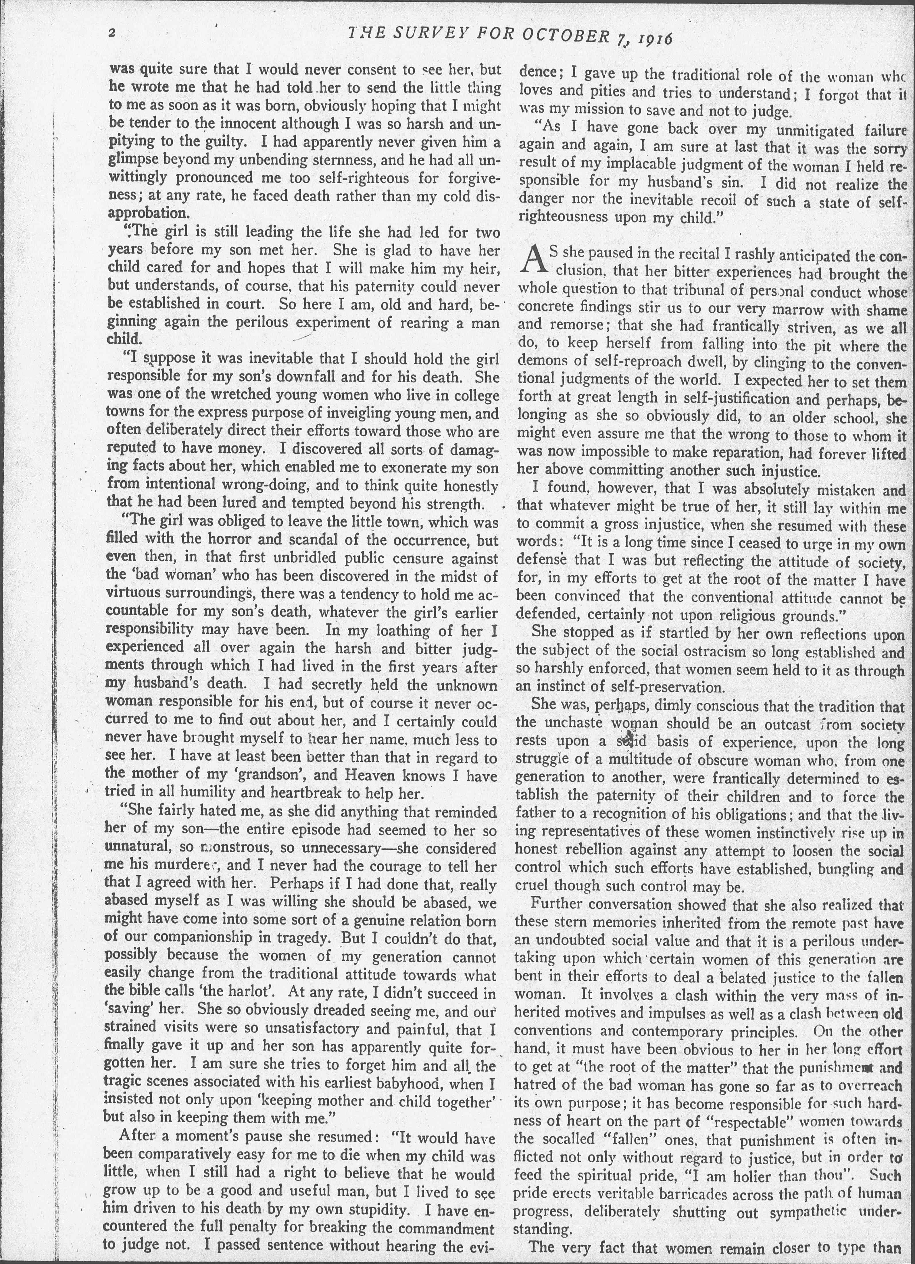 "She fairly hated me, as she did anything that reminded her of my son -- the entire episode had seemed to her so unnatural, so monstrous, so unnecessary -- she considered me his murderer, and I never had the courage to tell her that I agreed with her. Perhaps if I had done that, really abased myself as I was willing she should be abased, we might have come into some sort of genuine relation born of our companionship in tragedy. But I couldn't do that, possibly because the women of my generation cannot easily change from the traditional attitude towards what the bible calls 'the harlot'. At any rate, I didn't succeed in 'saving' her. She so obviously dreaded seeing me, and our strained visits were so unsatisfactory and painful, that I finally gave it up and her son has apparently quite forgotten her. I am sure she tries to forget him and all the tragic scenes associated with his earliest babyhood, when I insisted not only on 'keeping mother and child together' but also in keeping them with me."