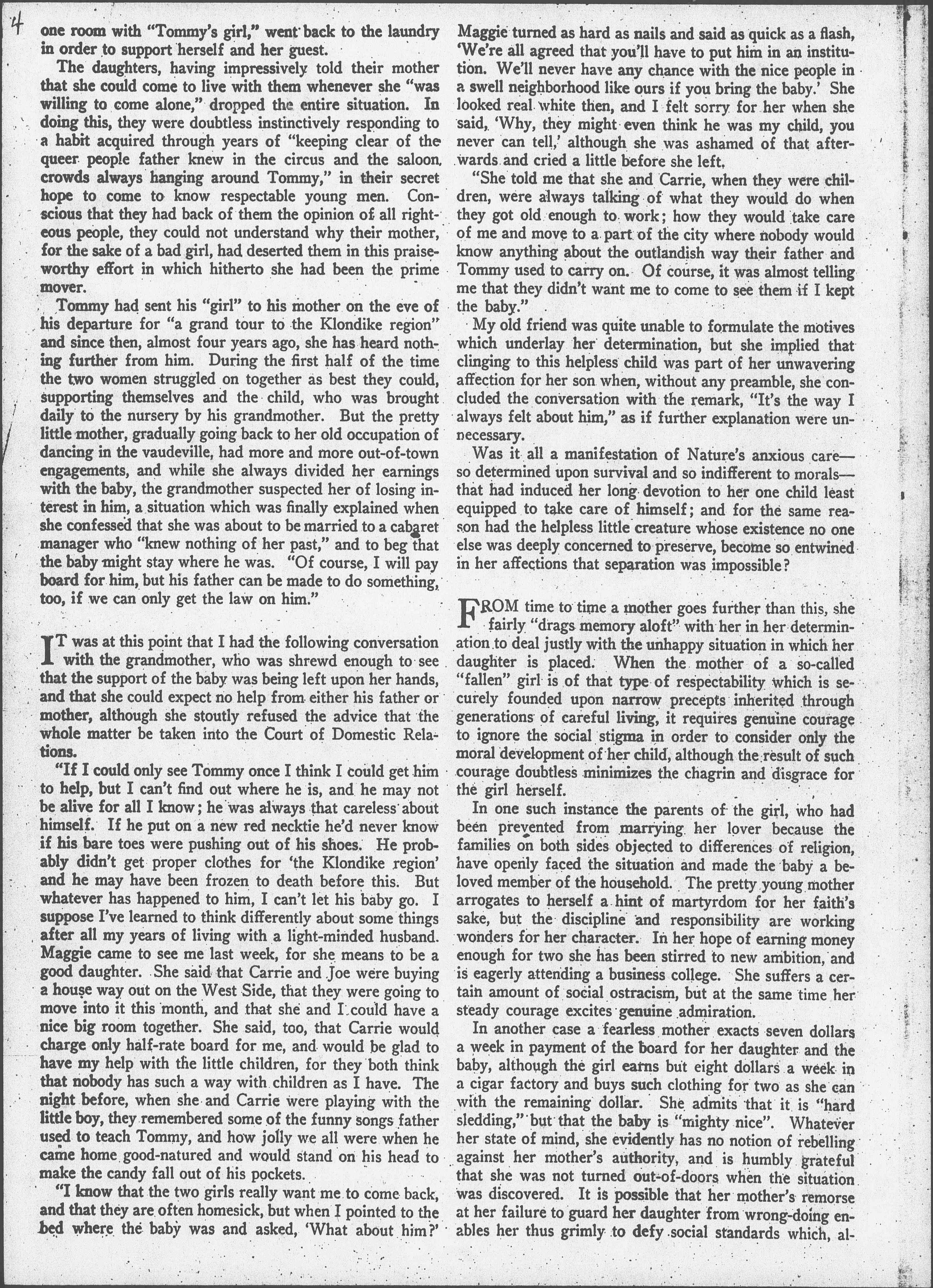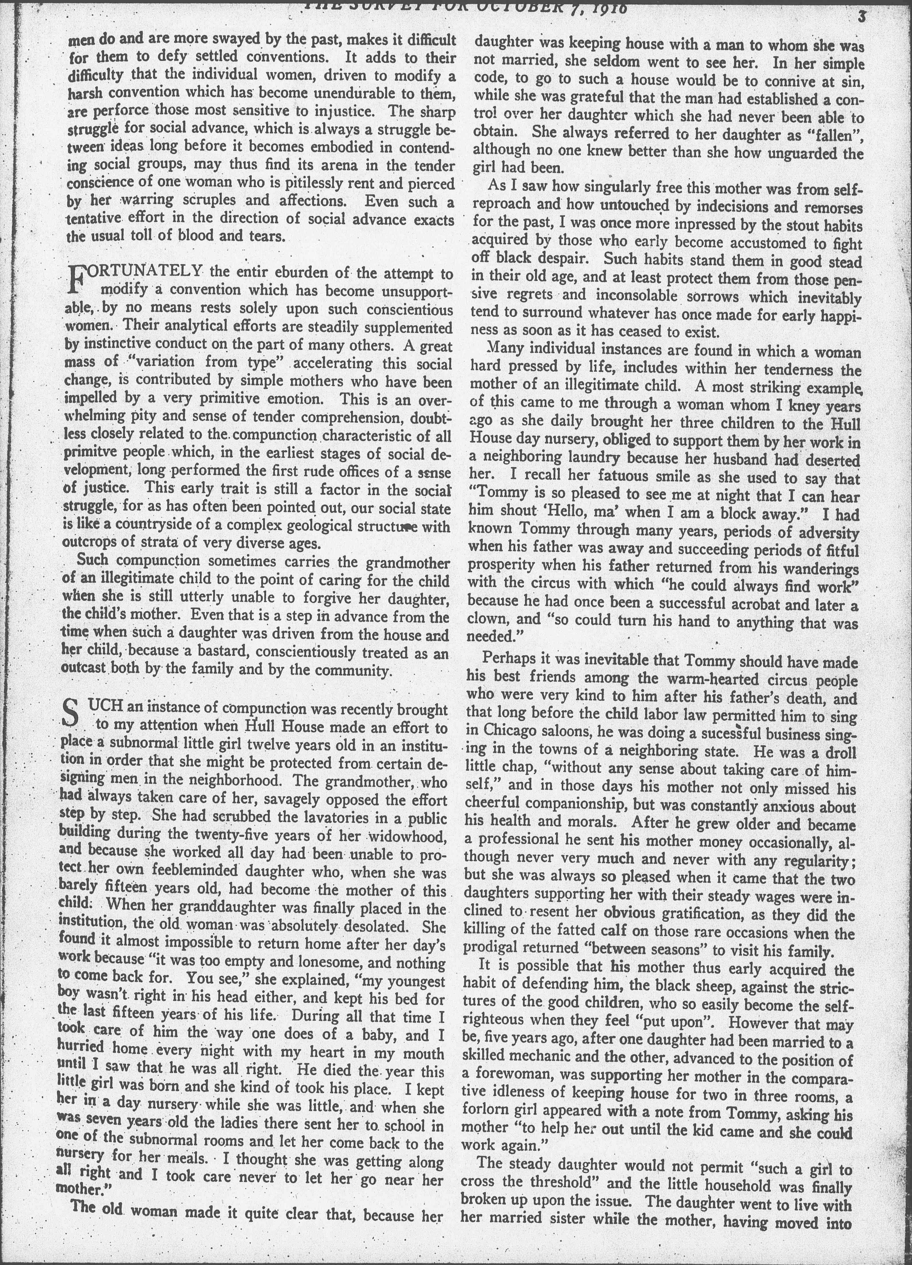 Many individual instances are found in which a woman hard pressed by life, includes within her tenderness the mother of an illegitimate child. A most striking example of this came to me through a woman whom I [knew] years ago as she daily brought her three children to the Hull House day nursery, obliged to support them by her work in a neighboring laundry because her husband had deserted her. I recall her fatuous smile as she used to say that "Tommy is so pleased to see me at night that I can hear him shout 'Hello, ma' when I am a block away." I had known Tommy through many years, periods of adversity when his father was away and succeeding periods of fitful prosperity when his father returned from his wanderings with the circus with which "he could always find work" because he had once been a successful acrobat and later a clown, and "so could turn his hand to anything that was needed."