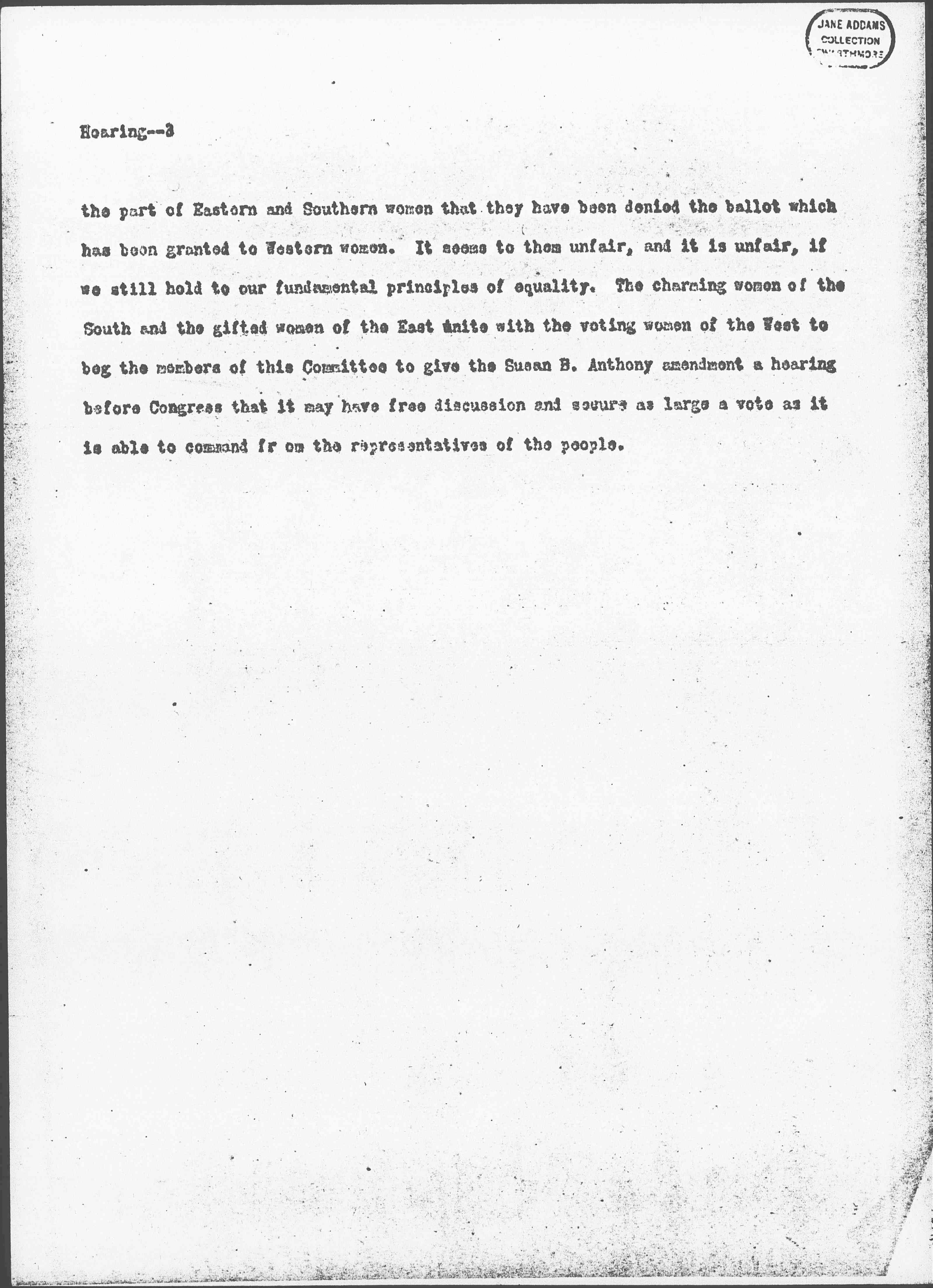 We beg of you not to let a doctrinaire matter stand in the way nor prevent you from doing this great justice to women. We often find resentment on [page 3] the part of Eastern and Southern women that they have been denied the ballot which has been granted to Western women. It seems to them unfair, and it is unfair, if we still hold to our fundamental principles of equality. The charming women of the South and the gifted women of the East unite with the voting women of the West to beg the members of this Committee to give the Susan B. Anthony amendment a hearing before Congress that it may have free discussion and secure as large a vote as it is able to command from the representatives of the people.