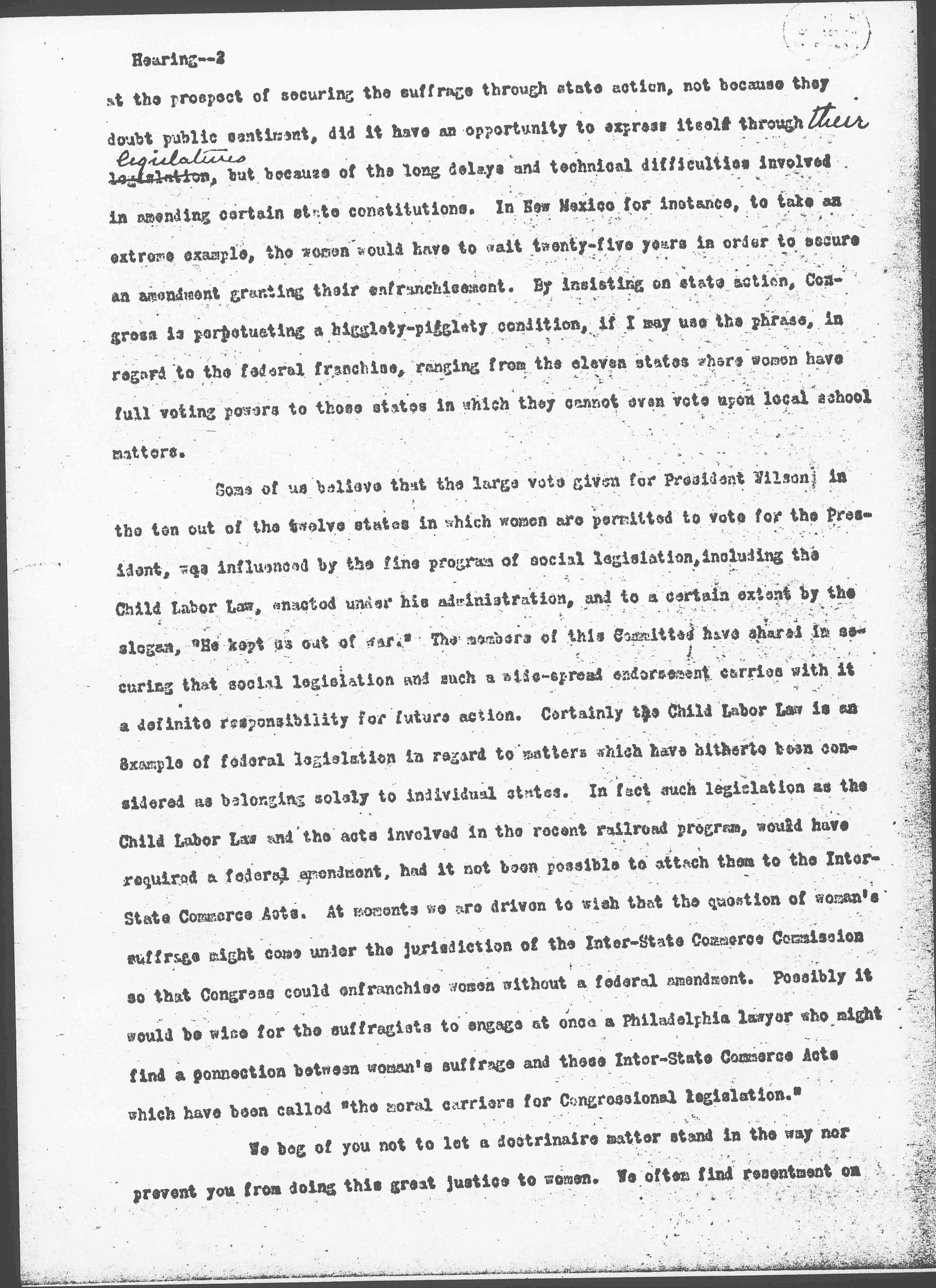 Moreover, the states themselves, owing to their varied constitutions, are not given equal rights on the subject and many women are necessarily discouraged [page 2] at the prospect of securing the suffrage through state action, not because they doubt public sentiment, did it have an opportunity to express itself through <their> legislation <legislatures>, but because of the long delays and technical difficulties involved in amending certain state constitutions. In New Mexico for instance, to take an extreme example, the women would have to wait twenty-five years in order to secure an amendment granting their enfranchisement. By insisting on state action, Congress is perpetuating a [higgledy-piggledy] condition, if I may use the phrase, in regard to the federal franchise, ranging from the eleven states where women have full voting powers to those states in which they cannot even vote upon local school matters.