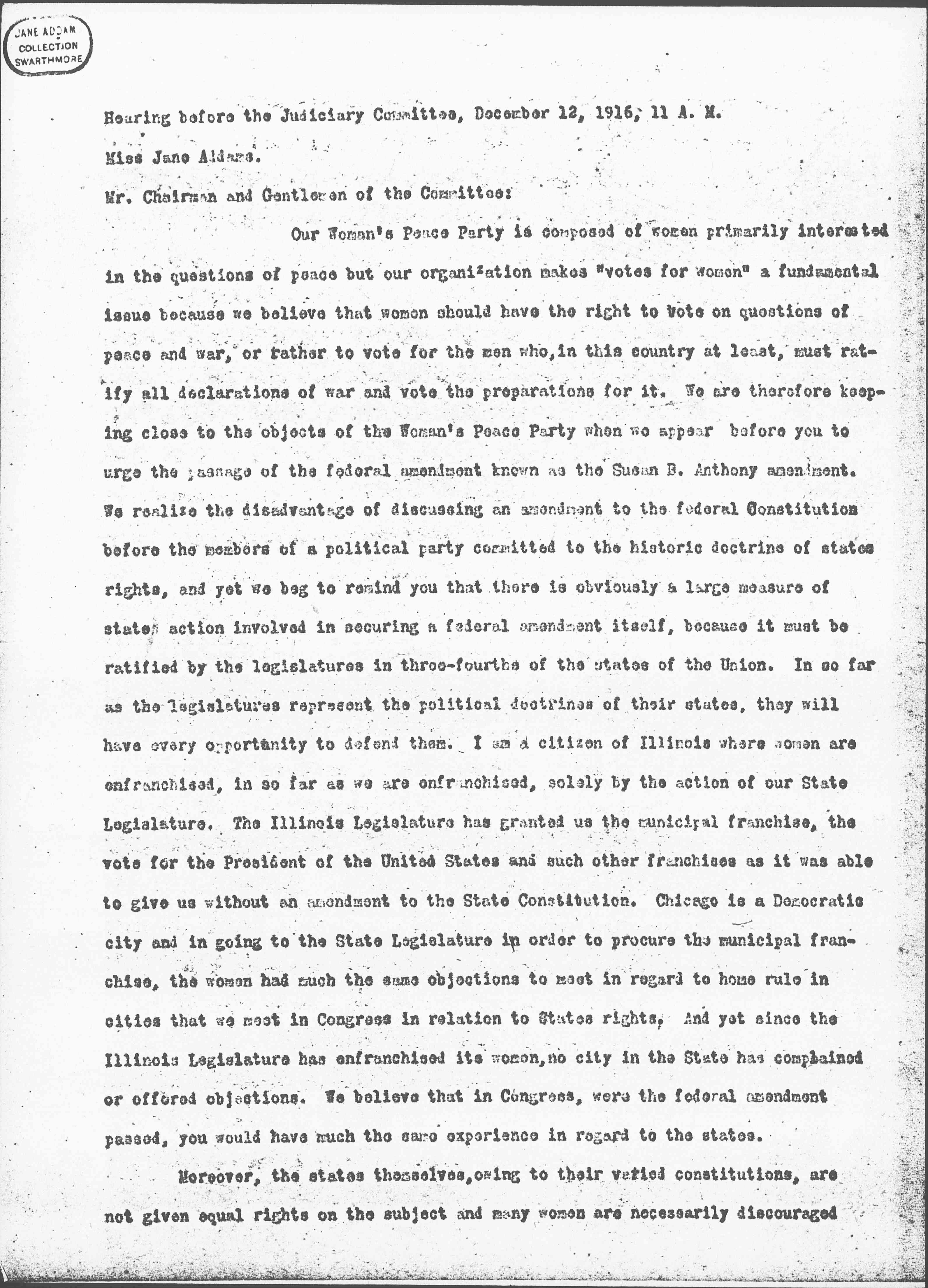Our Woman's Peace Party is composed of women primarily interested in the questions of peace but our organization makes "votes for women" a fundamental issue because we believe that women should have the right to vote on questions of peace and war, or rather to vote for the men who, in this country at least, must ratify all declarations of war and vote the preparations for it. We are therefore keeping close to the objects of the Woman's Peace Party when we appear before you to urge the passage of the federal amendment known as the Susan B. Anthony amendment. We realize the disadvantage of discussing an amendment to the federal Constitution before the members of a political party committed to the historic doctrine of states rights, and yet we beg to remind you that there is obviously a large measure of state action involved in securing a federal amendment itself, because it must be ratified by the legislatures in three-fourths of the states of the Union. In so far as the legislatures represent the political doctrines of their states, they will have every opportunity to defend them. I am a citizen of Illinois where women are enfranchised, in so far as we are enfranchised, solely by the action of our State Legislature. The Illinois Legislature has granted us the municipal franchise, the vote for the President of the United States and such other franchises as it was able to give us without an amendment to the State Constitution. Chicago is a Democratic city and in going to the State Legislature in order to procure the municipal franchise, the women had much the same objections to meet in regard to home rule in cities that we meet in Congress in relation to States rights. And yet since the Illinois Legislature has enfranchised its women, no city in the State has complained or offered objections. We believe that in Congress, were the federal amendment passed, you would have much the same experience in regard to the states.