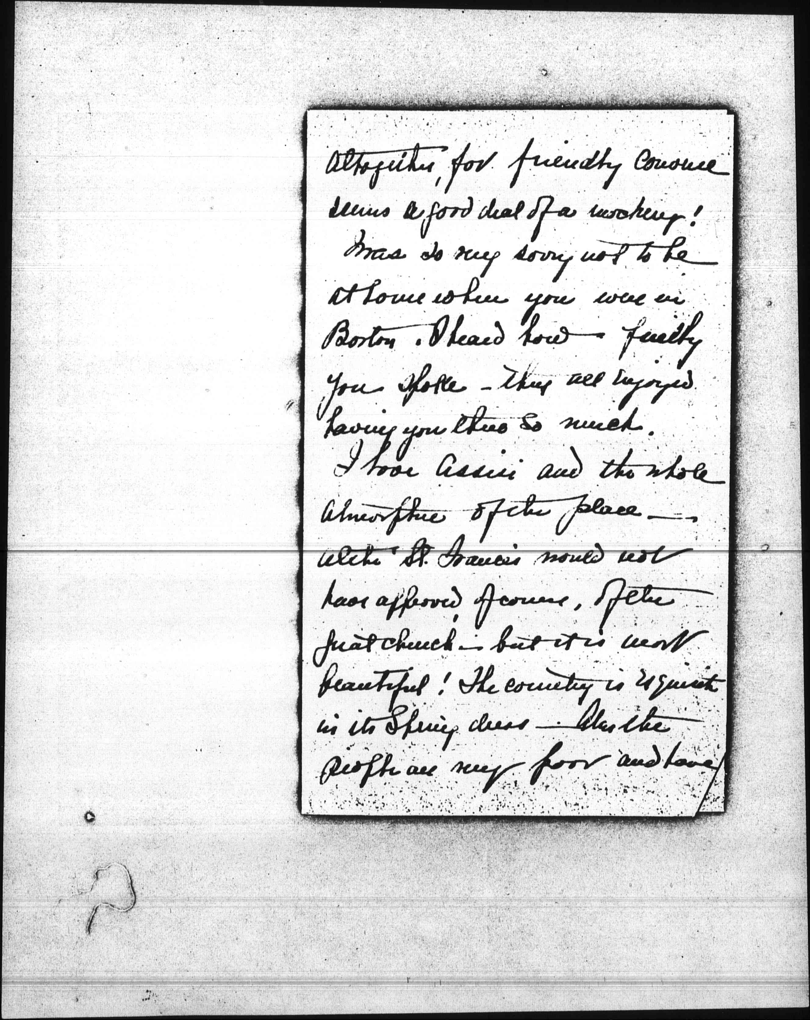 I love Assisi and the whole atmosphere of the place--[although] St Francis would not have approved of course, of the great church--but it is most beautiful! The country is exquisite in its Spring dress-- Alas the people are very poor and have [page 4] very little work and one must give to the beggars [though] it does not help very much!