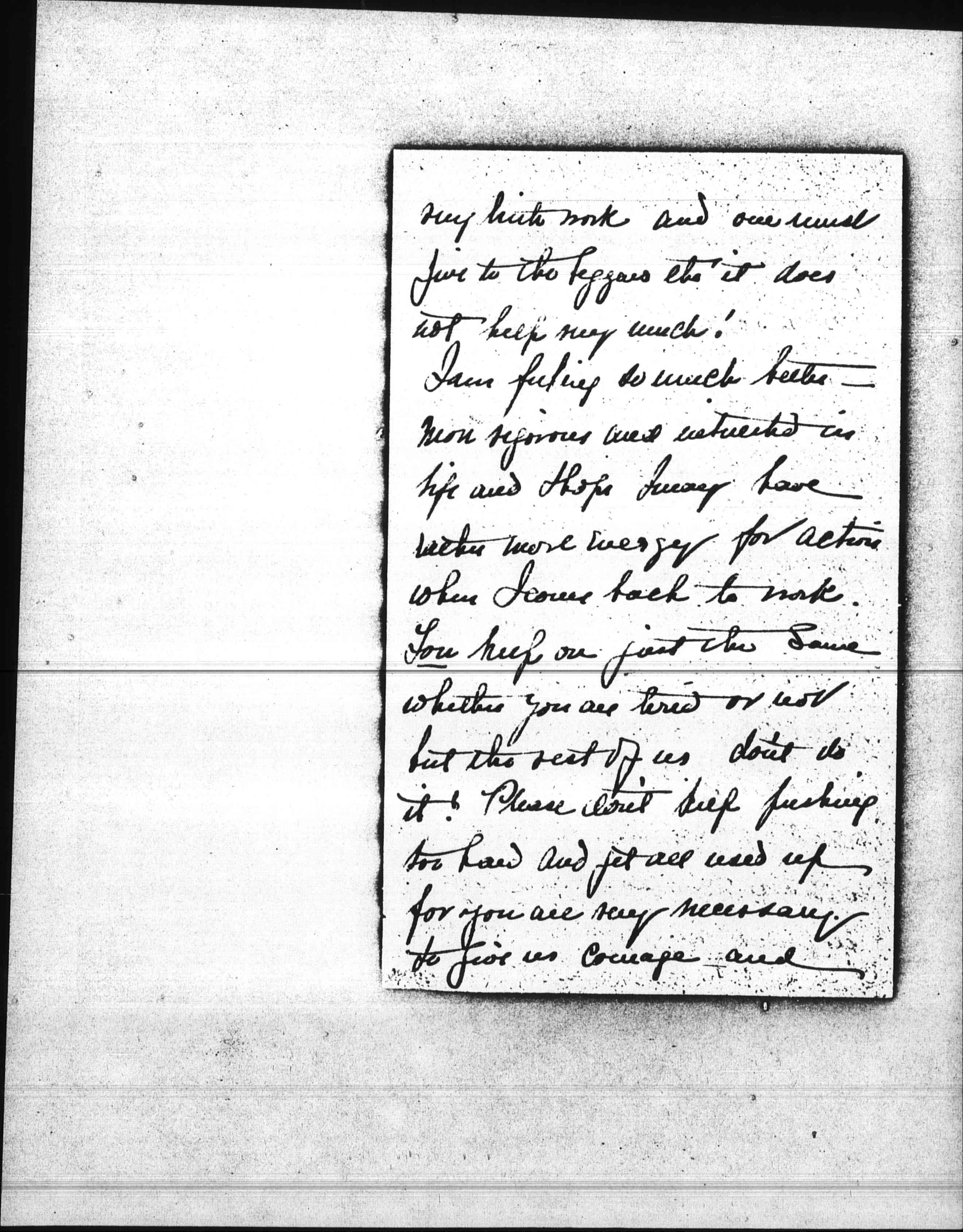 I am feeling so much better--more vigorous and interested in life and I hope I may have rather more energy for action when I come back to work. You keep on just the same whether you are tired or not but the rest of us don't do it! Please don't keep pushing too hard and get all used up for you are very necessary to give us courage and [page 5] inspiration and to keep us from falling into conventional "philanthropy"! I pray to be delivered from it!